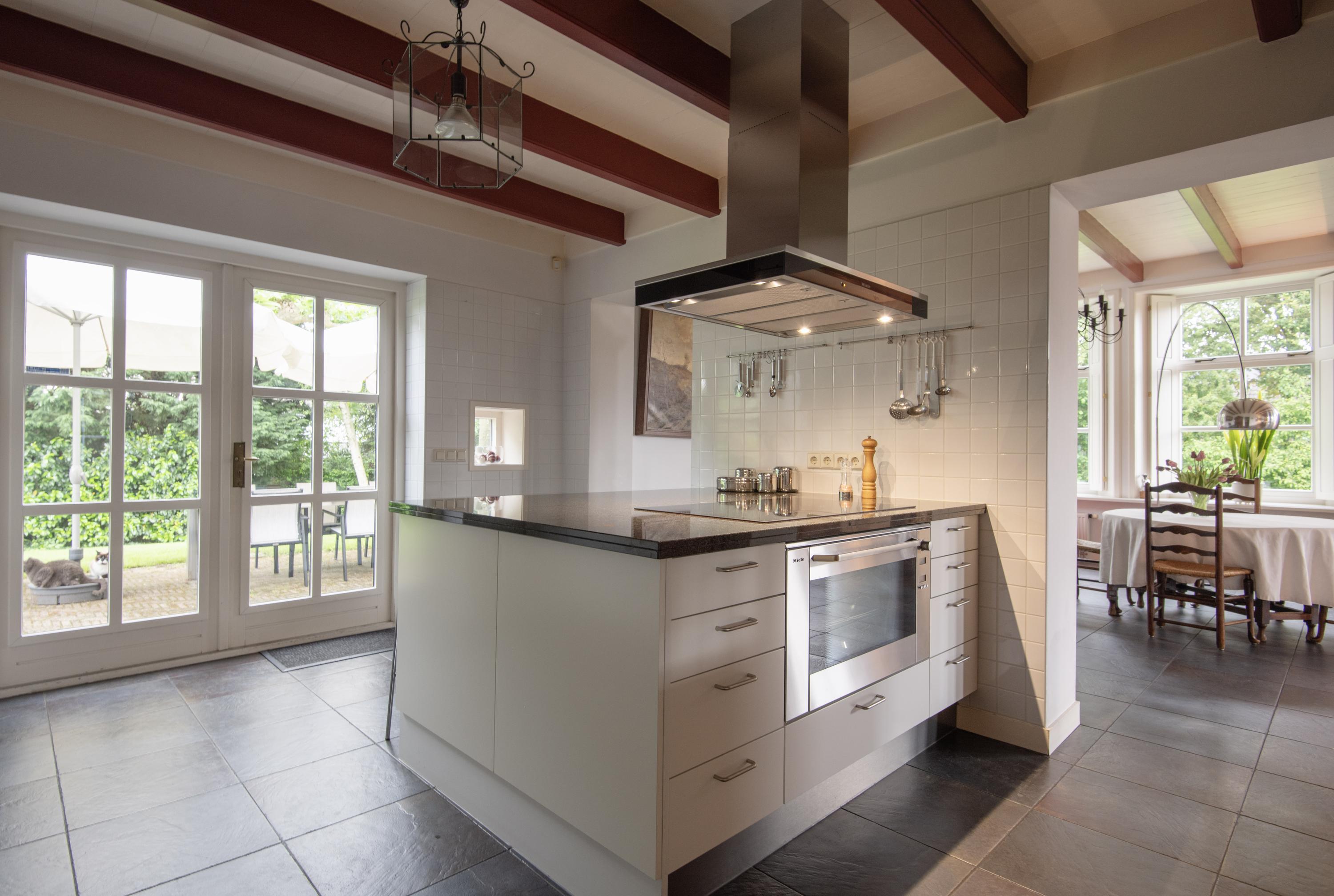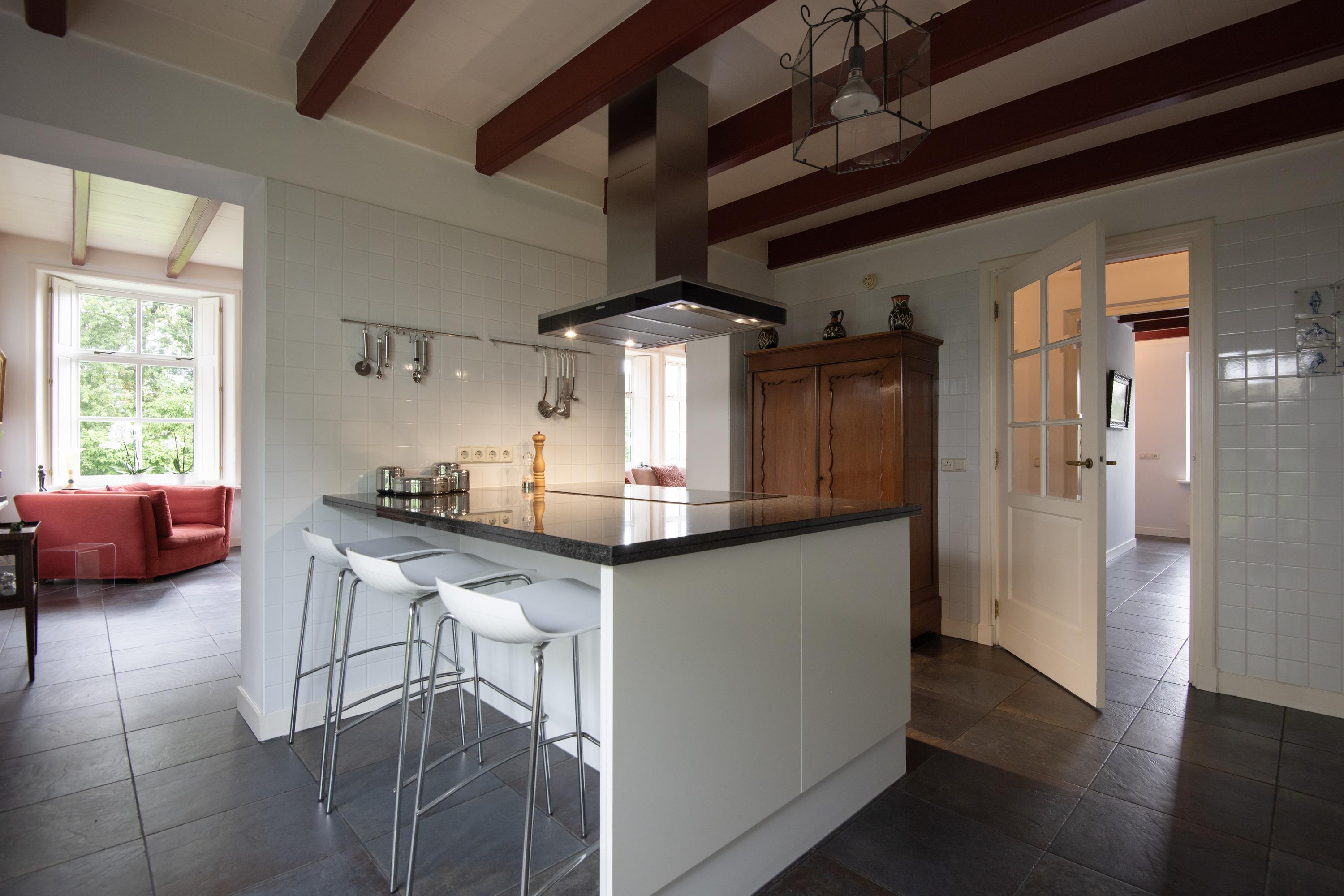 De keuken is ingericht met een luxe kookeiland met eetbar, een granieten werkblad en hoogwaardige, recent vernieuwde inbouwapparatuur.