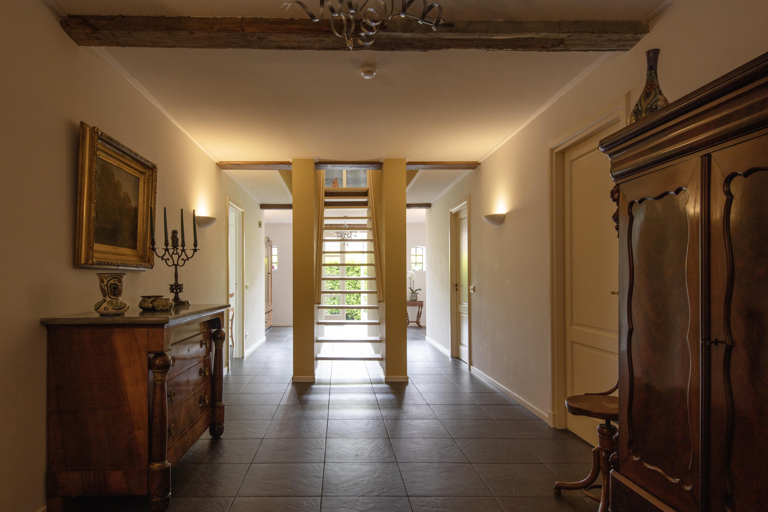 De oorspronkelijke voordeur bevindt zich centraal in het voorhuis maar deze wordt niet meer gebruikt. De dagelijkse entree is aan de opritzijde. De entree is ruim en ingericht met vaste kasten en een wc. Vanuit de aangrenzende gang is toegang tot de woonkamer. Deze zonnige ruimte met vele roederamen, geflankeerd door binnenluiken, ademt -met het bijna drie meter hoge balkenplafond- een aangename sfeer. Naast de luxe keramische vloer met vloerverwarming is er een natuurstenen schouw met een open gashaard. In de woonkamer zijn twee doorgangen die zicht bieden op de aangrenzende eetkeuken. Deze ruimte biedt via dubbele openslaande deuren toegang tot het terras op het zuiden. Drie volwassen Platanen fungeren er in de zomer als natuurlijke parasol.
