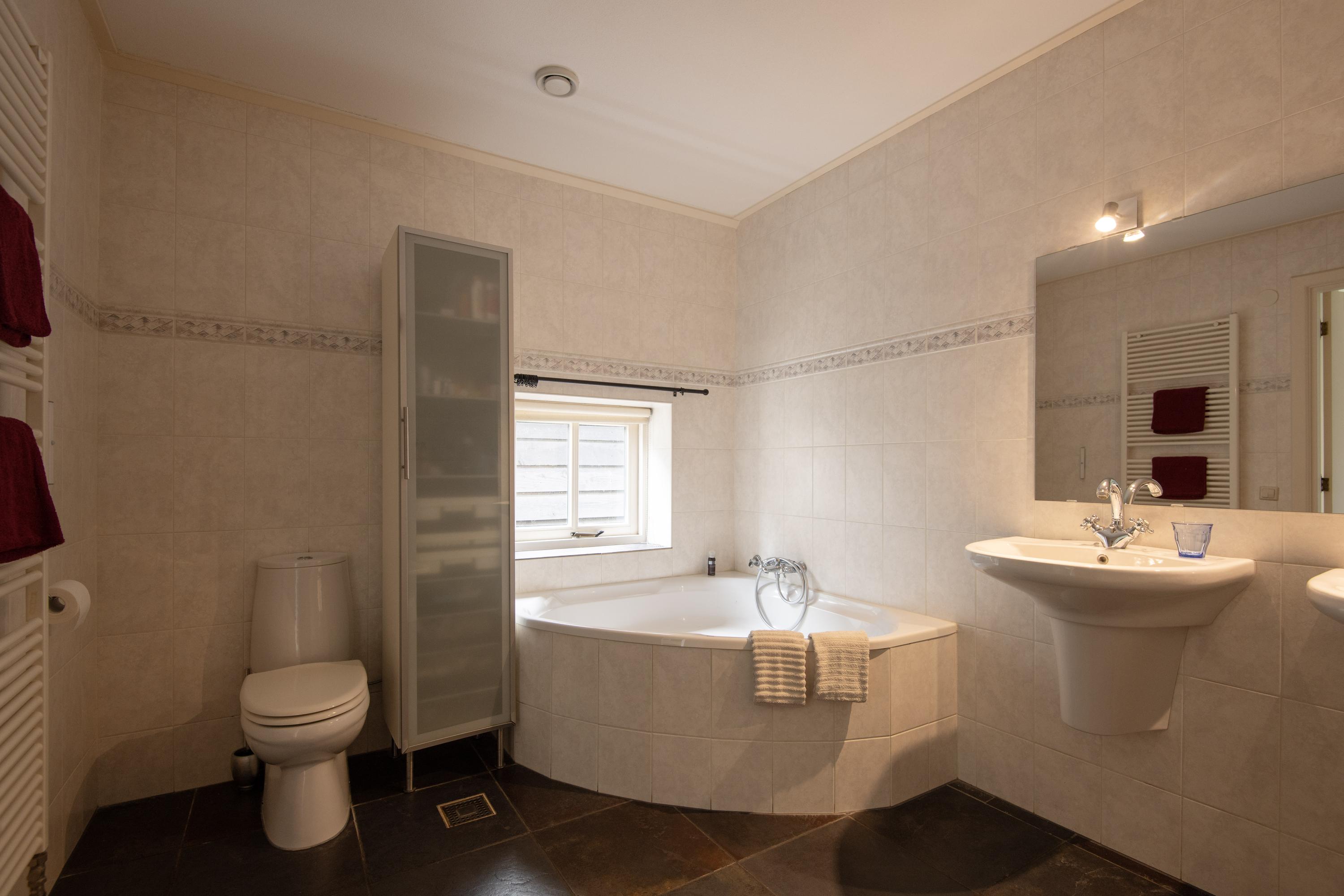 Aan de noordzijde van de gang is de ouderslaapkamer met dubbele terrasdeuren, garderobekasten en een aangrenzende badkamer. Deze badkamer is ingericht met een groot hoekbad, inloopdouche, twee wastafels, toilet en bidet. Aan de zuidzijde van de gang zijn twee slaap-/werkkamers en een bijkeuken. In het achterhuis is verder nog een 2e badkamer met douche, wastafel en de witgoedaansluitingen.