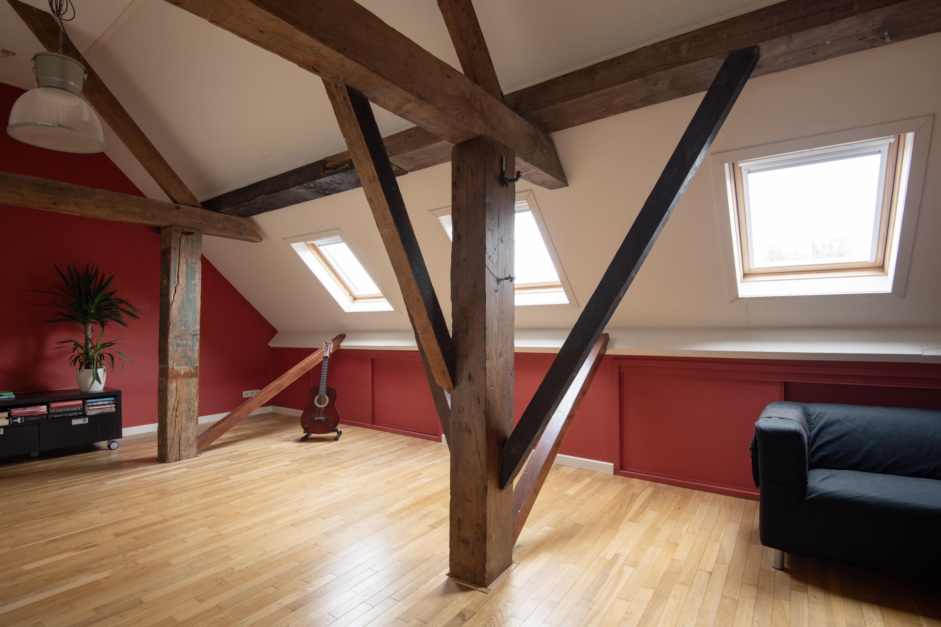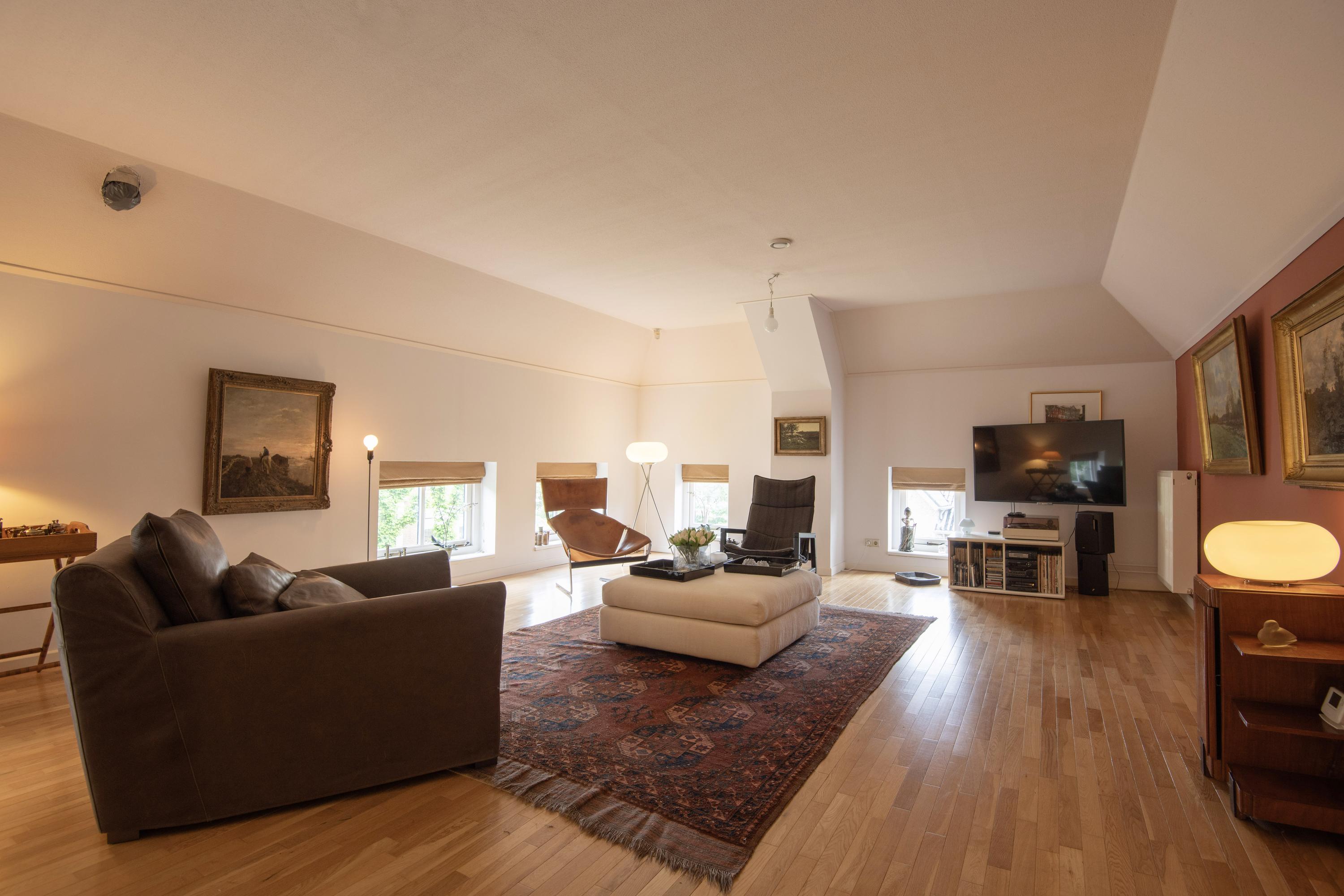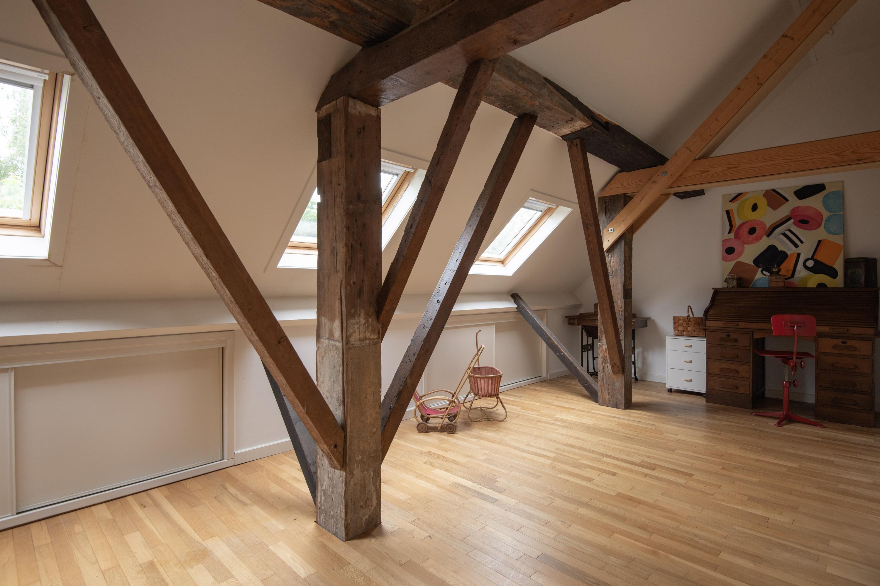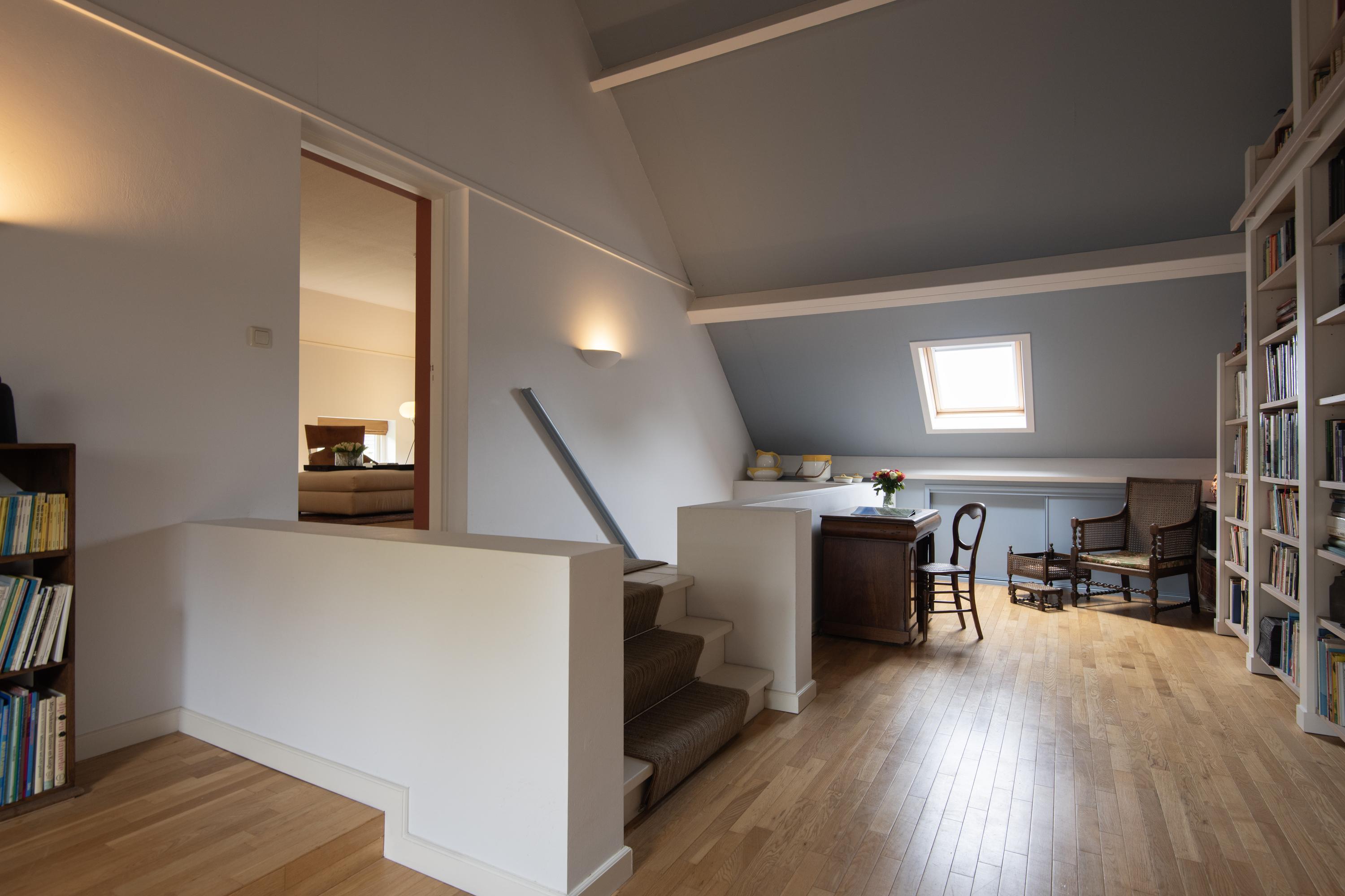 De dakvensters zorgen voor een zee aan licht. Aan de bibliotheek grenst een tweede woonkamer, atelier, tv-kamer; zomaar een paar functies die u aan die 60m2 zou kunnen toekennen. Aan de andere kant van de bibliotheek is nog een slaapkamer met aangrenzende 3e badkamer. Deze is ingericht met een grote douche, wastafel en het