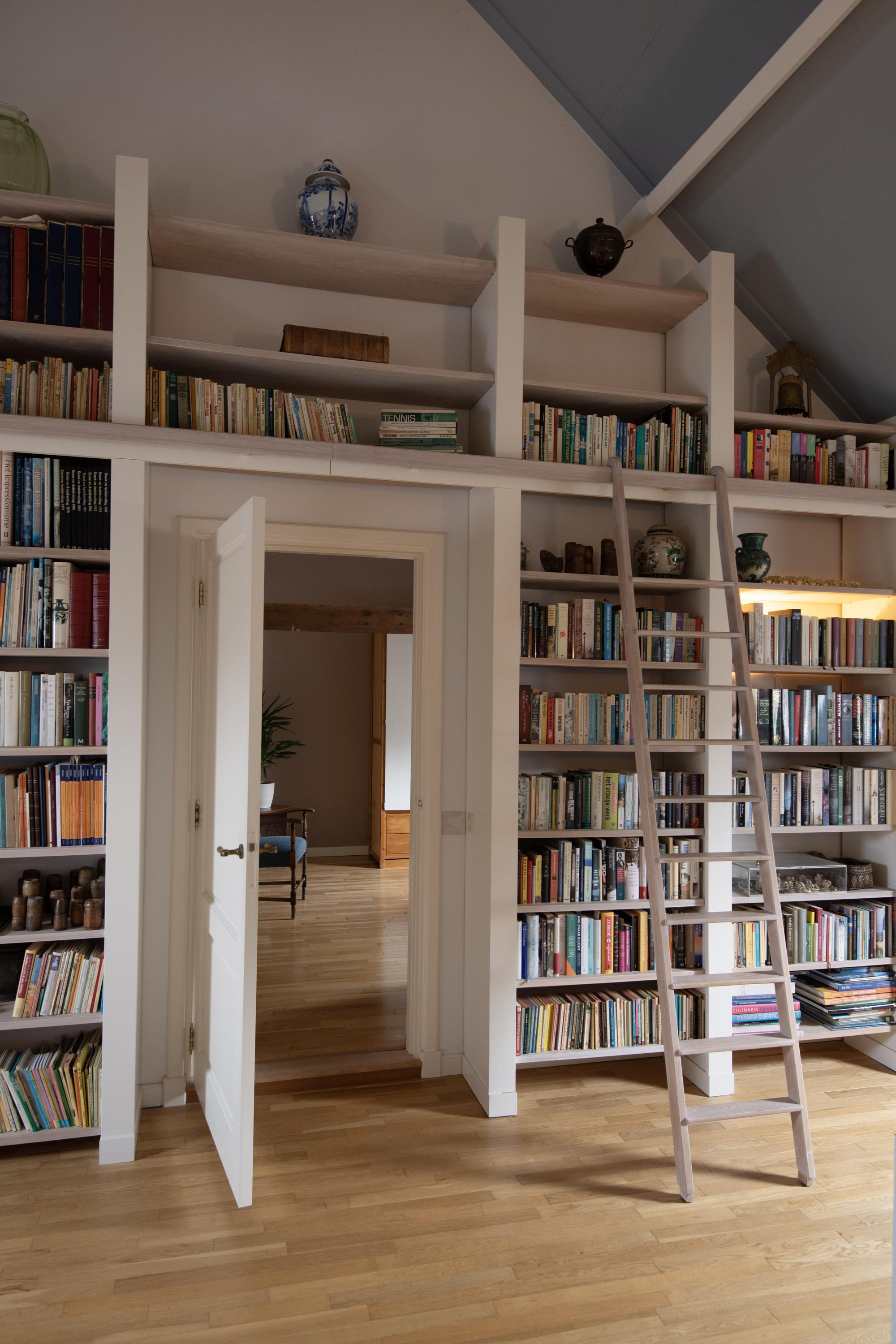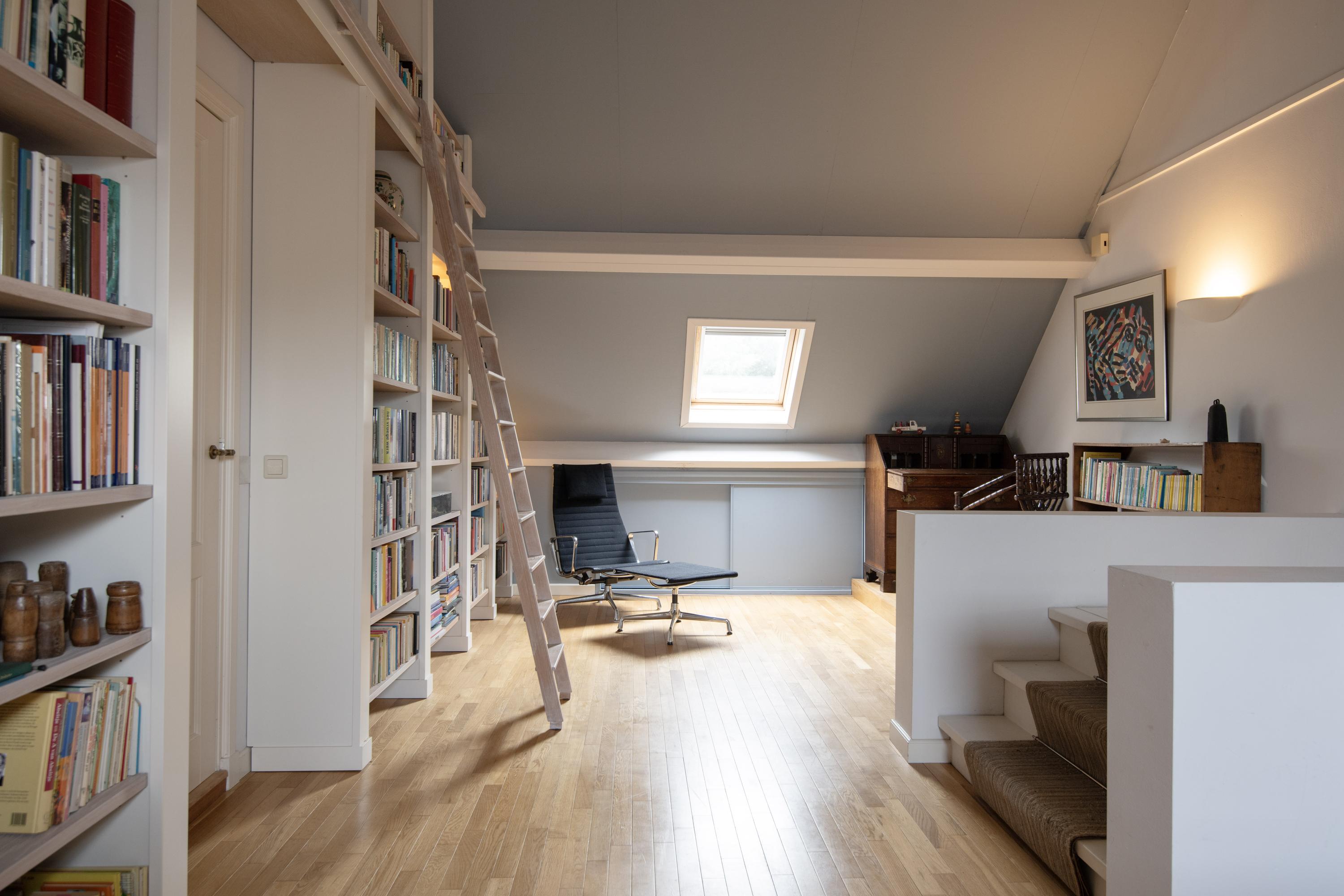 Deze verdieping kent twee opgangen. In het voorhuis komt de trap uit in een prachtige, lichte ruimte die is ingericht als bibliotheek.