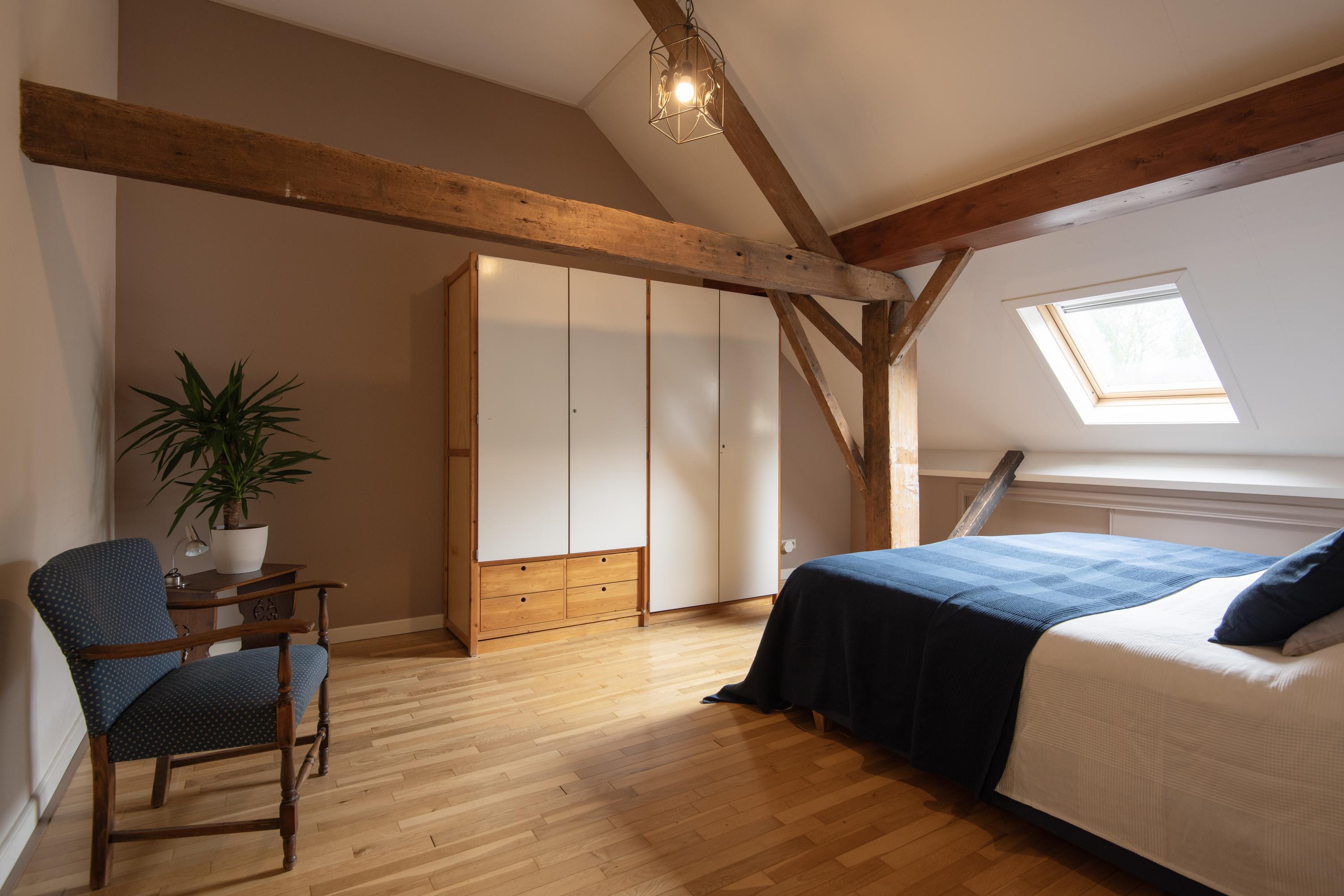 Vanuit de centrale gang in het achterhuis leidt een trap naar de verdieping. Onder de geïsoleerde kap liggen nog twee prachtige slaapkamers. Via drie dakvensters is zicht op de tuin en de omgeving. Beide kamers zijn heerlijk licht en beschikken over een zee aan bergruimte.