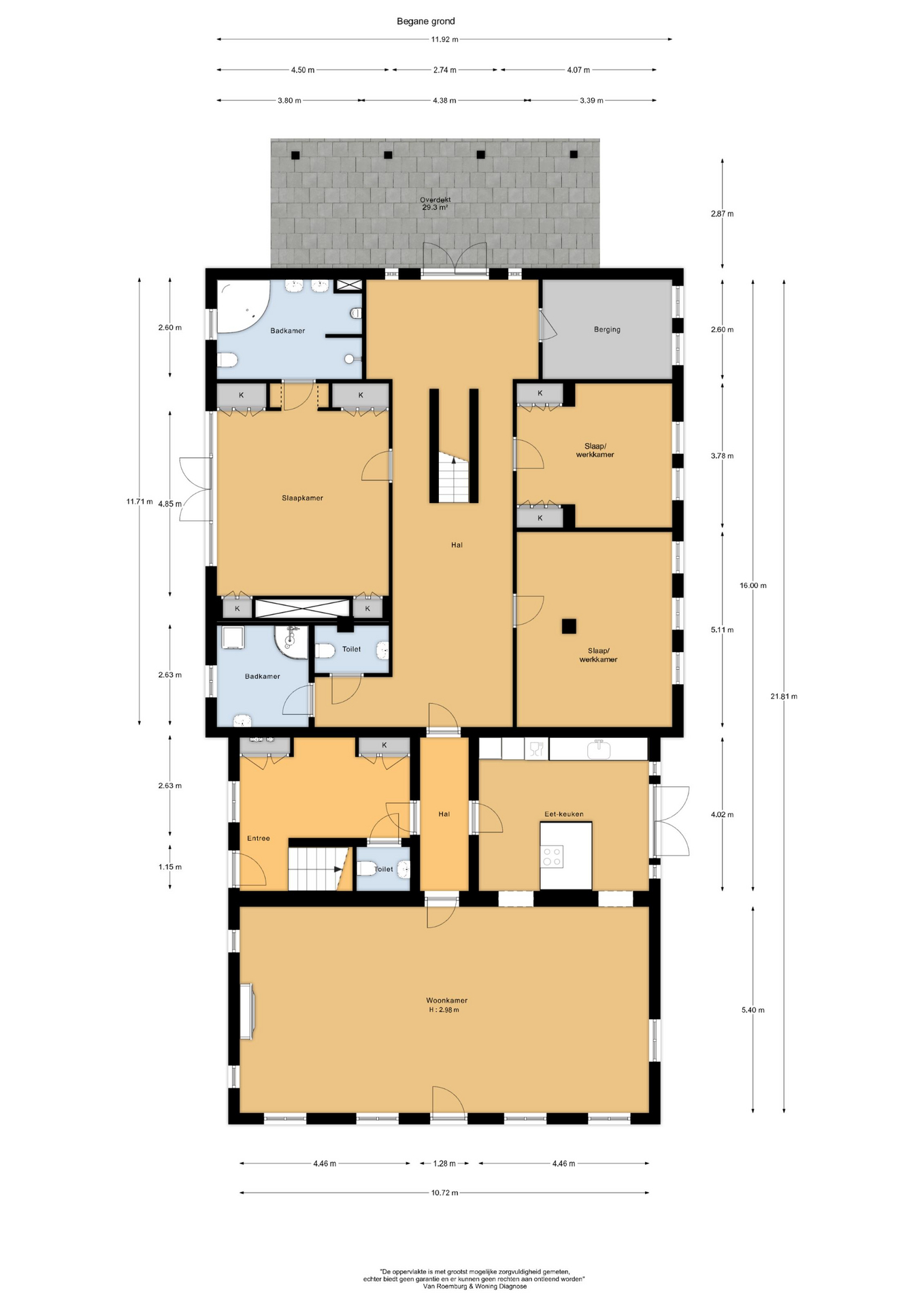 Hal, imposante tuingerichte woonkamer, eetkeuken, slaapkamer met aangrenzende badkamer, twee werk-/slaapkamers, een 2e badkamer, bijkeuken en tweede hal met toegang tot het terras onder de Gelderse overstek op de begane grond.