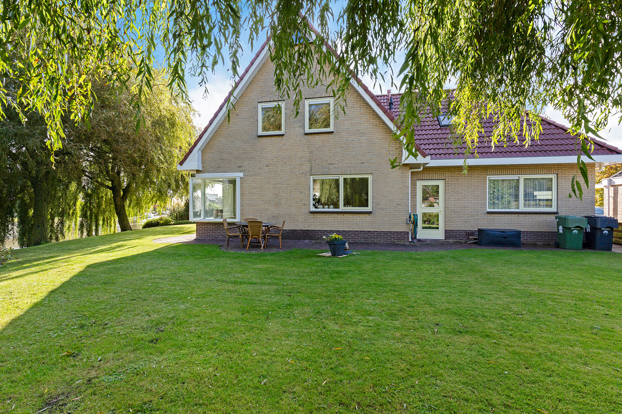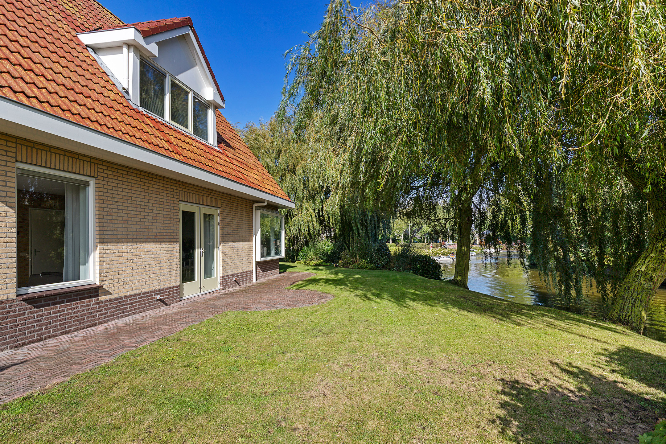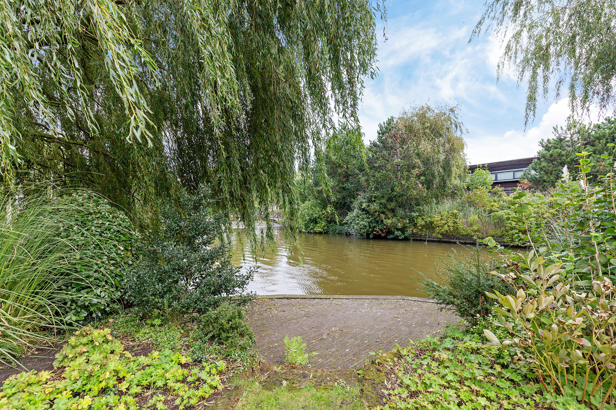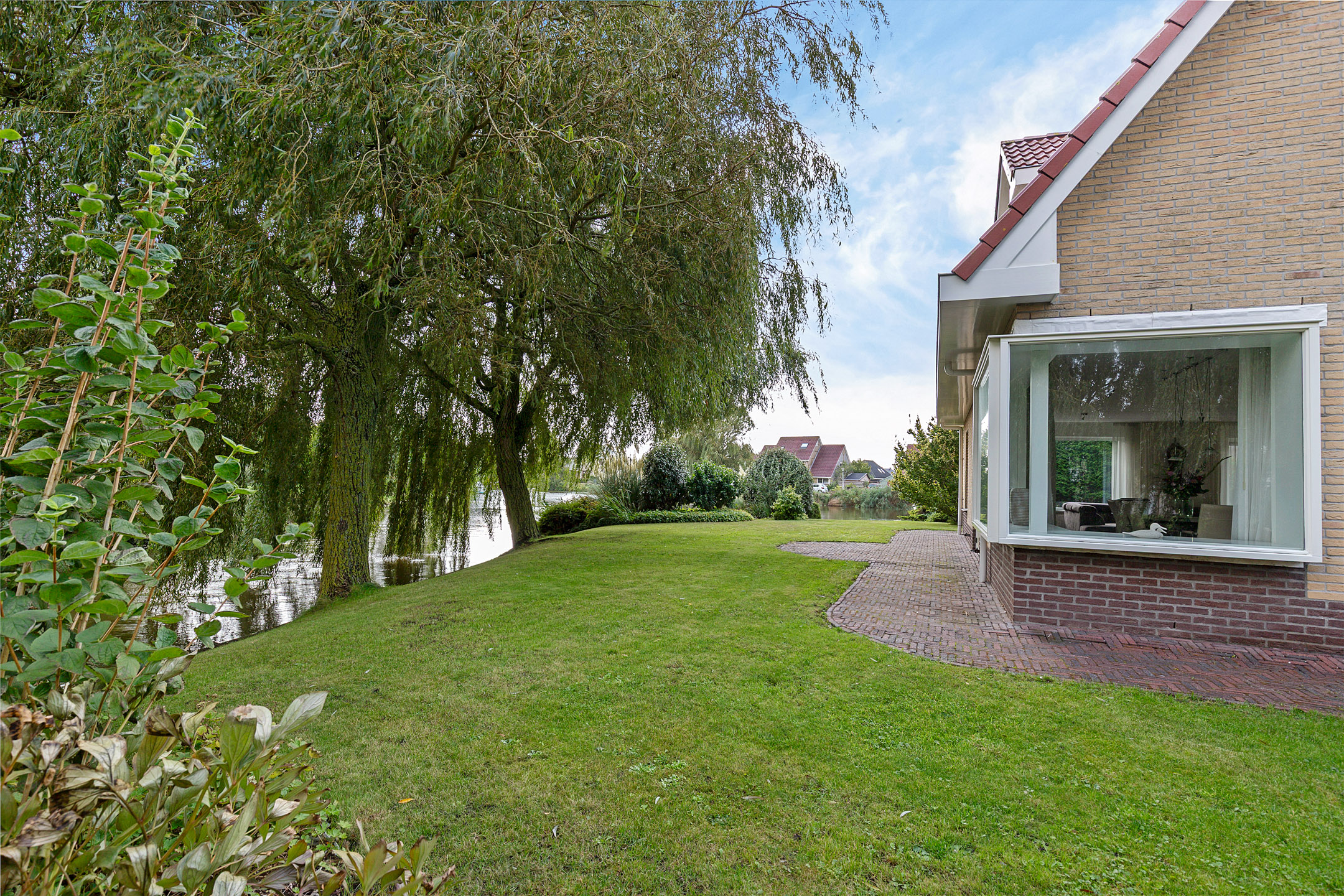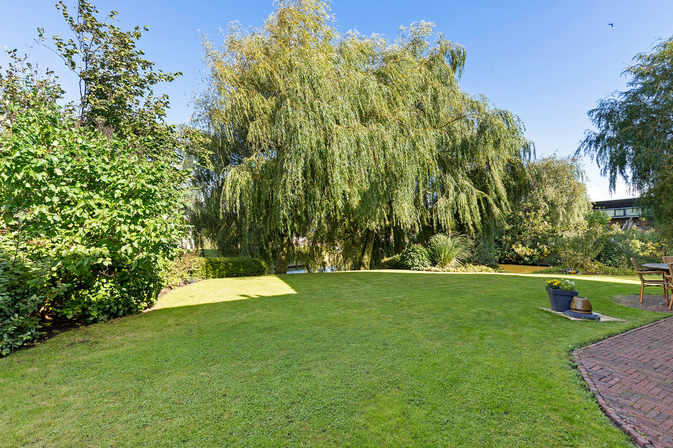 Bij het betreden van de woonkamer valt het zicht op de prachtige waterpartijen aan de groene tuin direct op. Wat een plek! Door de vele ramen aan alle kanten van de woonkamer komt er veel licht binnen. De verzorgde tuin rondom de woning heeft prachtige statige treurwilgen aan de waterkant hetgeen veel privacy biedt. Iets dat benadrukt wordt doordat de woning is gelegen op een hoekperceel aan een doodlopende straat van deze ruim opgezette wijk.