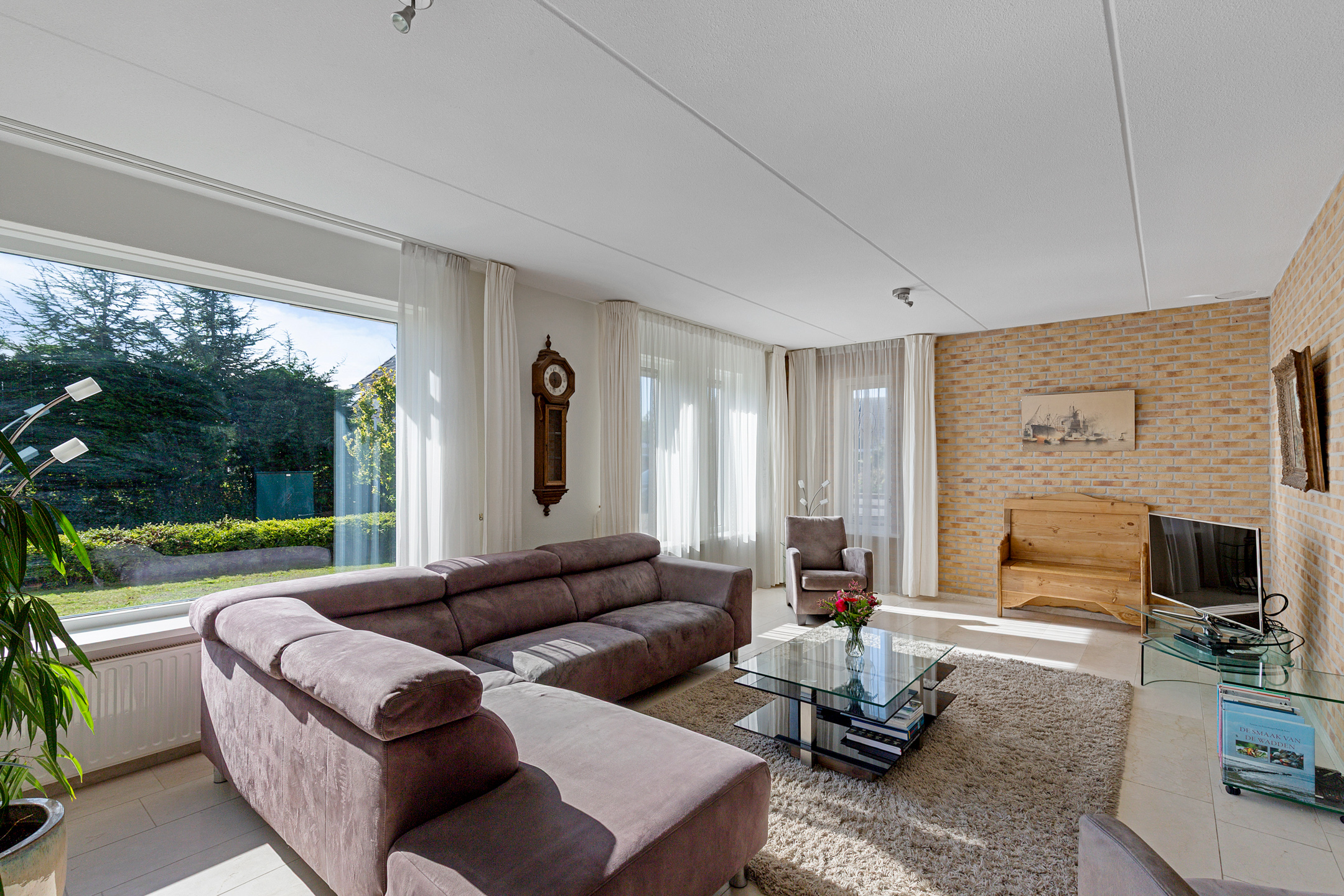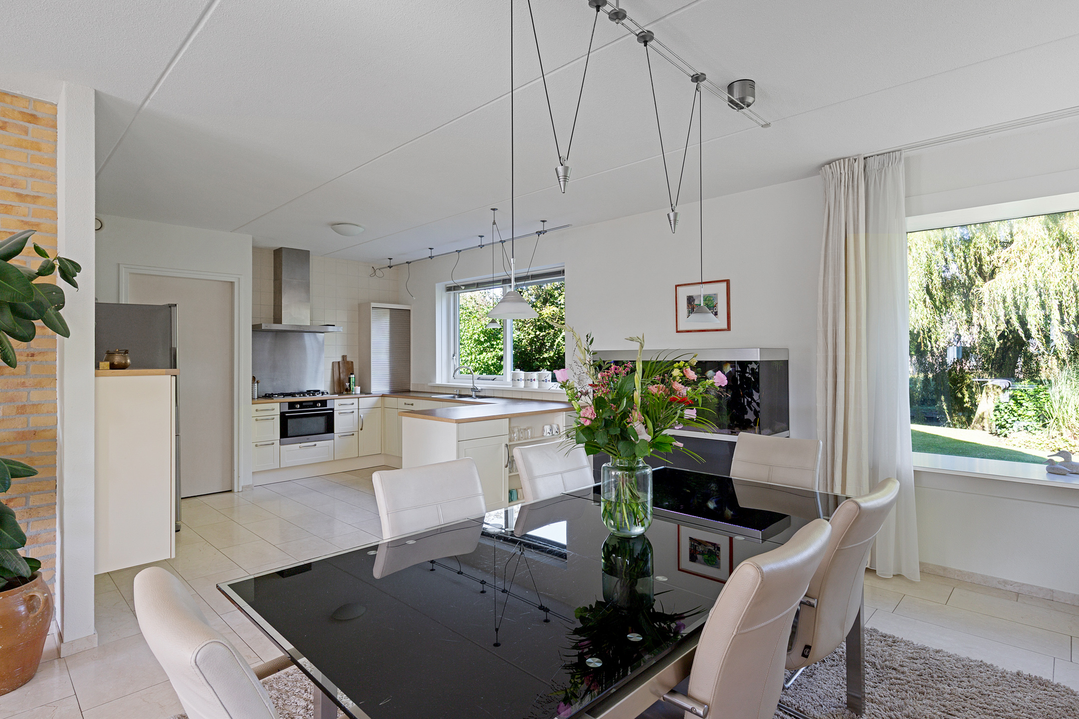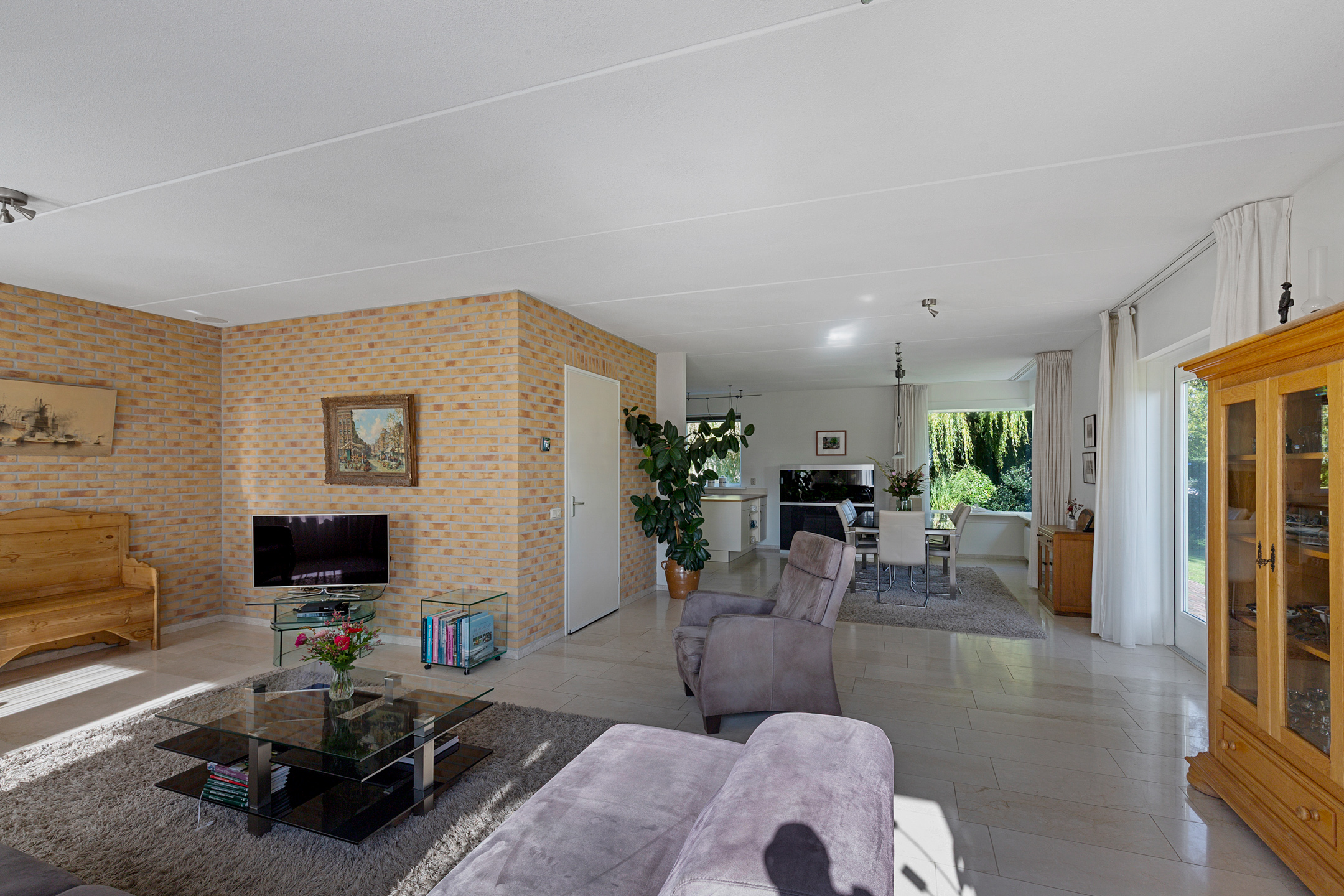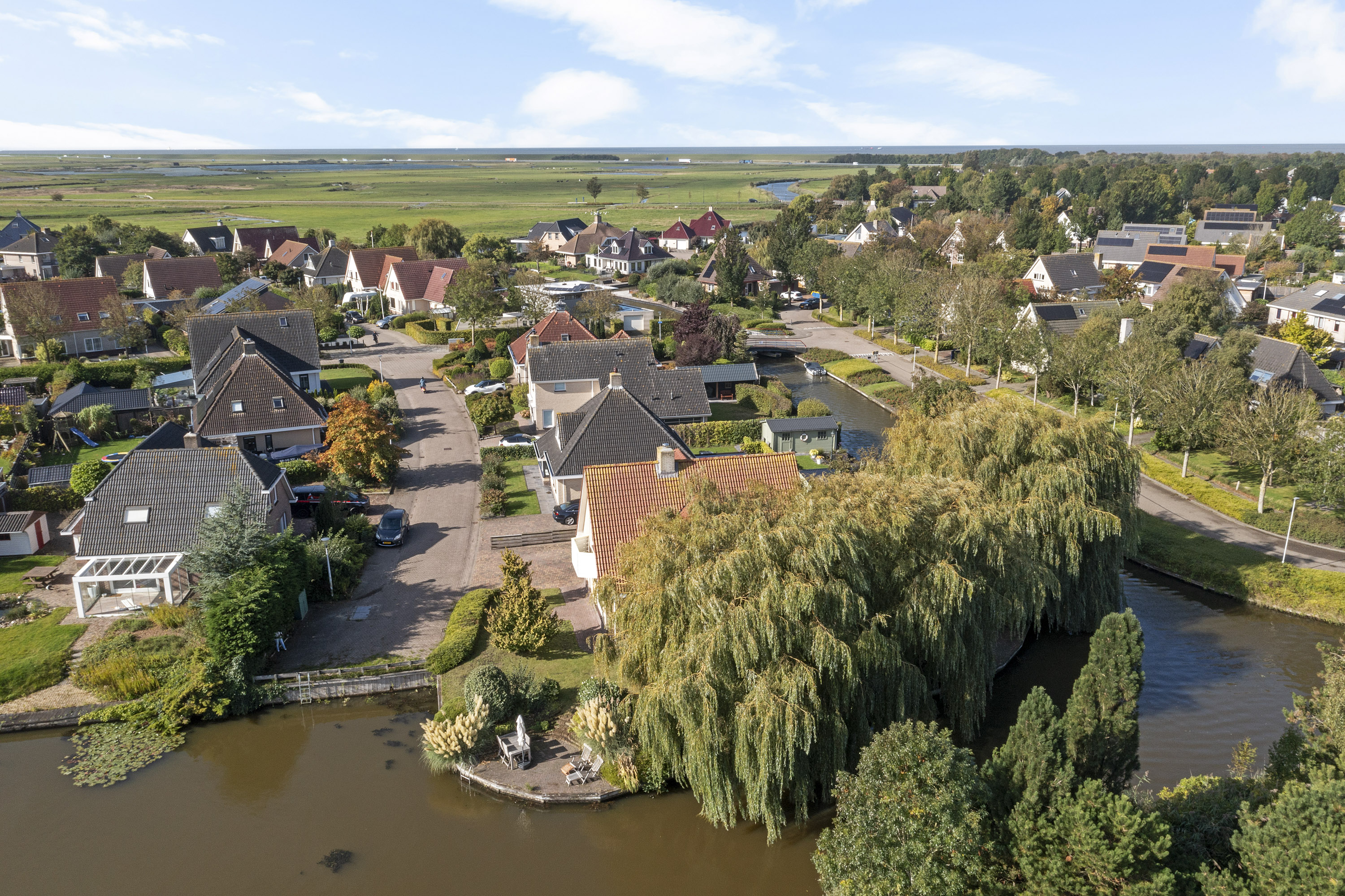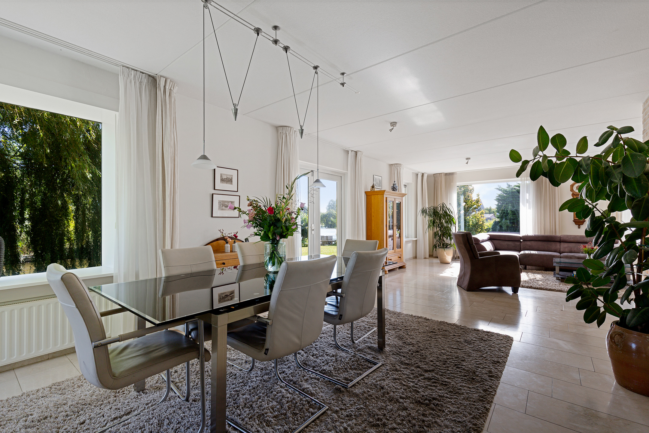Bij het betreden van de woonkamer valt het zicht op de prachtige waterpartijen aan de groene tuin direct op. Wat een plek! Door de vele ramen aan alle kanten van de woonkamer komt er veel licht binnen. De verzorgde tuin rondom de woning heeft prachtige statige treurwilgen aan de waterkant hetgeen veel privacy biedt. Iets dat benadrukt wordt doordat de woning is gelegen op een hoekperceel aan een doodlopende straat van deze ruim opgezette wijk.