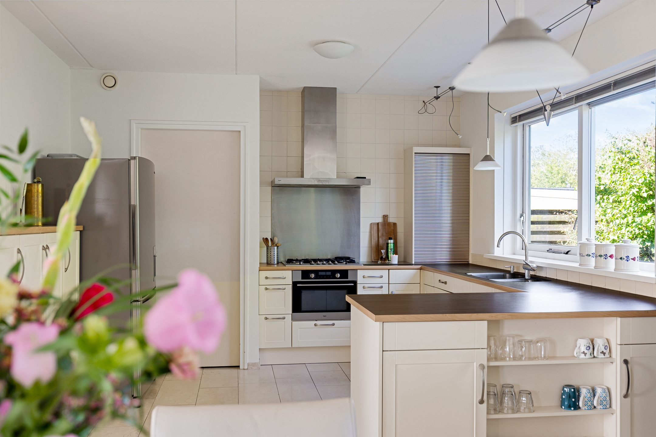 In de naastgelegen bijkeuken is genoeg ruimte voor de witgoedapparatuur. De bijkeuken heeft een deur naar de tuin en een deur naar de inpandige garage.