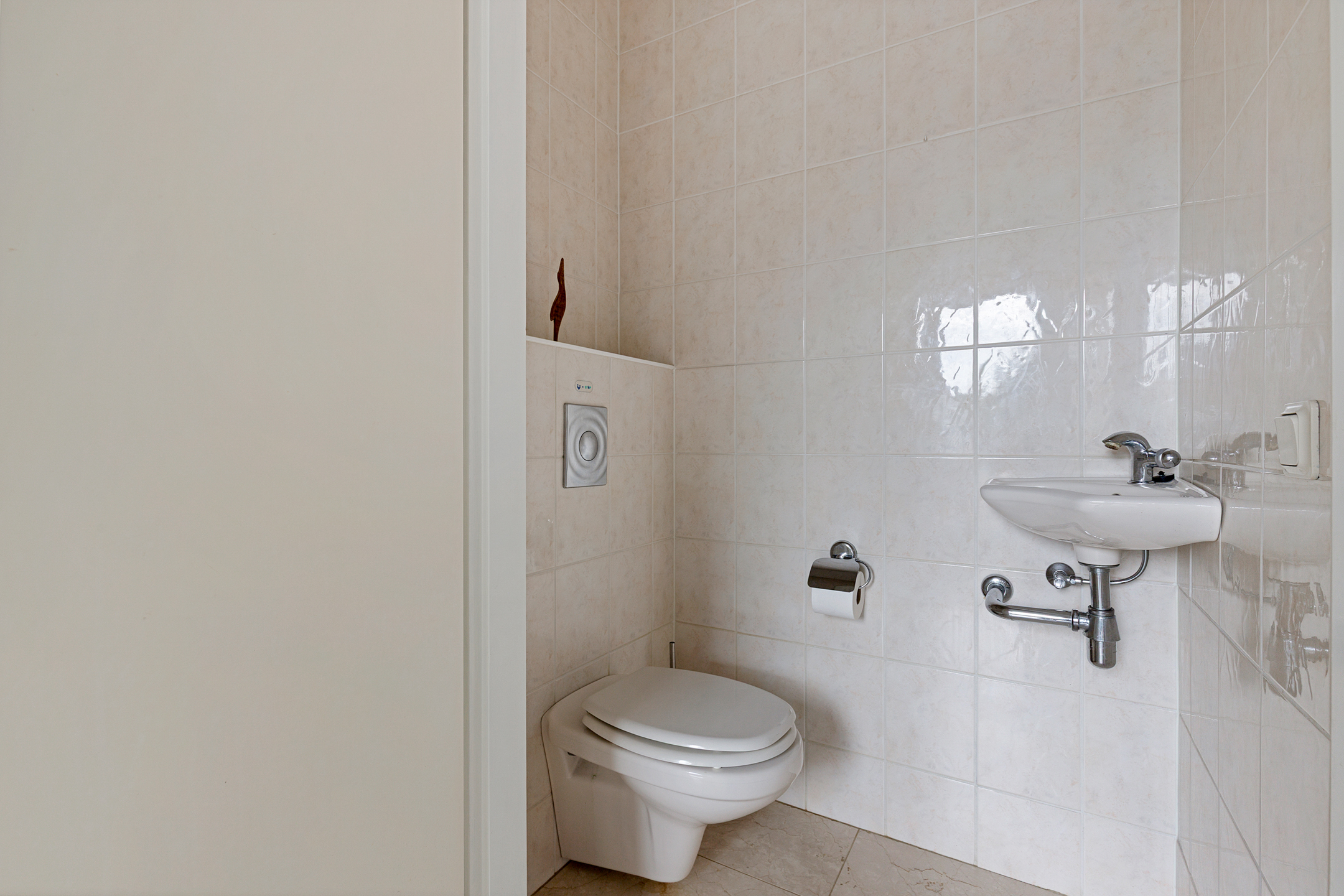 De royale hal geeft toegang naar de meterkast, het gastentoilet met hangend closet en fonteintje in neutrale kleurstelling, de trapopgang en de woonkamer met open keuken en aansluitend de bijkeuken met daarachter de toegang naar de inpandige dubbele garage.