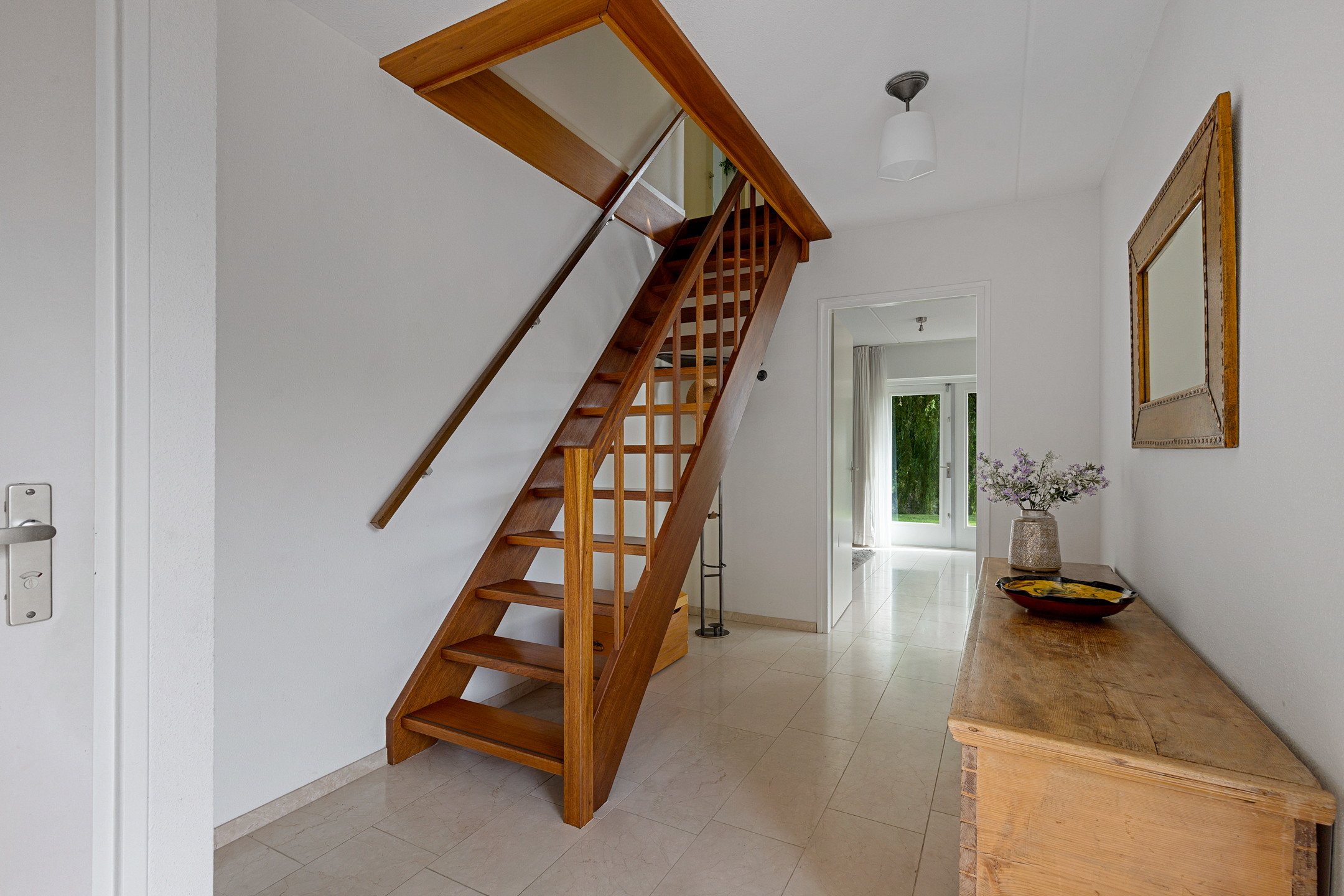 De benedenverdieping is voorzien van een neutrale natuurstenen vloer en wordt verwarmd middels vloerverwarming.