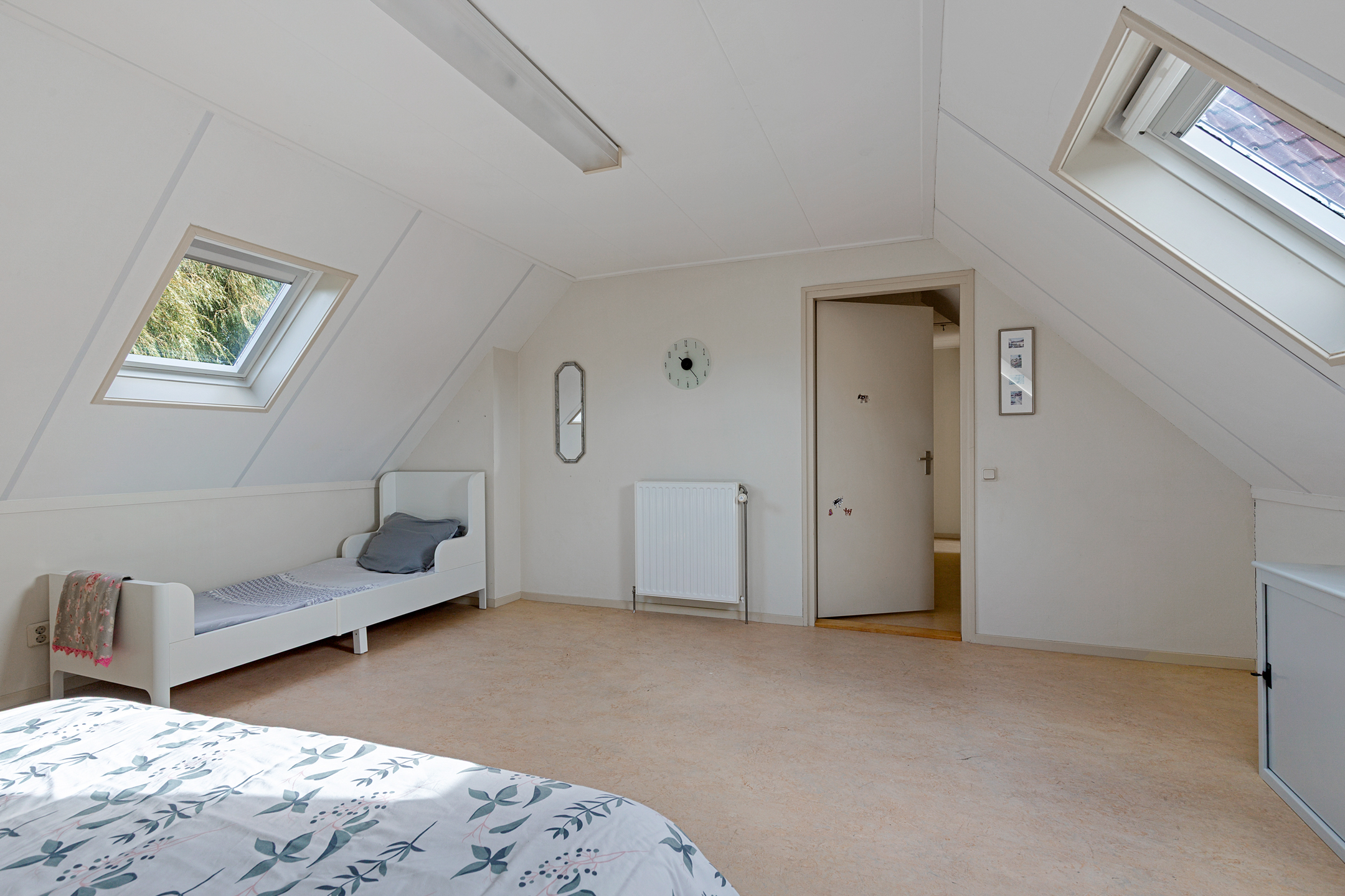 De verdieping is voorzien van een marmoleum vloer en de slaapkamers worden verwarmd met radiatoren.