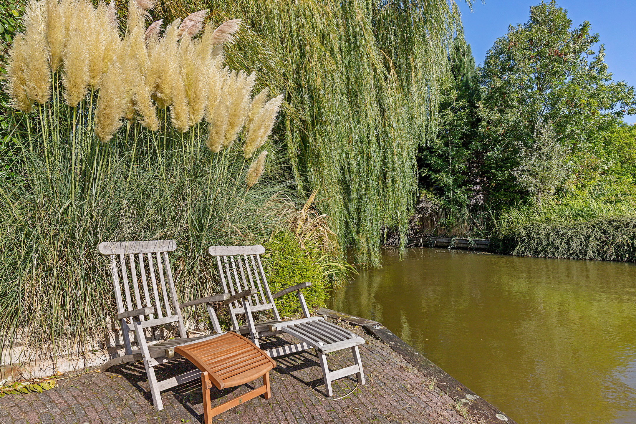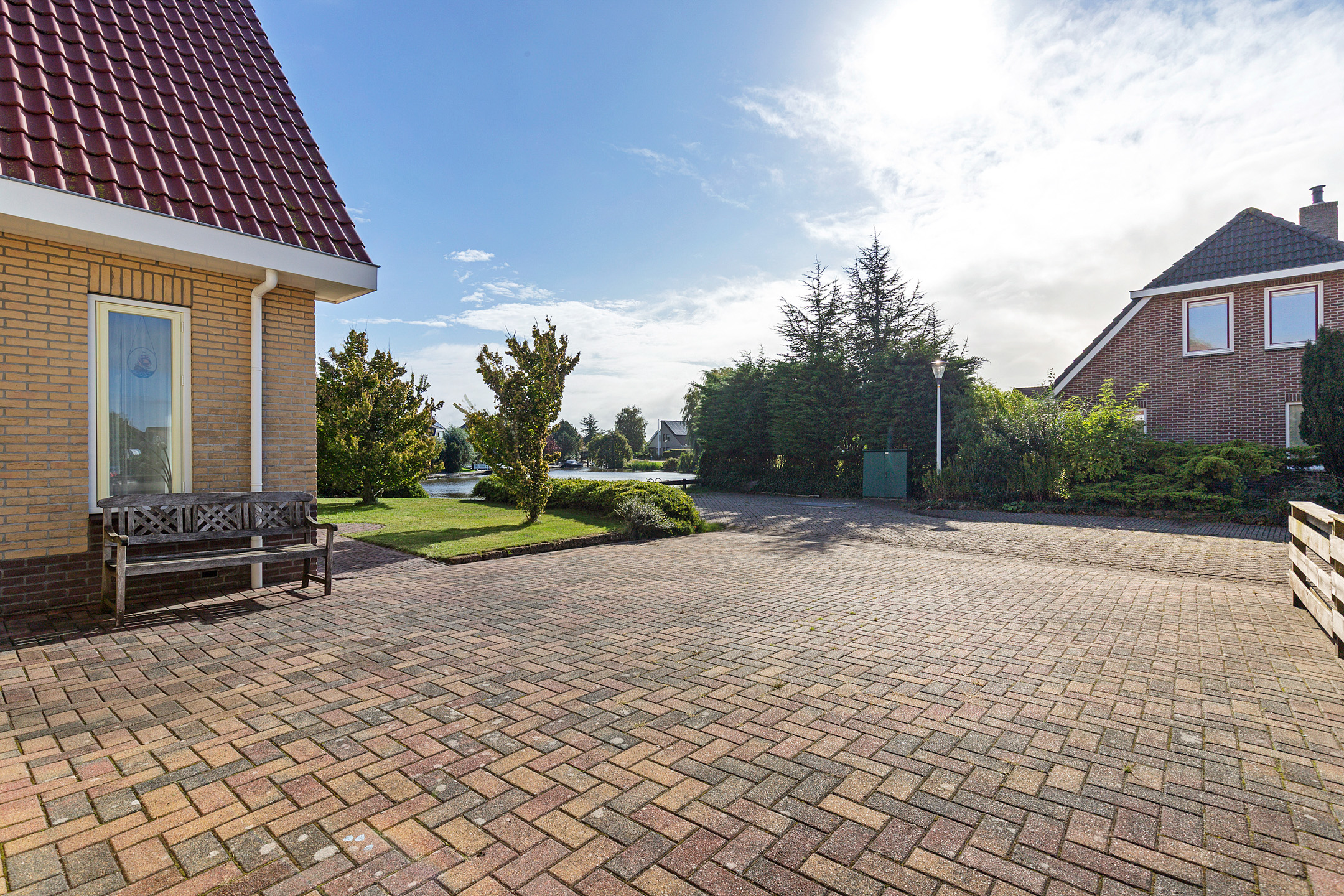 De keurig verzorgde tuin met diverse soorten bomen, struiken, borders en bestrating geeft veel beschutting en privacy. Door de ligging is er altijd wel een plekje in de schaduw of zon te vinden. Het zonnige verdiepte en bestrate terras met eigen zwemtrap op het zuidoosten aan het water is een fijne stek waar je al vroeg in de ochtend met een kop koffie de zon vangt en tot aan het einde van de dag heerlijk kunt vertoeven of van het water(sporten) kunt genieten. Het vaarwater is een aftakking van de Bolswardervaart, bekend van de Elfsteden route en is te bevaren met een sloep.