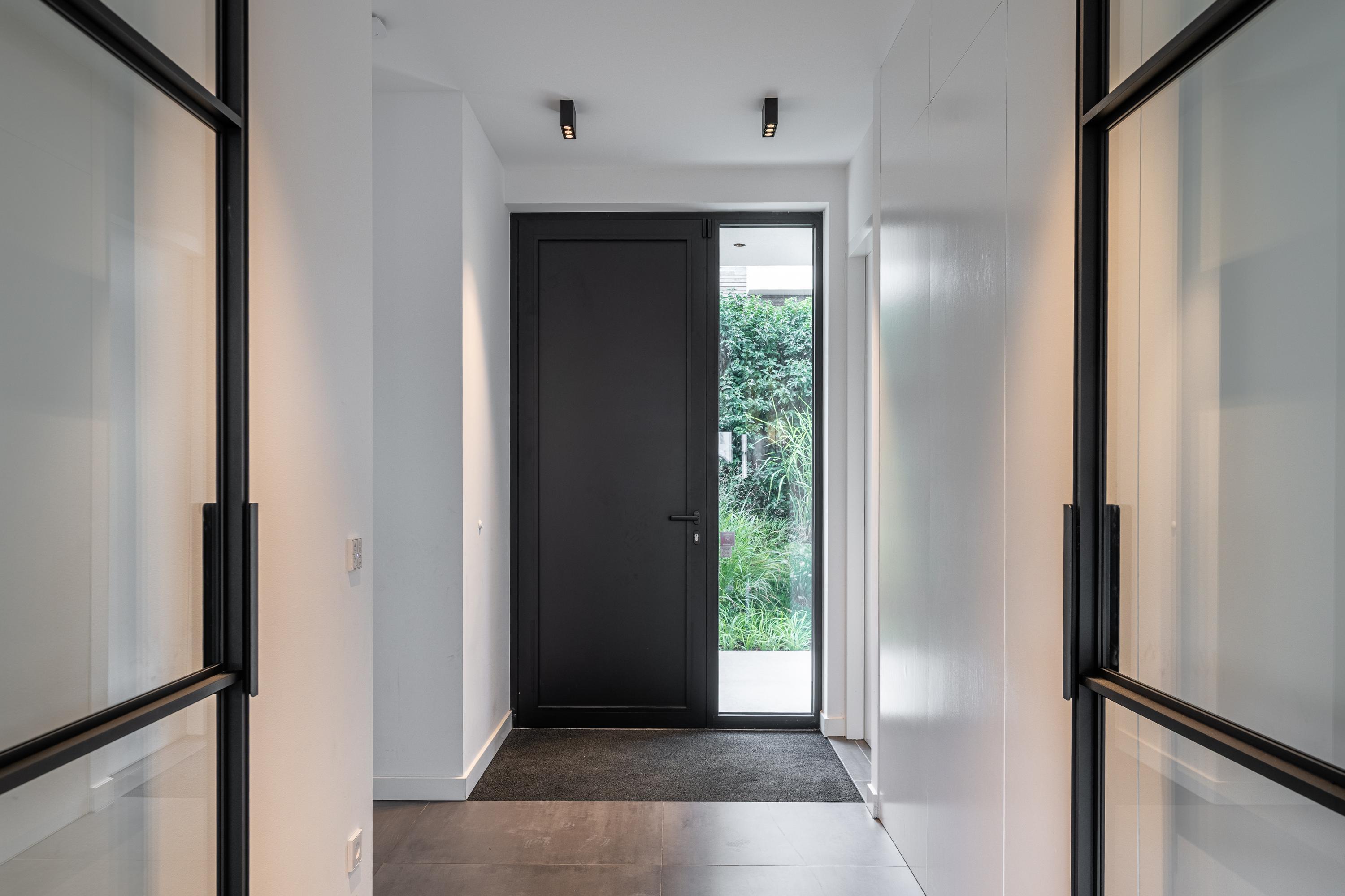 De ruime ontvangsthal wordt gekenmerkt door twee aluminium taatsdeuren die toegang bieden tot het woongedeelte en de vide met grote glaspartij. De hal biedt tevens toegang tot de toiletruimte met zwevend toilet en wastafel. Tevens is er toegang tot de kantoorruimte op de begane grond. Ideaal voor mensen die een thuiswerkplek willen creëren of een slaapkamer op de begane grond om zo levensloopbestendig te kunnen wonen.