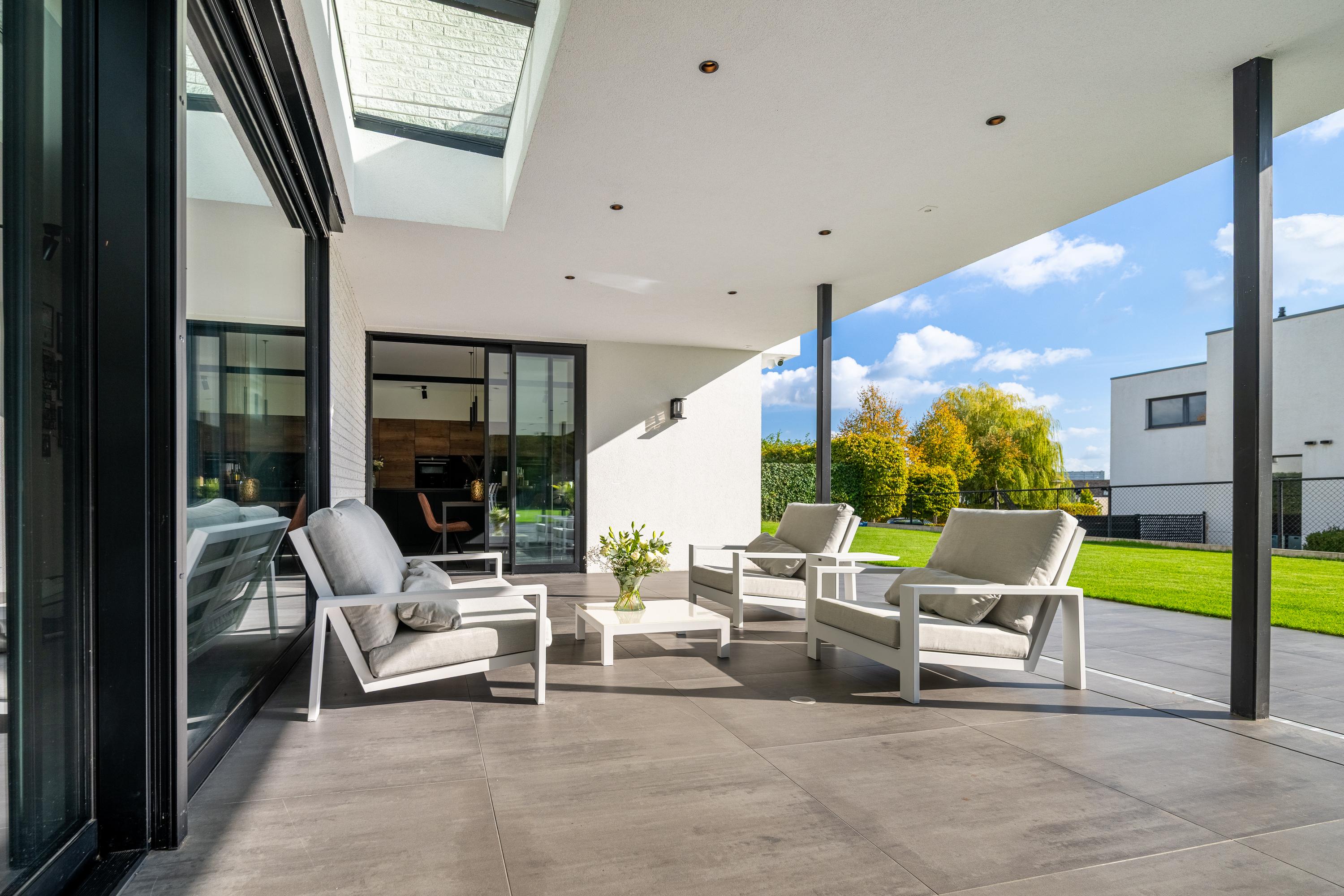 Dankzij de ruime overkapping geniet men hier van schaduw op zonnige dagen en comfortabele beschutting bij minder weer. De inbouwspots in het plafond zorgen 's avonds voor een warme, uitnodigende sfeer.