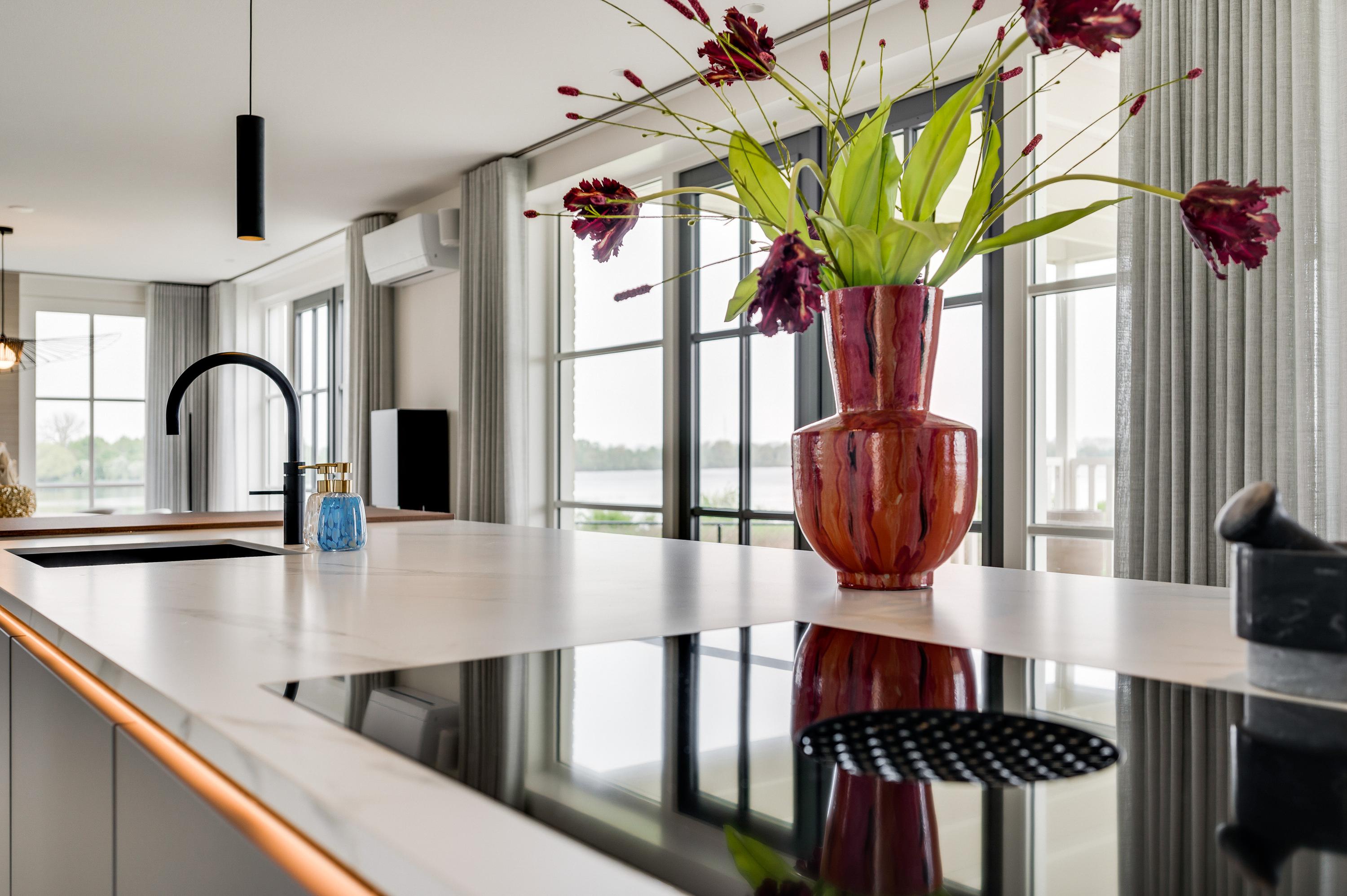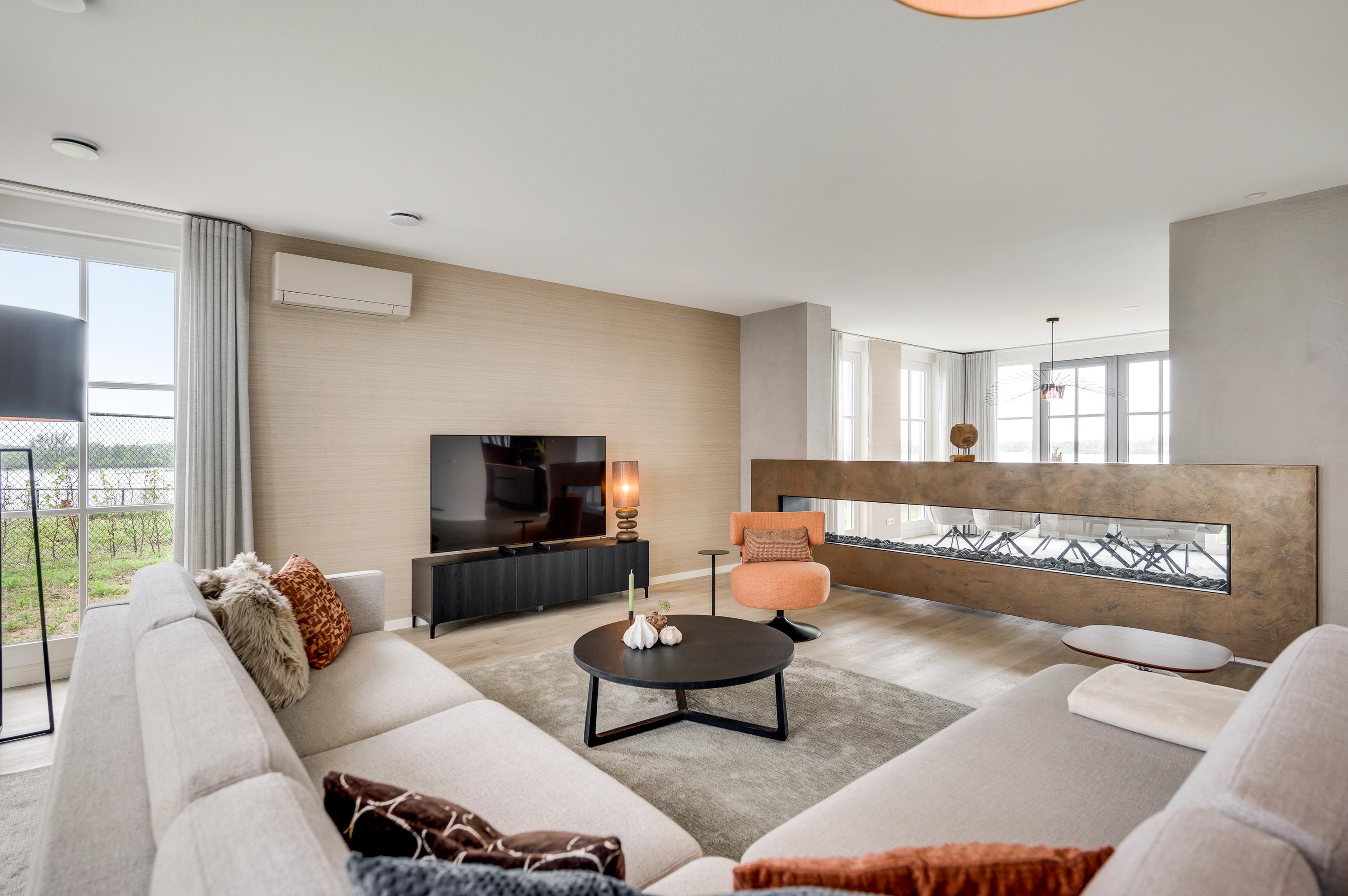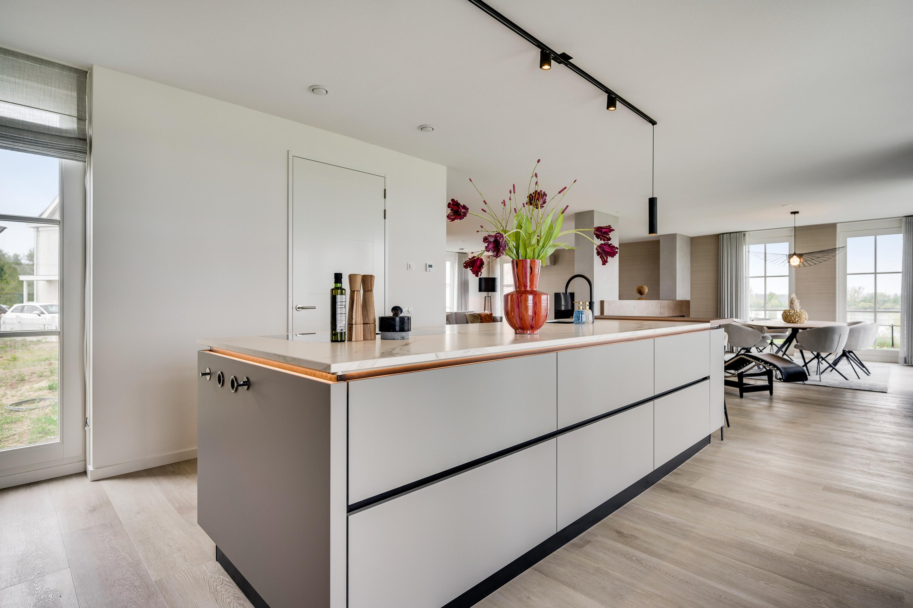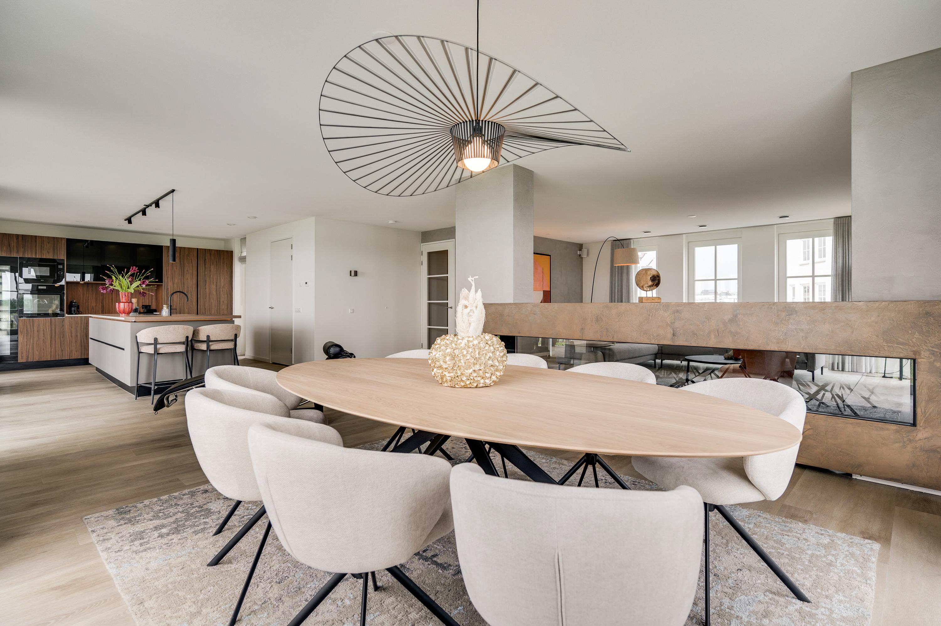 De eyecatcher in deze ruimte is de royale gashaard, welke op een luxe manier dient als roomdevider tussen de living en de eetkamer.