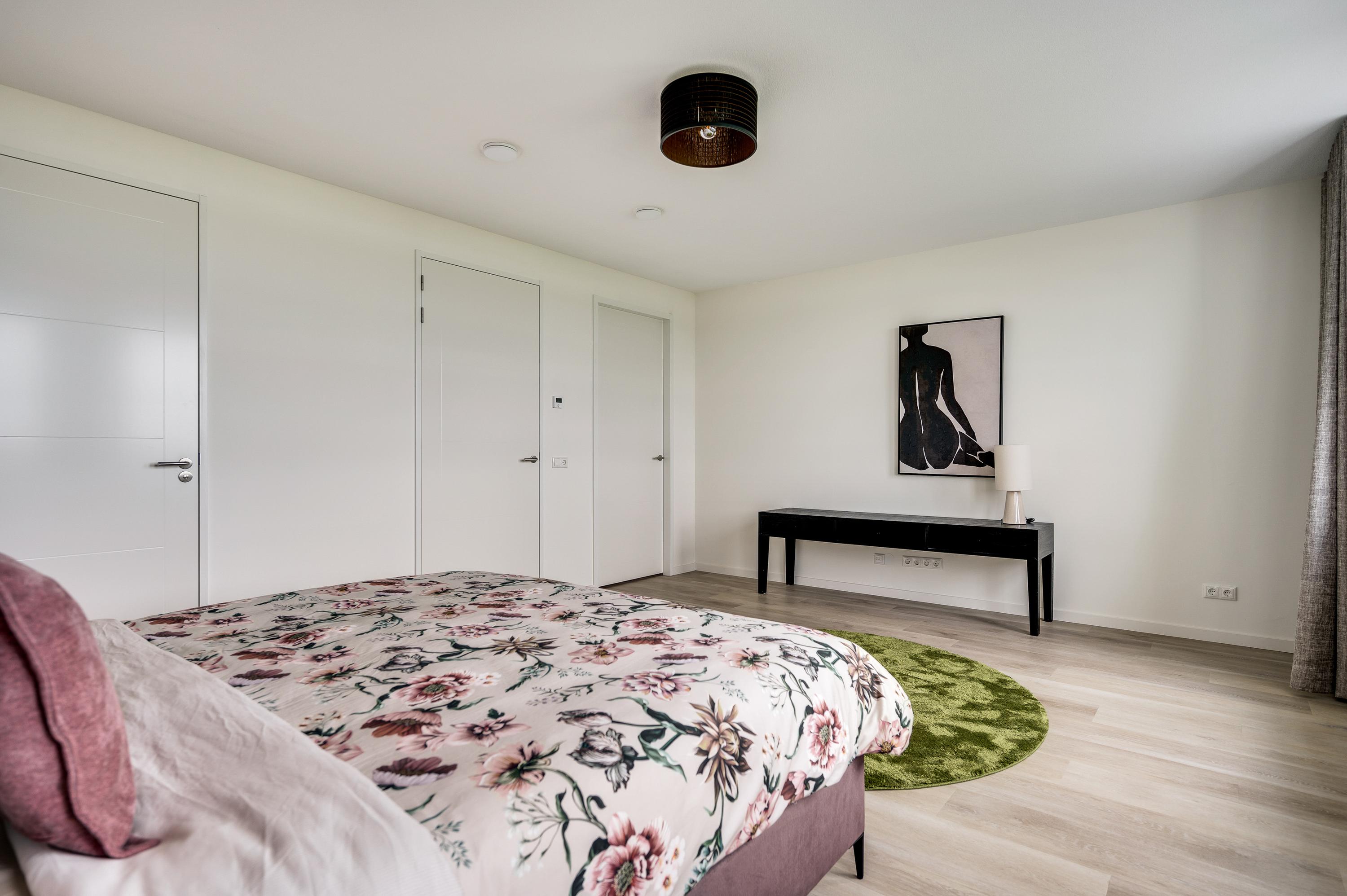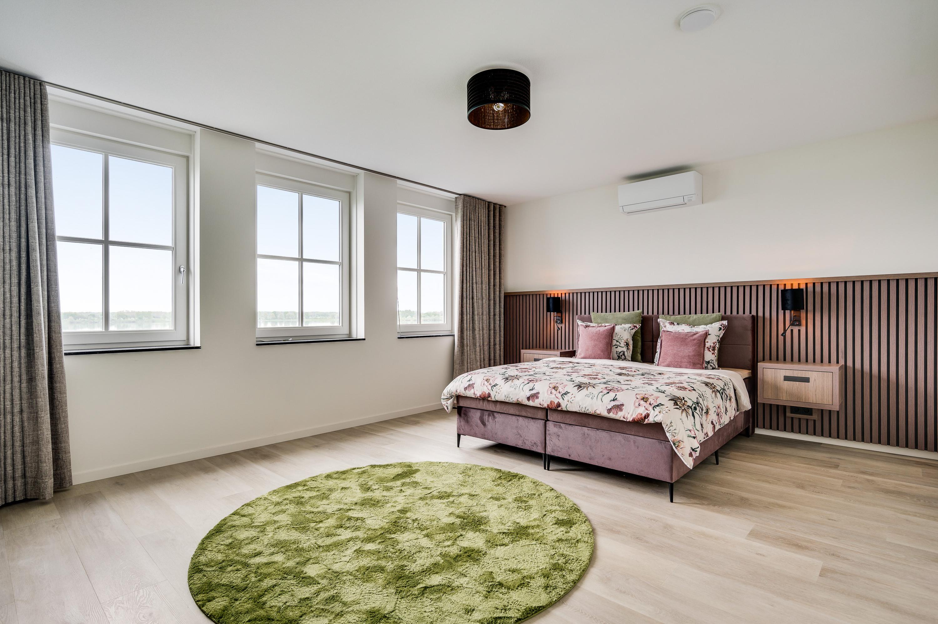 De master bedroom is gelegen aan de achterkant van de woning. Hier wordt je heerlijk wakker met eveneens het prachtige uitzicht over het water. de Master bedroom heeft een eigen badkamer met inloopdouche, ligbad en brede, dubbele wastafel. Tevens is er toegang tot de zeer royale en luxe walk-in closet.