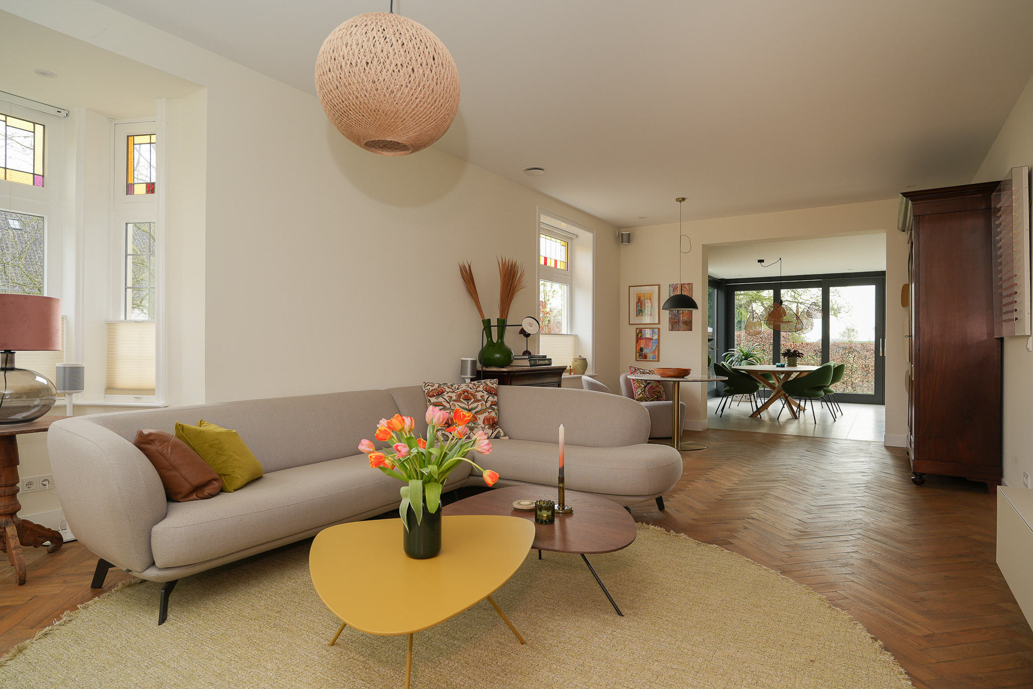 Een stalen taatsdeur leidt naar de woonkamer aan de voorzijde. Hier komen karakter en comfort op een natuurlijke manier samen. De erkers, het glas-in-lood en de visgraat parketvloer geven de ruimte een warme uitstraling die naadloos aansluit bij de uitstraling van de woning.