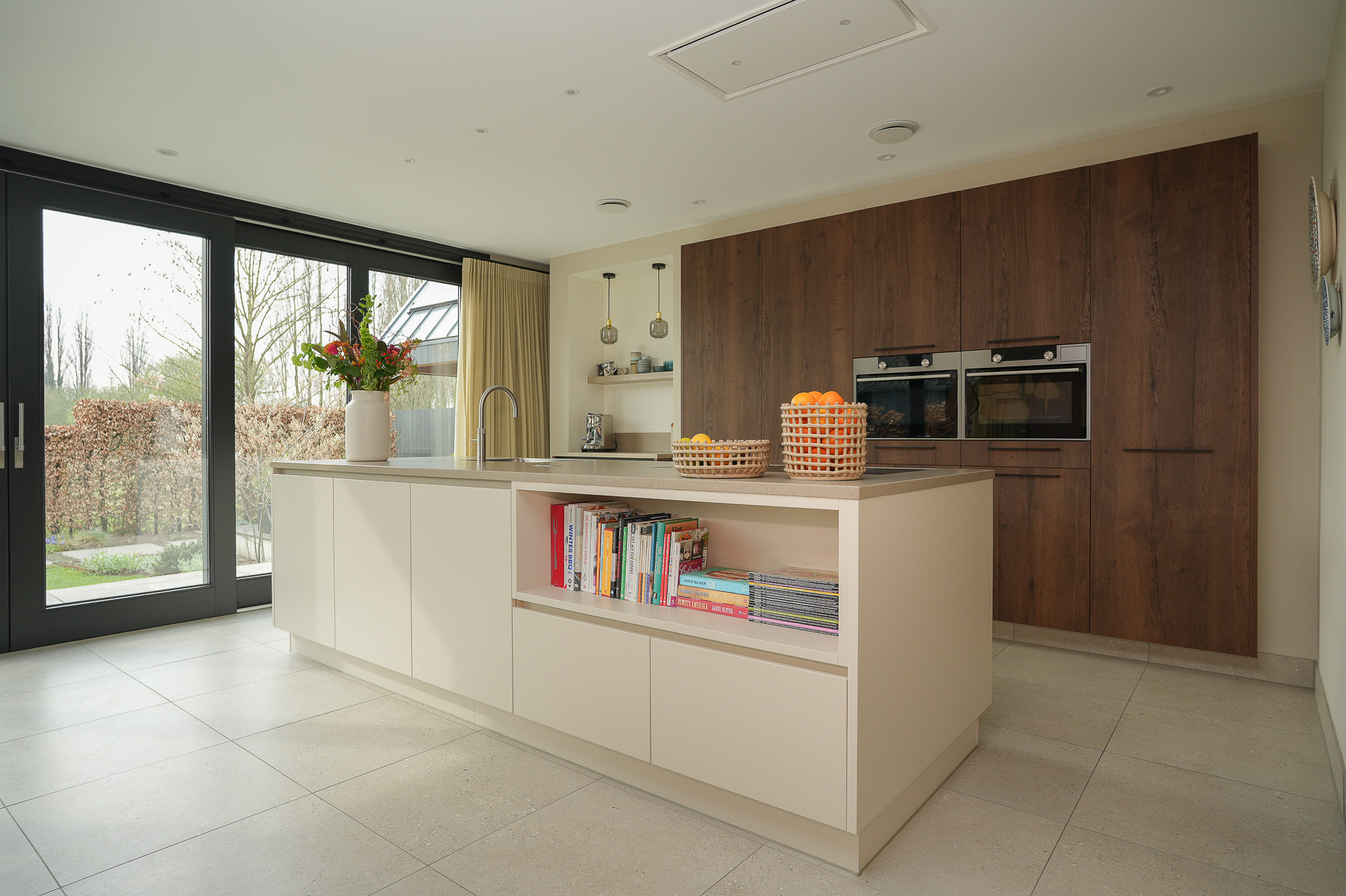 De keuken is uitgevoerd met een centraal kookeiland met een werkblad van composiet en een wandopstelling in een warme eikenhouten kleur.