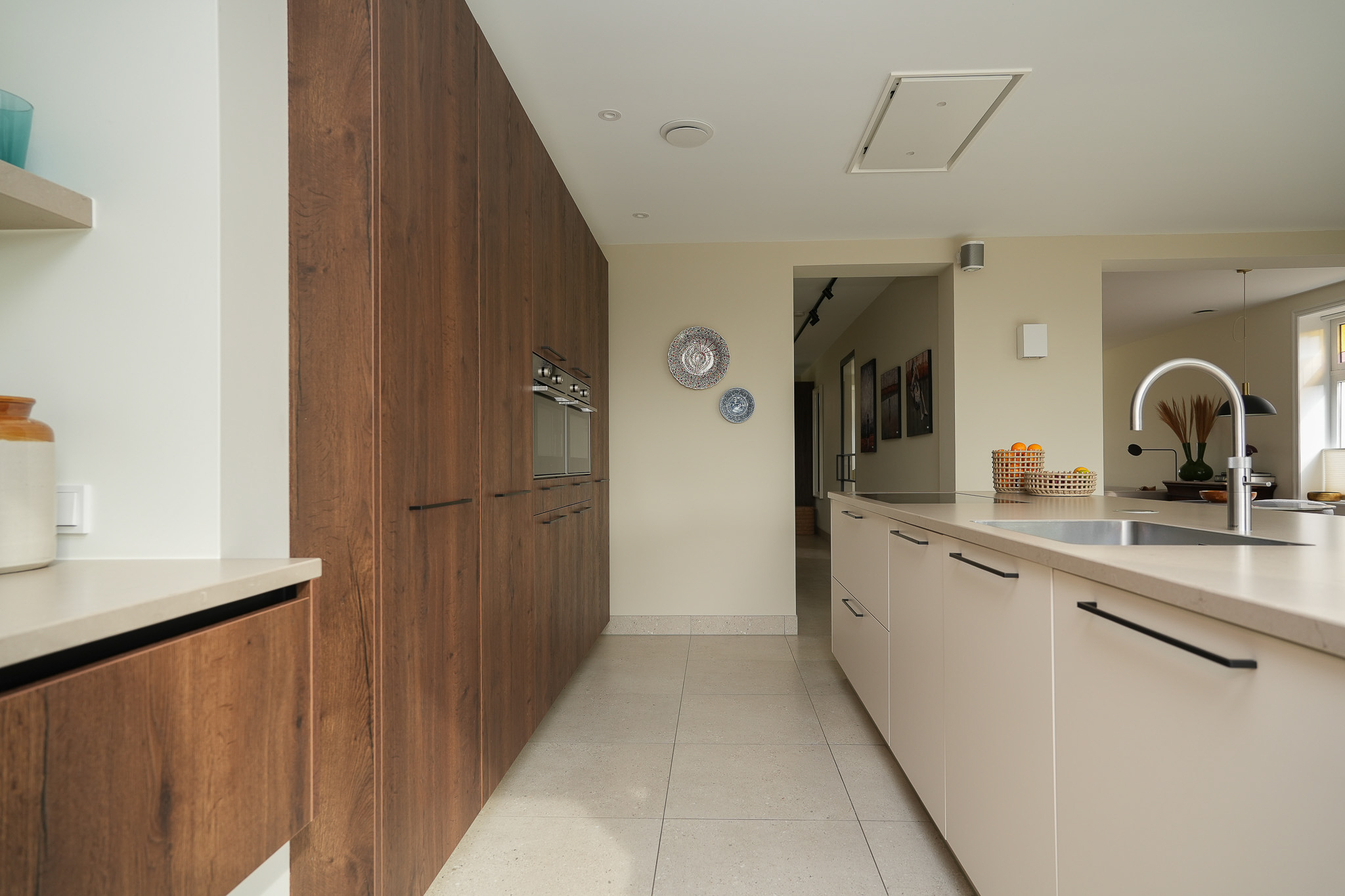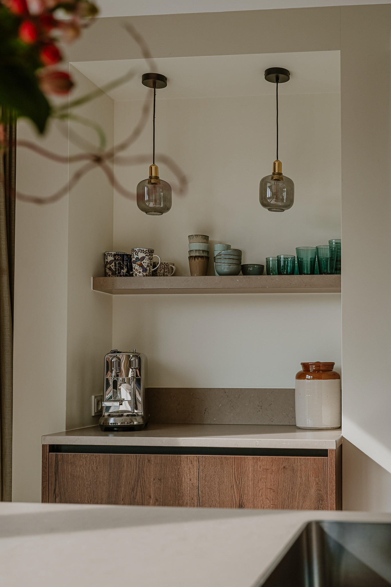 Het kastmeubel valt deels weg in de wand en is voorzien van hoogwaardige inbouwapparatuur, waardoor rust en eenheid in het geheel ontstaan. De aanwezige koffiecorner vormt een prettig en doordacht detail. Er is volop werk- en bergruimte, met daarnaast alle ruimte voor een royale eettafel.