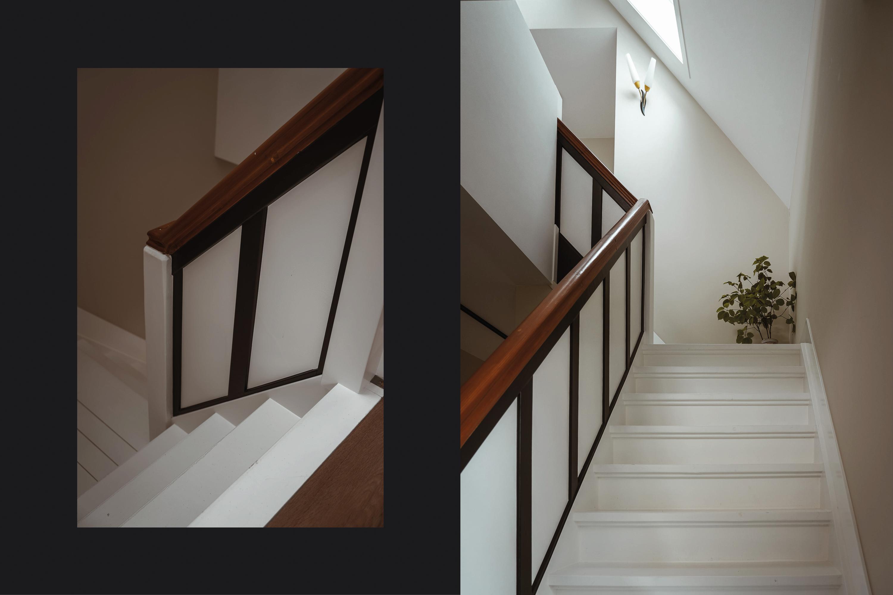 De originele trap leidt naar de eerste verdieping, waar direct de ruimtelijkheid opvalt.