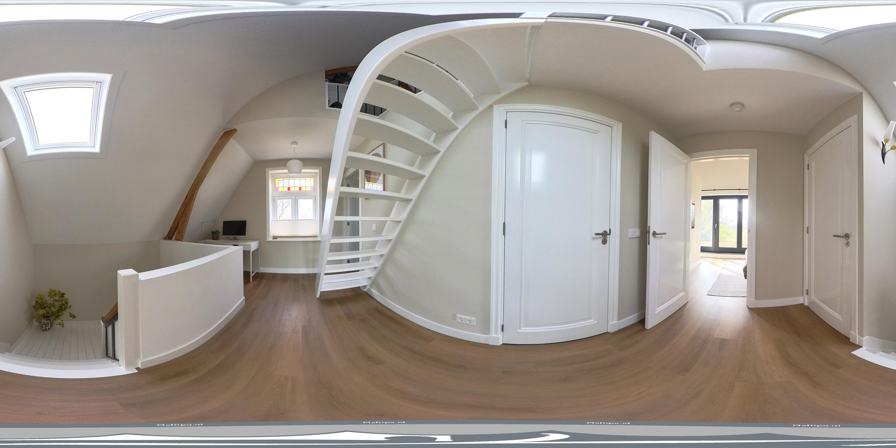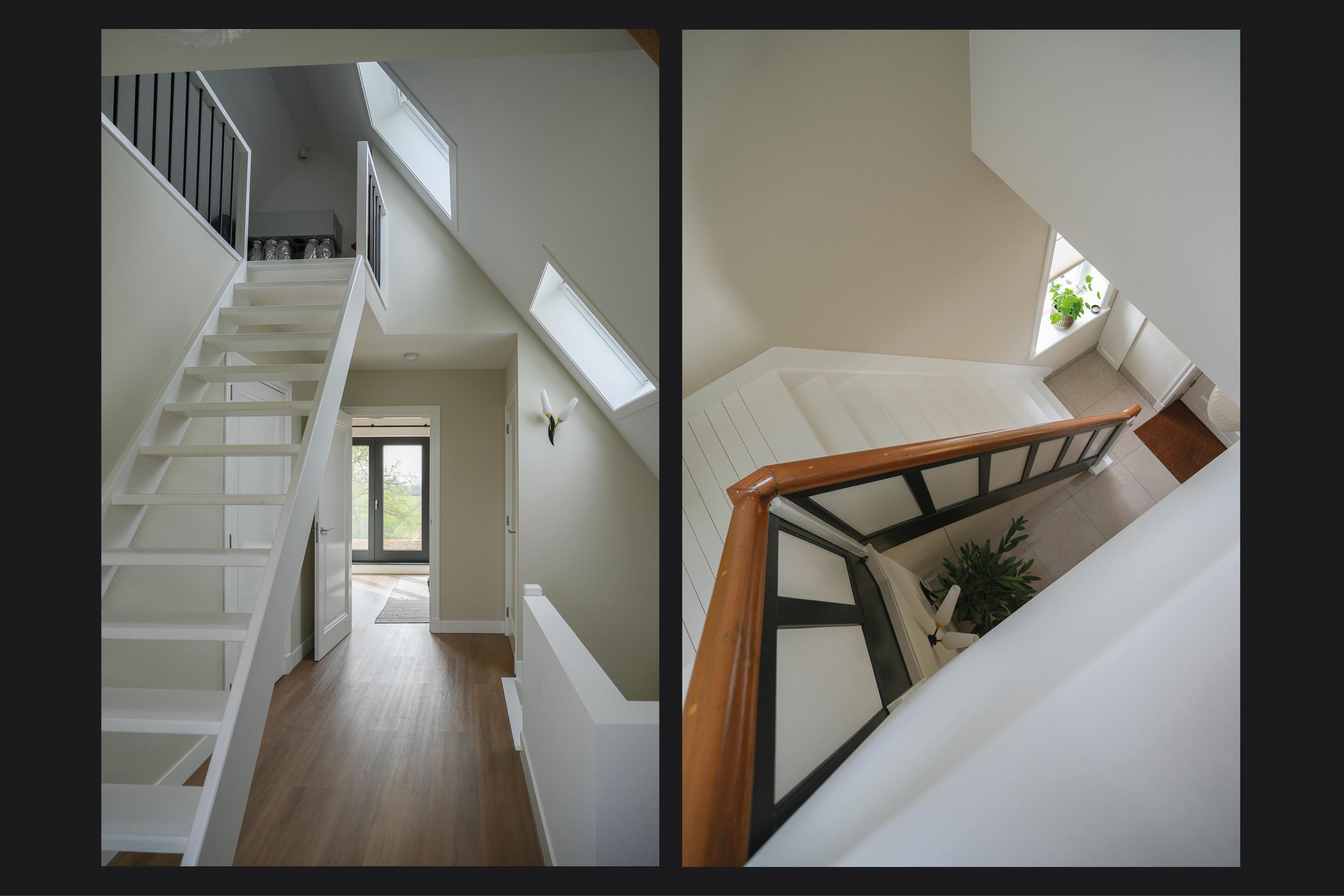 De overloop is aangenaam licht door de dakvensters in de geïsoleerde kap en biedt ruimte voor een werkplek. De open vide versterkt het gevoel van hoogte en verbinding binnen de woning.
