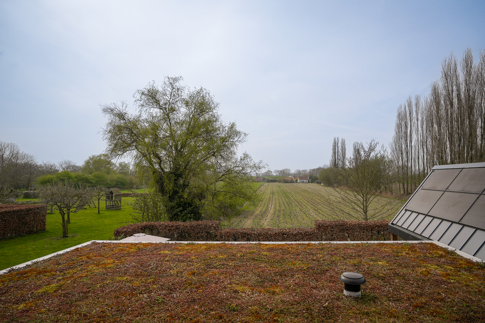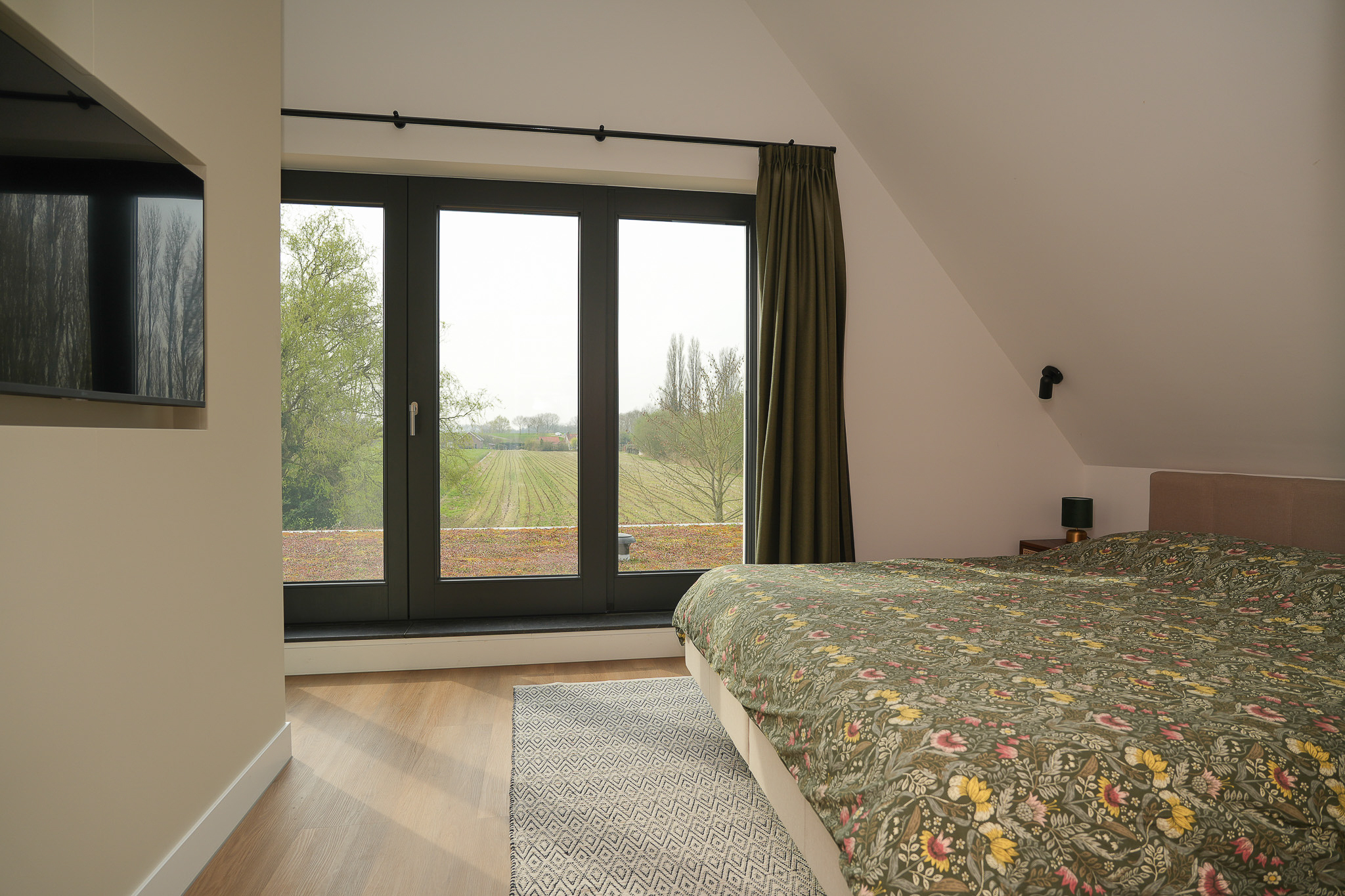 Aan de achterzijde ligt de hoofdslaapkamer, een rustige en lichte ruimte met vrij uitzicht over de achterliggende landerijen en de dijk. Aangrenzend bevindt zich de walk-in closet, uitgevoerd met maatwerkkasten. Vanuit hier geeft een zwarte stalen deur toegang tot de badkamer. Bovendien is er vanuit de slaapkamer toegang tot het met sedum belegde platte dak van de woonkeuken, waar een terras is gerealiseerd: een beschutte plek met vrij uitzicht over het groen.