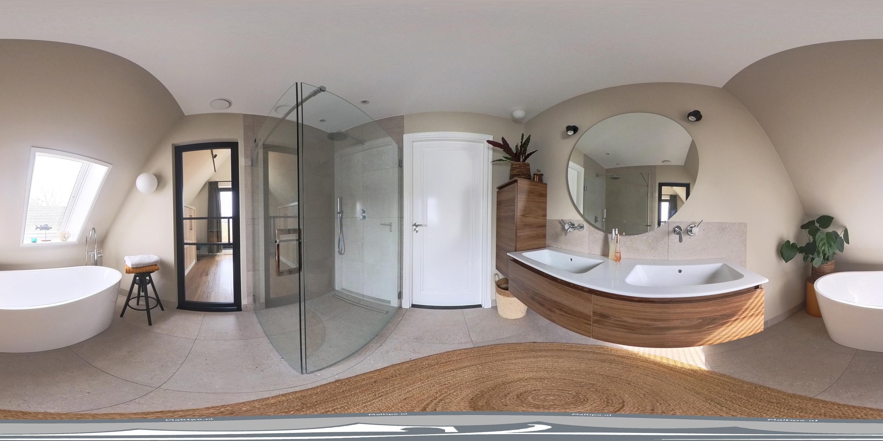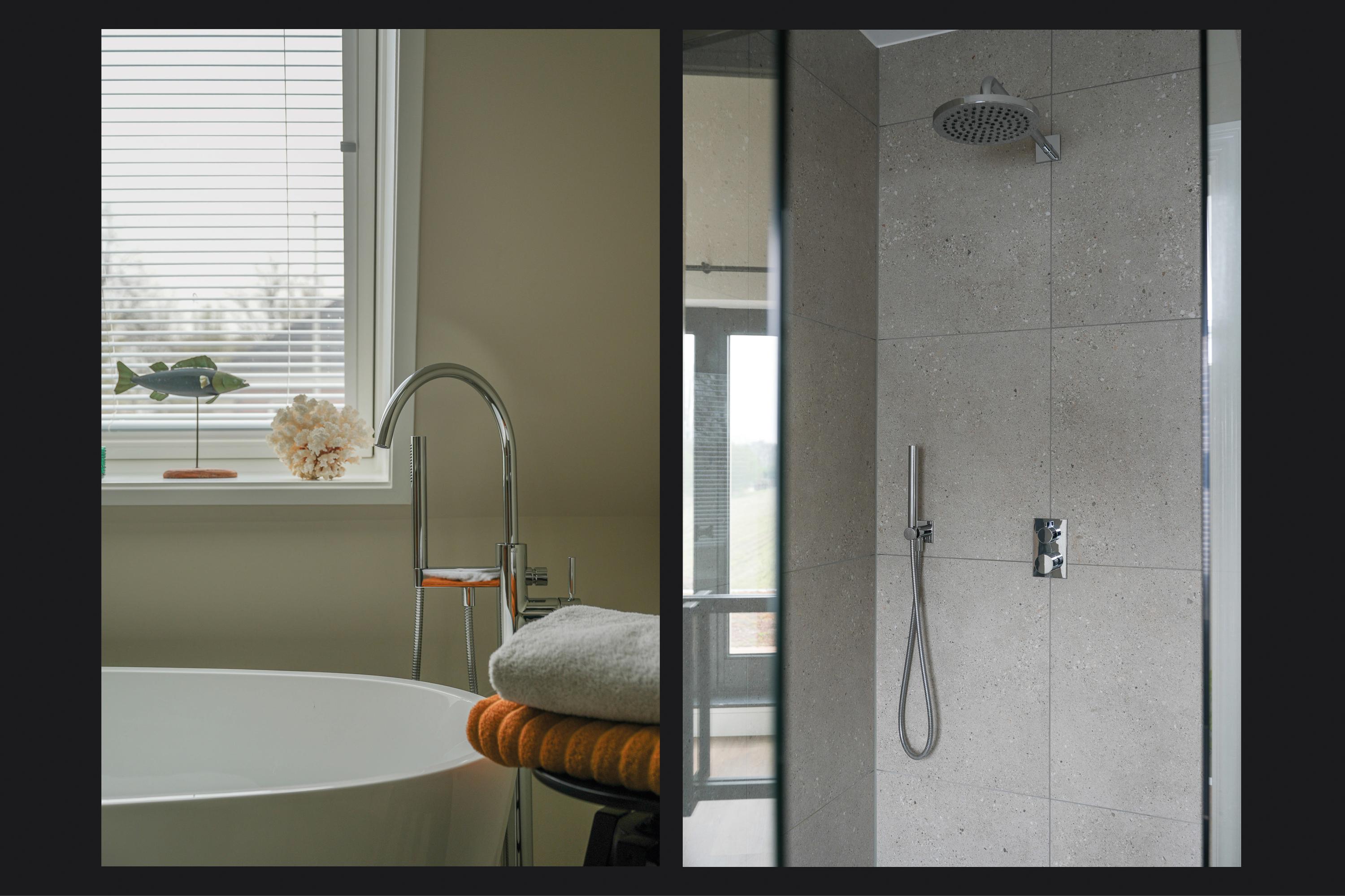 De badkamer is eveneens bereikbaar vanaf de overloop en ingericht in een tijdloze stijl met grote wand- en vloertegels en verfijnd sanitair. Hier bevinden zich een vrijstaand ligbad, een inloopdouche met regendouche en een dubbel wastafelmeubel.