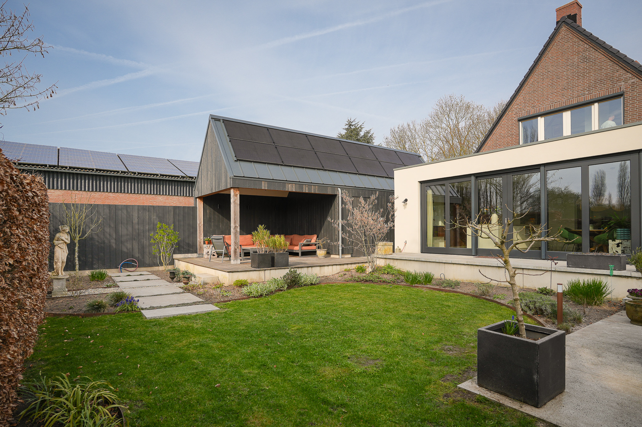 Naast de woning bevindt zich het bijgebouw, dat zich in de lengterichting uitstrekt langs de tuin en daarmee op natuurlijke wijze onderdeel vormt van het geheel. Aan de tuinzijde grenst een veranda, waar momenteel een comfortabele loungehoek is gecreëerd.