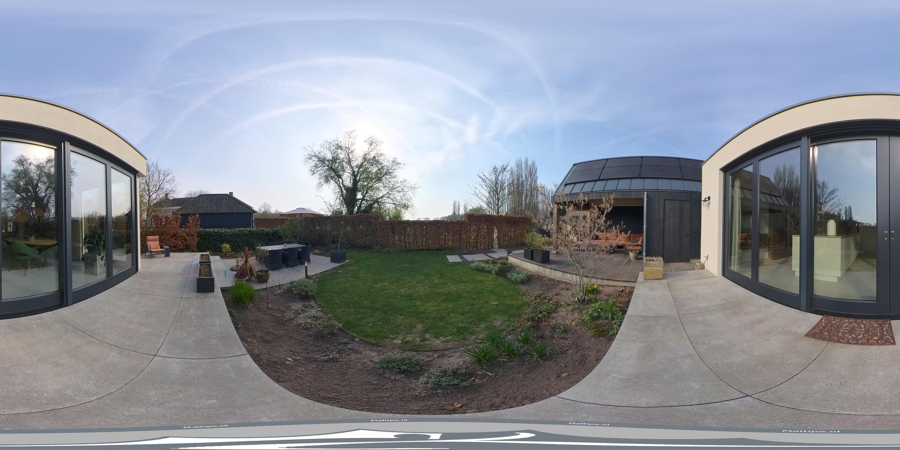 Deze opzet zorgt voor een prettige indeling van het perceel, met beschutte plekken bij de woning en open zichtlijnen naar de achterliggende landerijen.