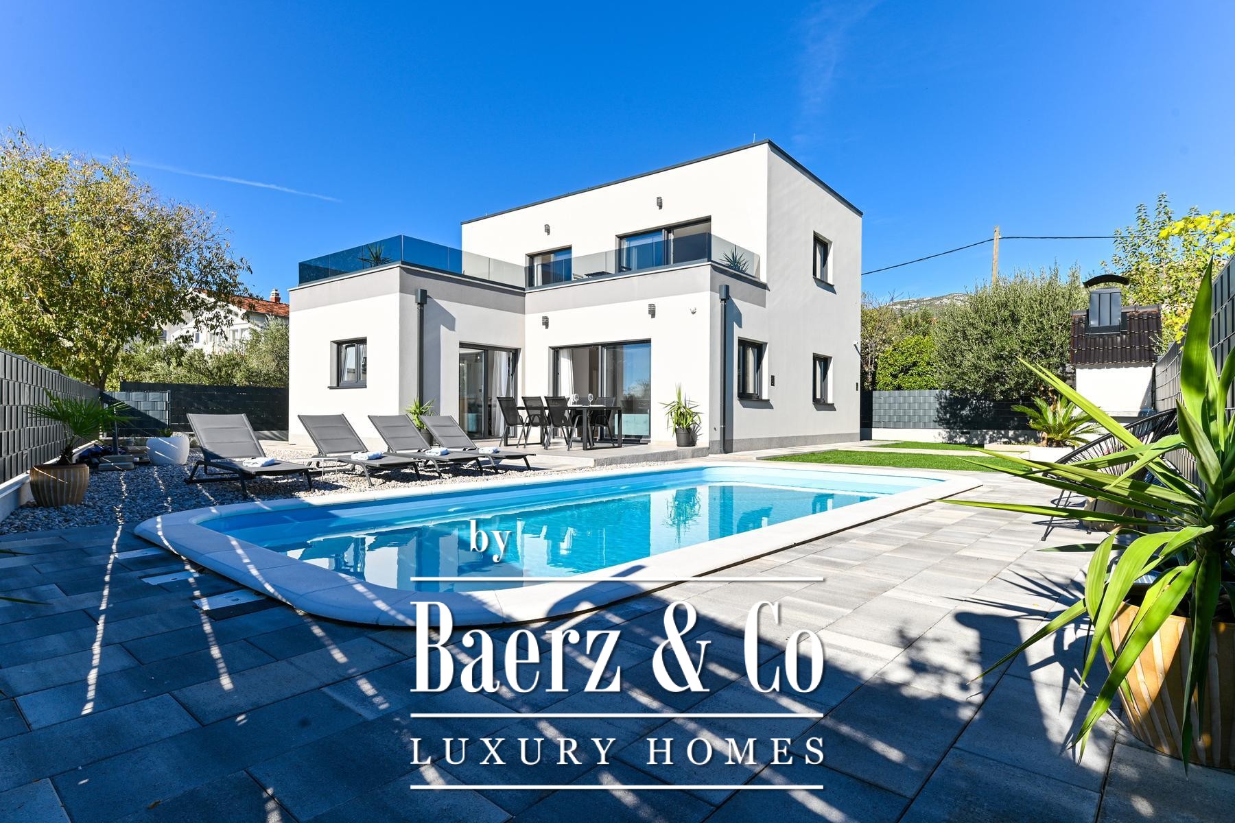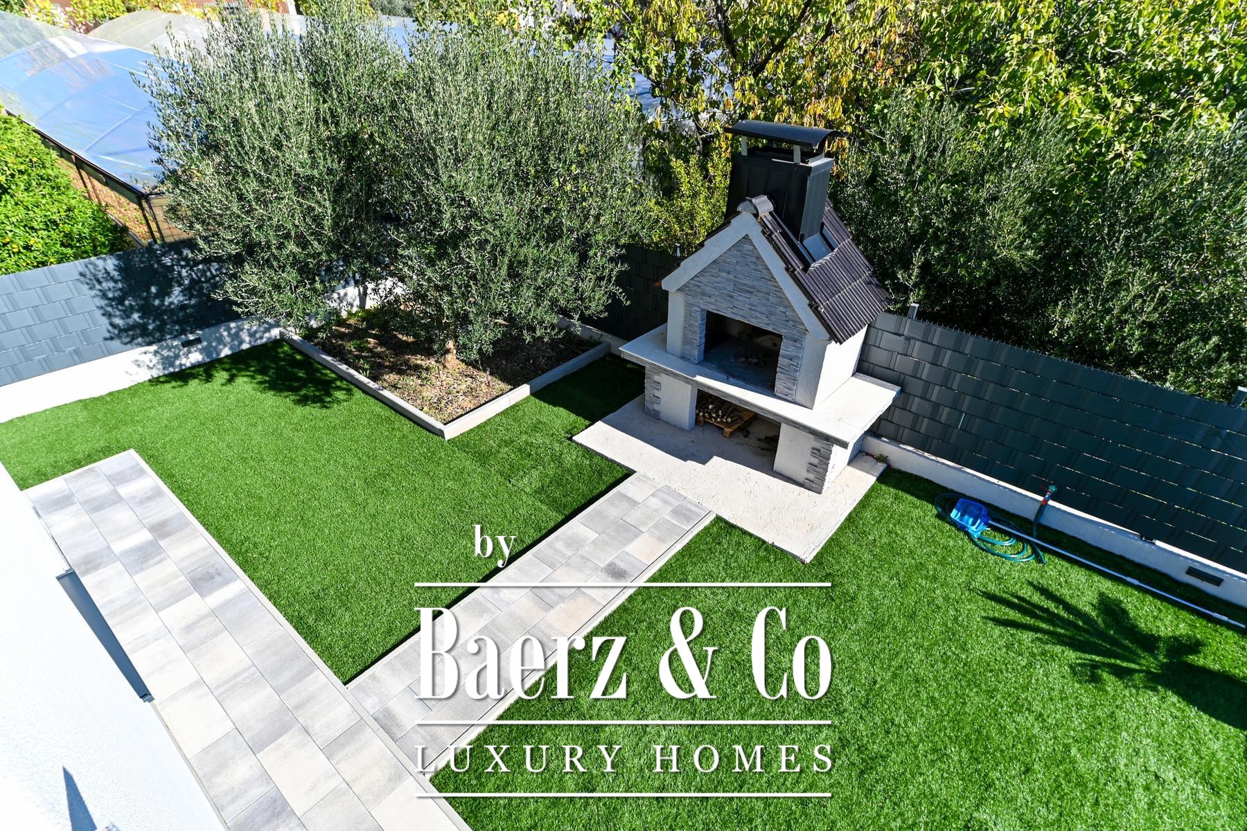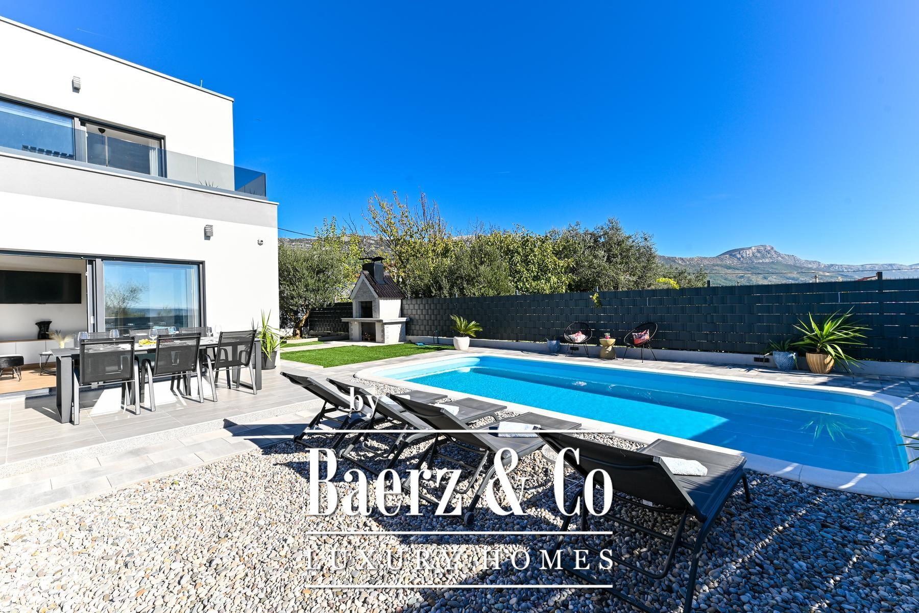 Buiten beschikt de volledig omheinde, fraai aangelegde tuin over een rustige zwembad, een zonneterras, een sociale ruimte en een barbecue, ontworpen voor zowel privacy als gezellige bijeenkomsten. De woning ligt op een gewilde, goed bereikbare locatie, met alle nodige voorzieningen binnen handbereik. Dit moderne huis in Kaštela verenigt doordachte architectuur en verfijnde buitenlevensstijl, waardoor het dagelijks leven aan de Adriatische kust nog aantrekkelijker wordt.
