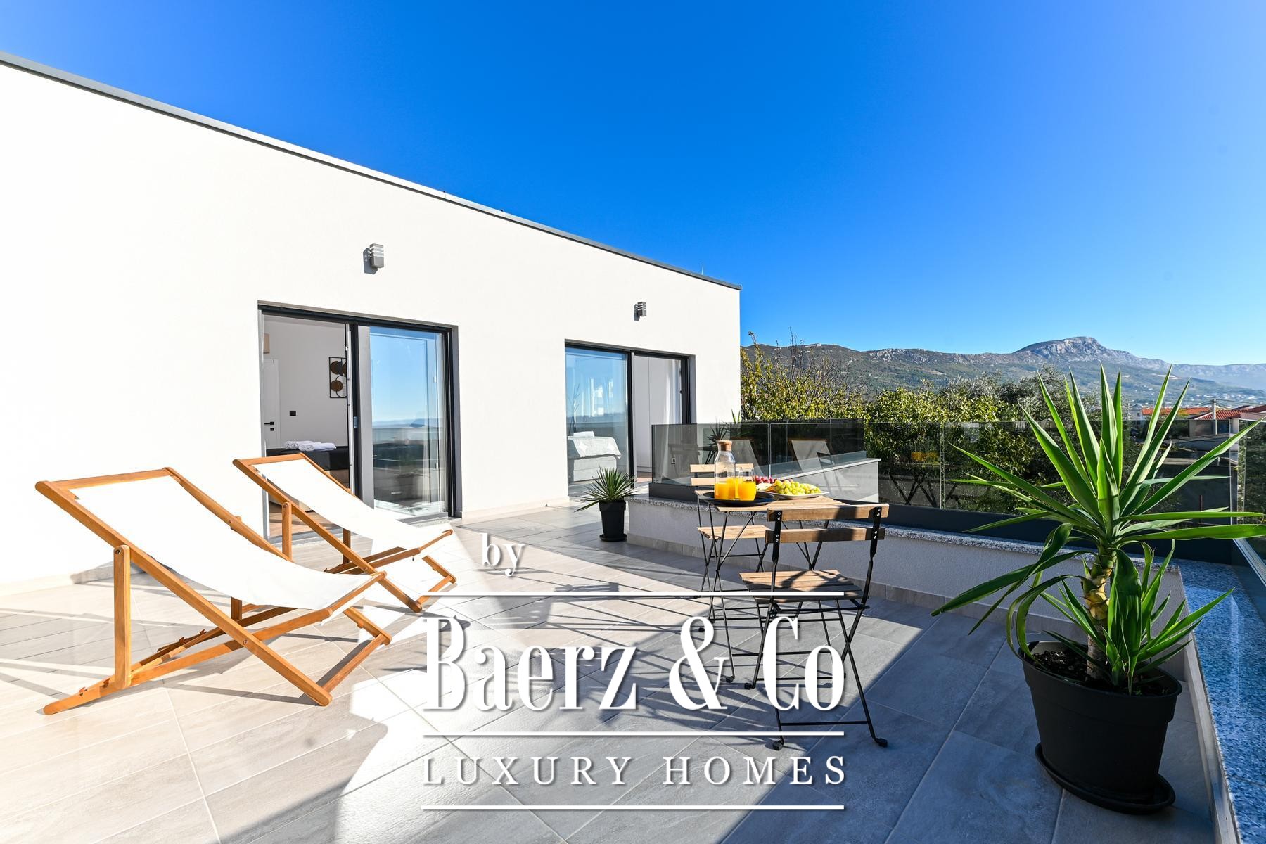 Modern huis Kaštela biedt een verhoogde woonstandaard in Kroatië. Gelegen op een perceel van 490 m² en gerealiseerd in 2025, omvat deze eigentijdse woning 160 m² die smaakvol verdeeld zijn over twee verdiepingen. Op de begane grond vindt u een volledig uitgeruste keuken met eetgedeelte, een open woonkamer, een wasruimte, een gastentoilet en een slaapkamer met privébadkamer. Op de eerste verdieping bevinden zich twee extra slaapkamers, elk voorzien van een eigen badkamer, met toegang tot een ruim terras dat een panoramisch uitzicht op zee biedt – een ideale plek om op elk moment van de dag tot rust te komen.