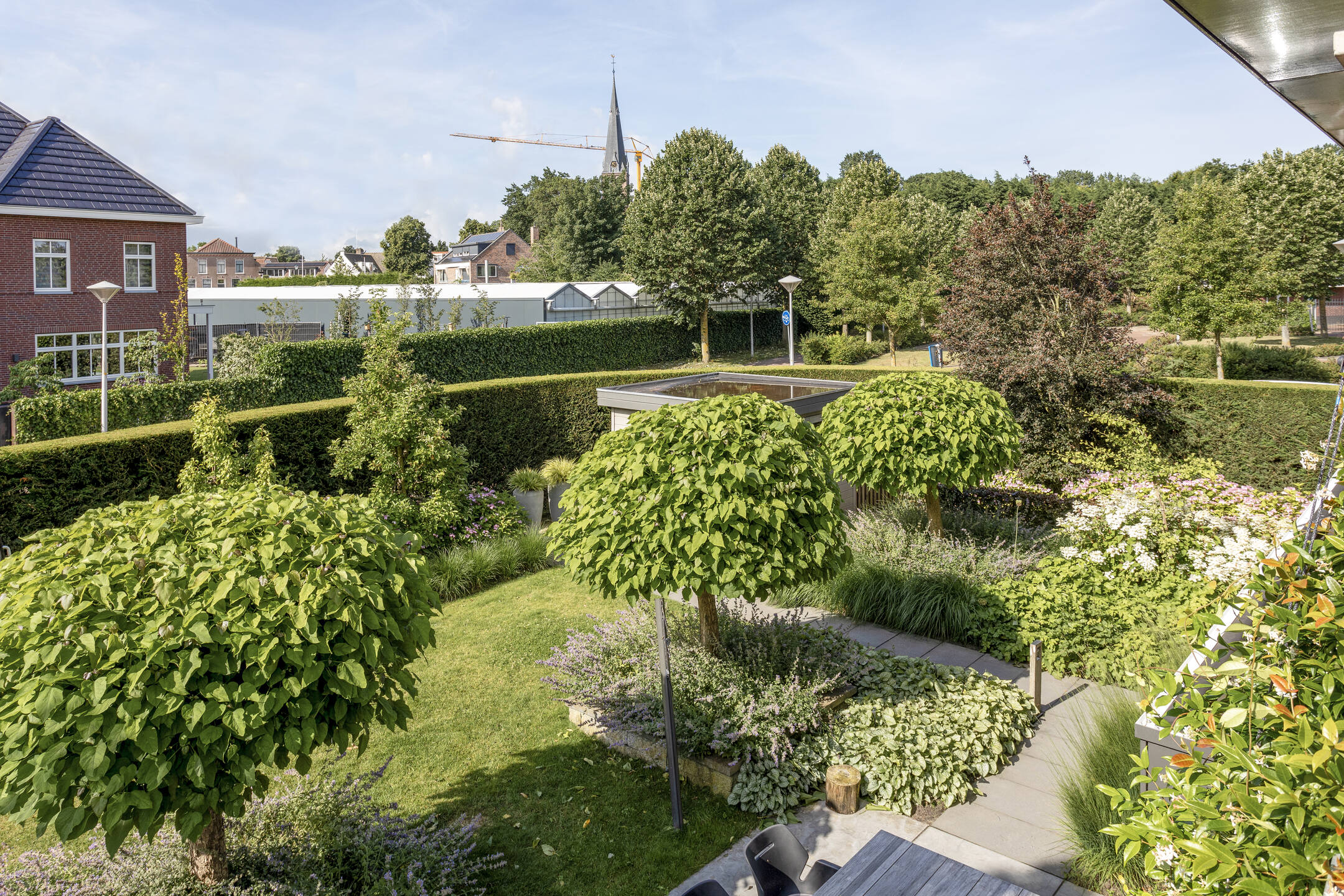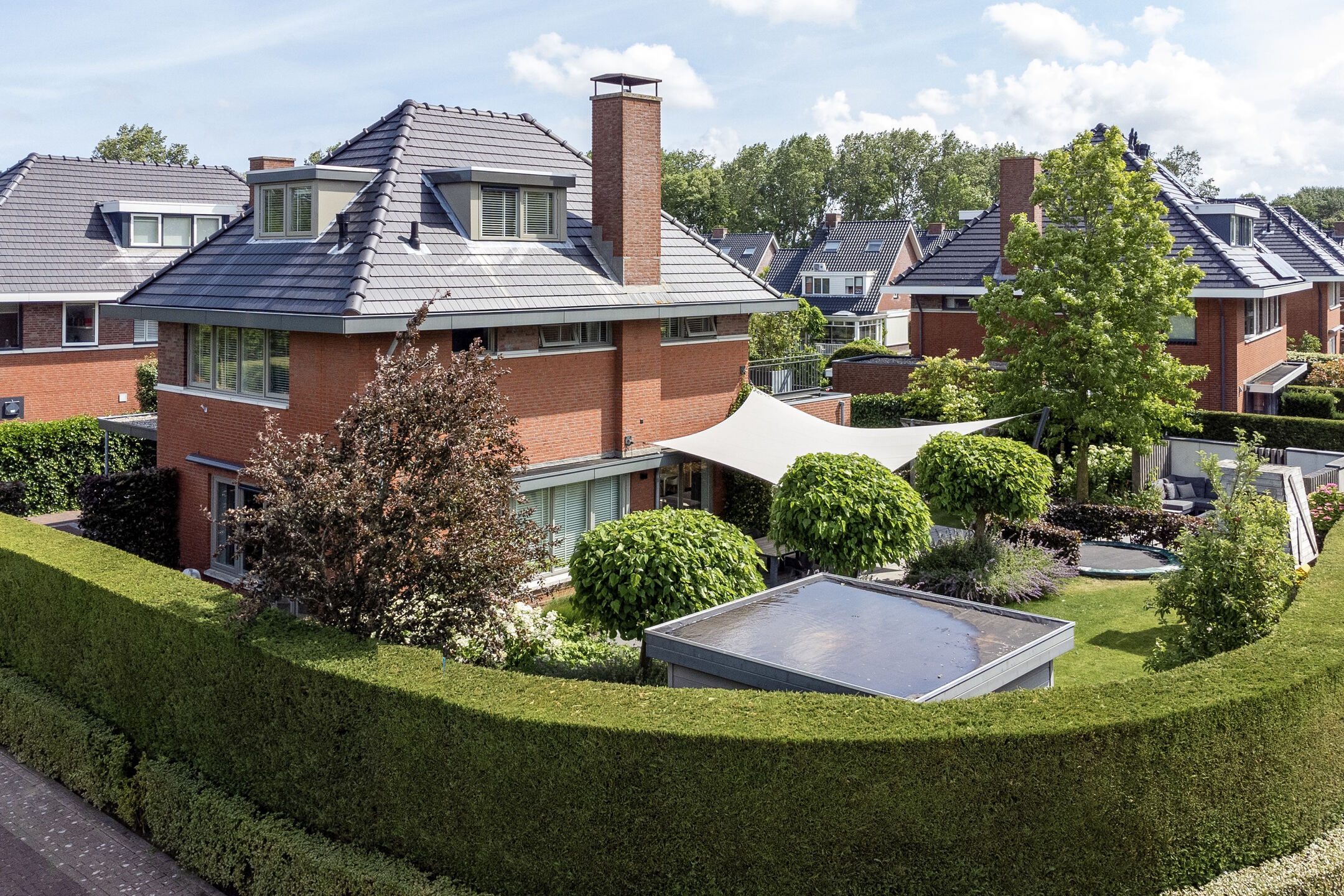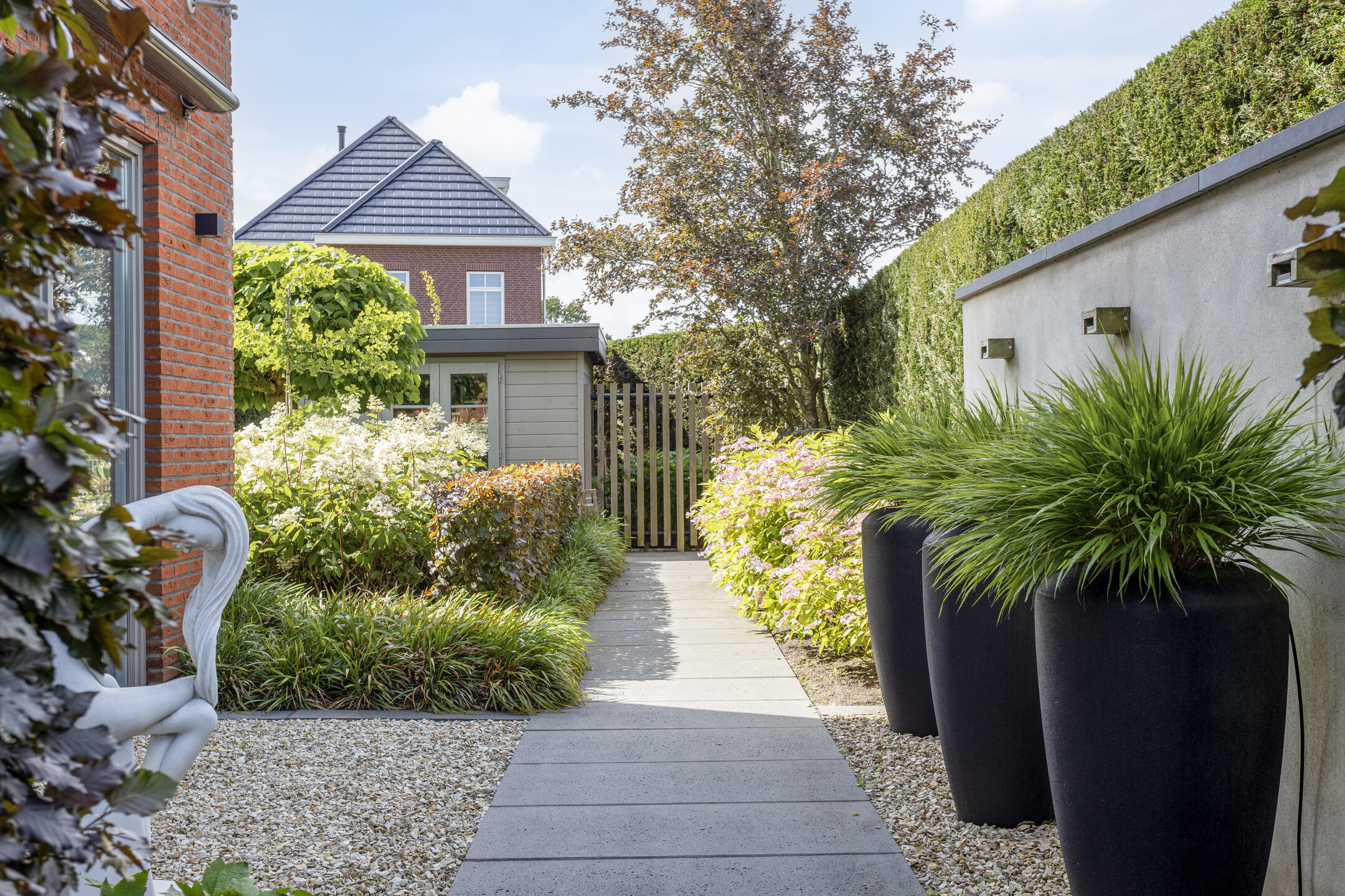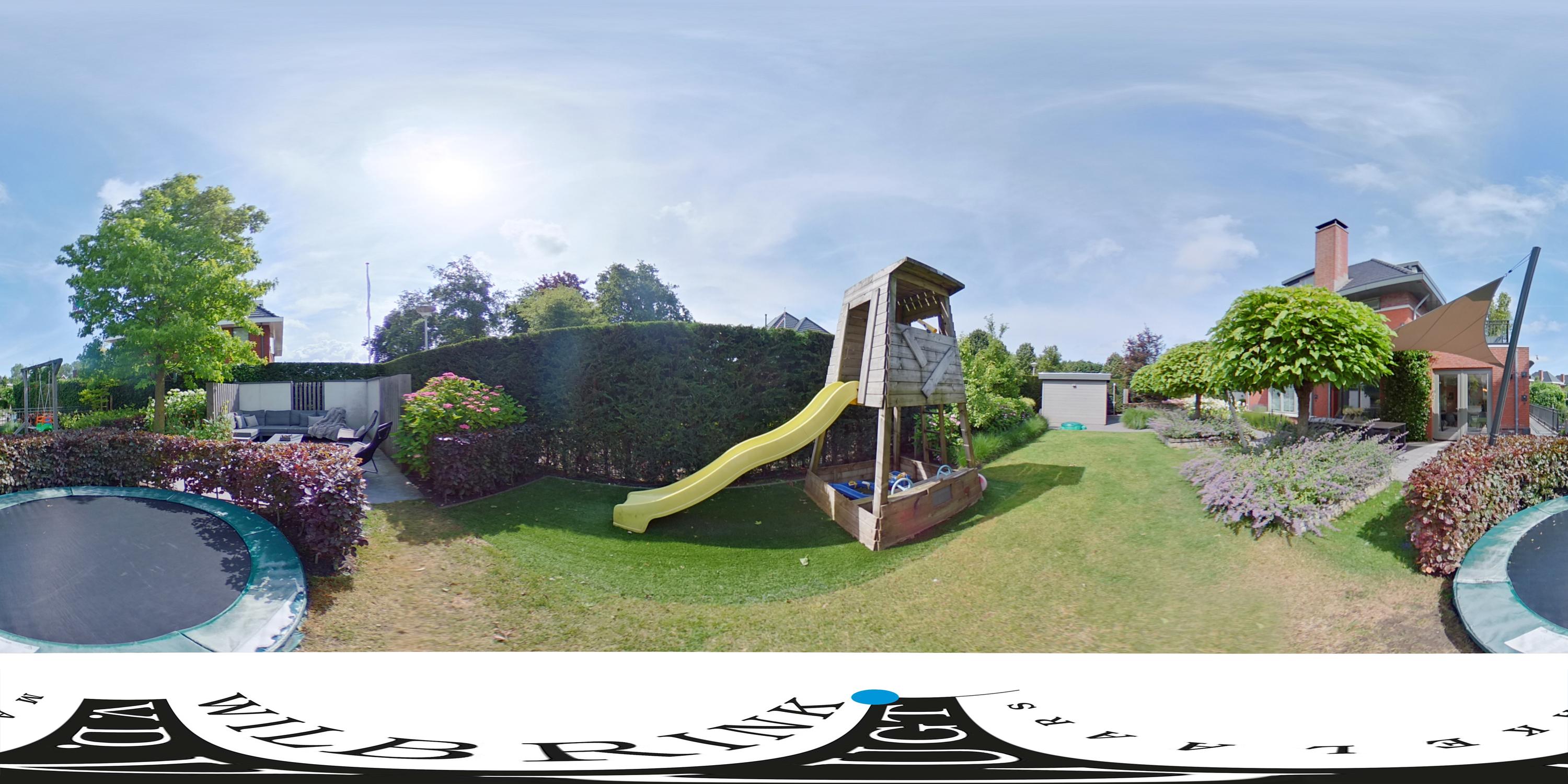 De fraai aangelegde tuin heeft diverse terrassen, gras, plantenbakken, bloemborders, hagen en een buitendouche. Het ruime terras aan de woonkamer (Z) is voorzien van een groot zonnedoek. De tuin is omringd door een prachtige groene haag en af te sluiten met een elektrisch bedienbaar sierhek, wat niet allen voor privacy zorgt maar ook voor extra veiligheid.