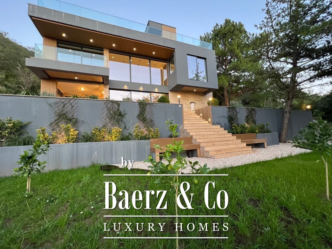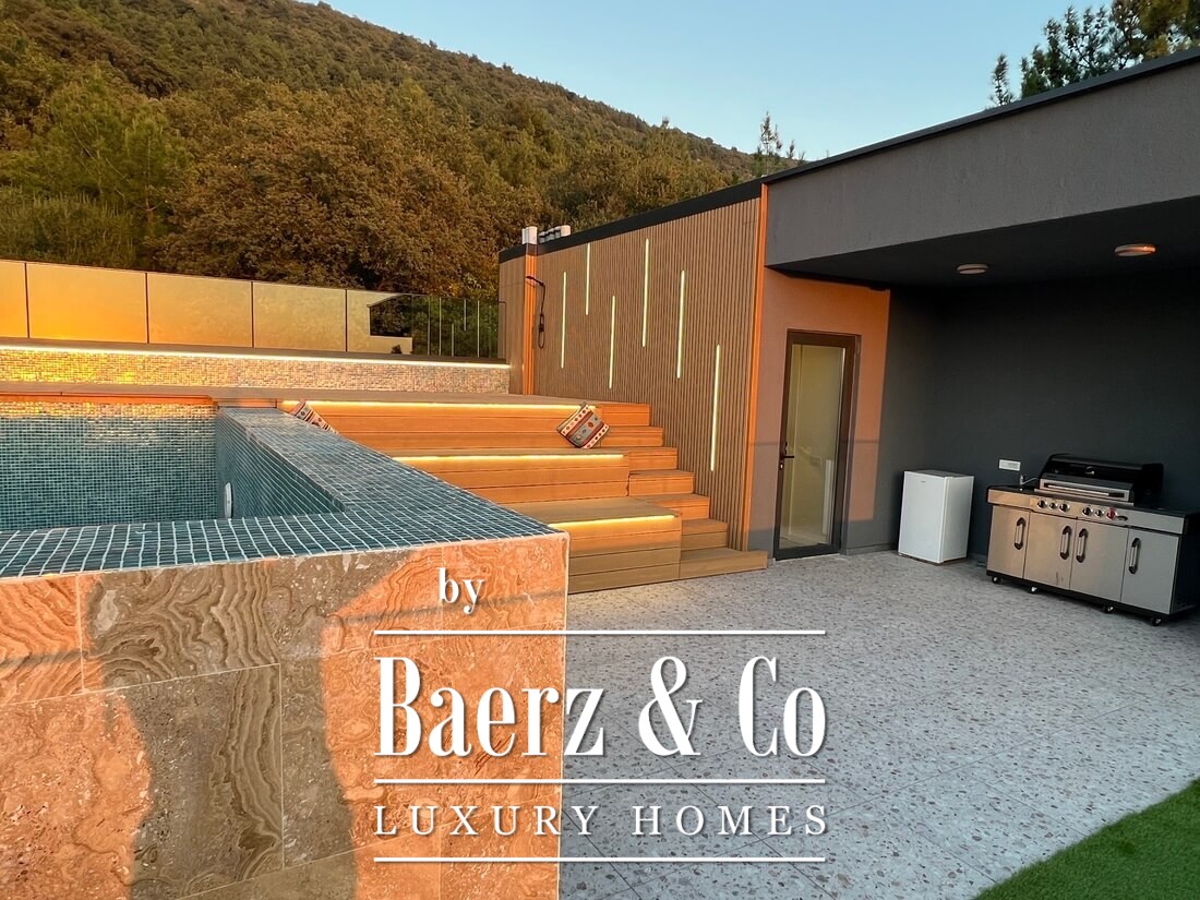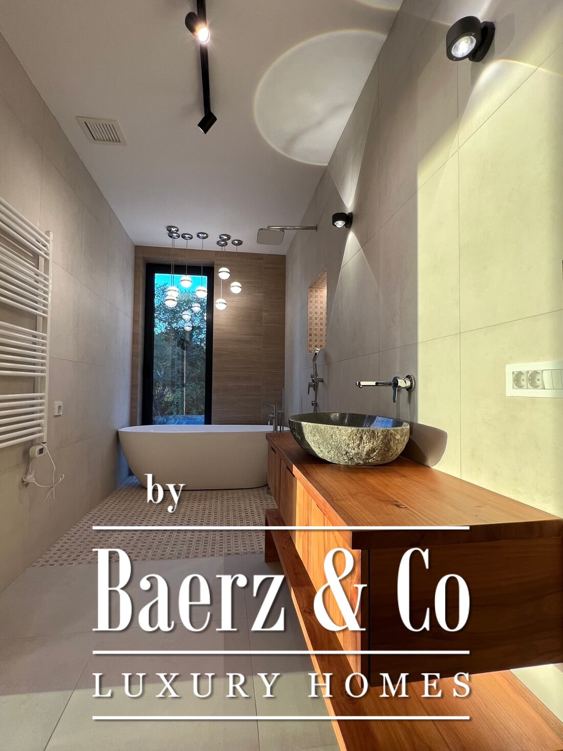 Everything in the villa is thought out for a comfortable life: a modern open plan, specialised technical rooms, including a laundry room and a boiler room, dressing rooms, a spacious hall combined with a kitchen, a bright dining room. Panoramic windows and mezzanine create an indescribable feeling of spaciousness. The rooftop relaxation area with a 5.5 x 4 meter swimming pool, summer kitchen, bathroom and a large terrace are ideal for receiving guests and relaxing. The complete absence of counterparts creates a feeling of privacy. The sleeping area on the top floor has 3 bedrooms and a spacious hall for children to play, library, music room or office which can become a 4th bedroom if needed. Living room with 6 meters ceiling and big cosy fireplace.
