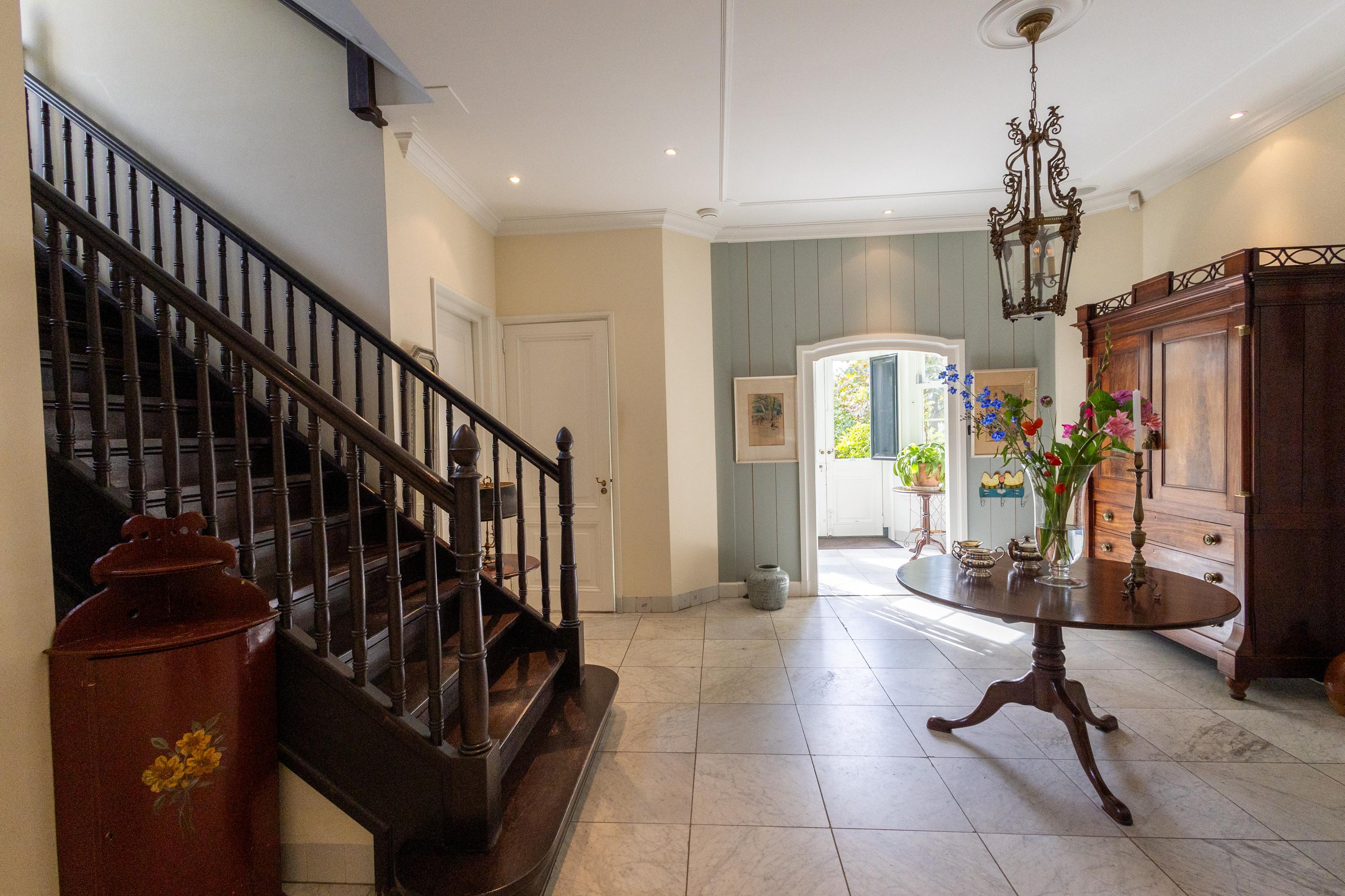 Binnen is de villa even verrassend als betoverend. Met een woonoppervlak van circa 350 m² en nog eens 150 m² in het souterrain biedt het huis een overvloed aan ruimte. De plafonds op de begane grond zijn bijna drie meter hoog, waardoor elke kamer een ademende ruimtelijkheid heeft. De statige hal met open haard en bordestrap voelt als een belofte van wat komen gaat.
