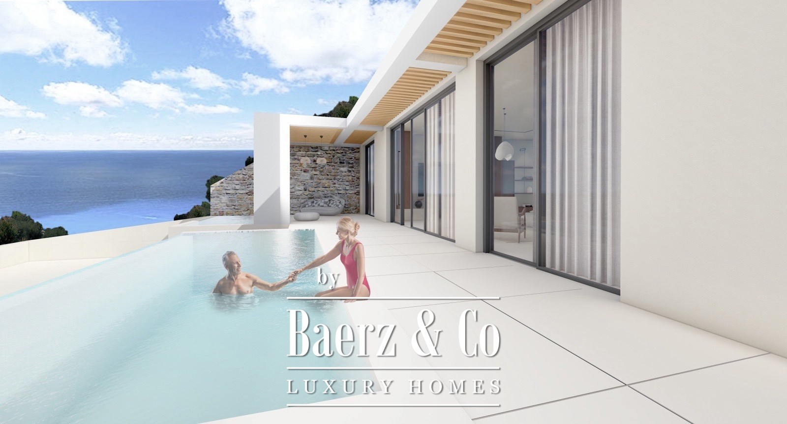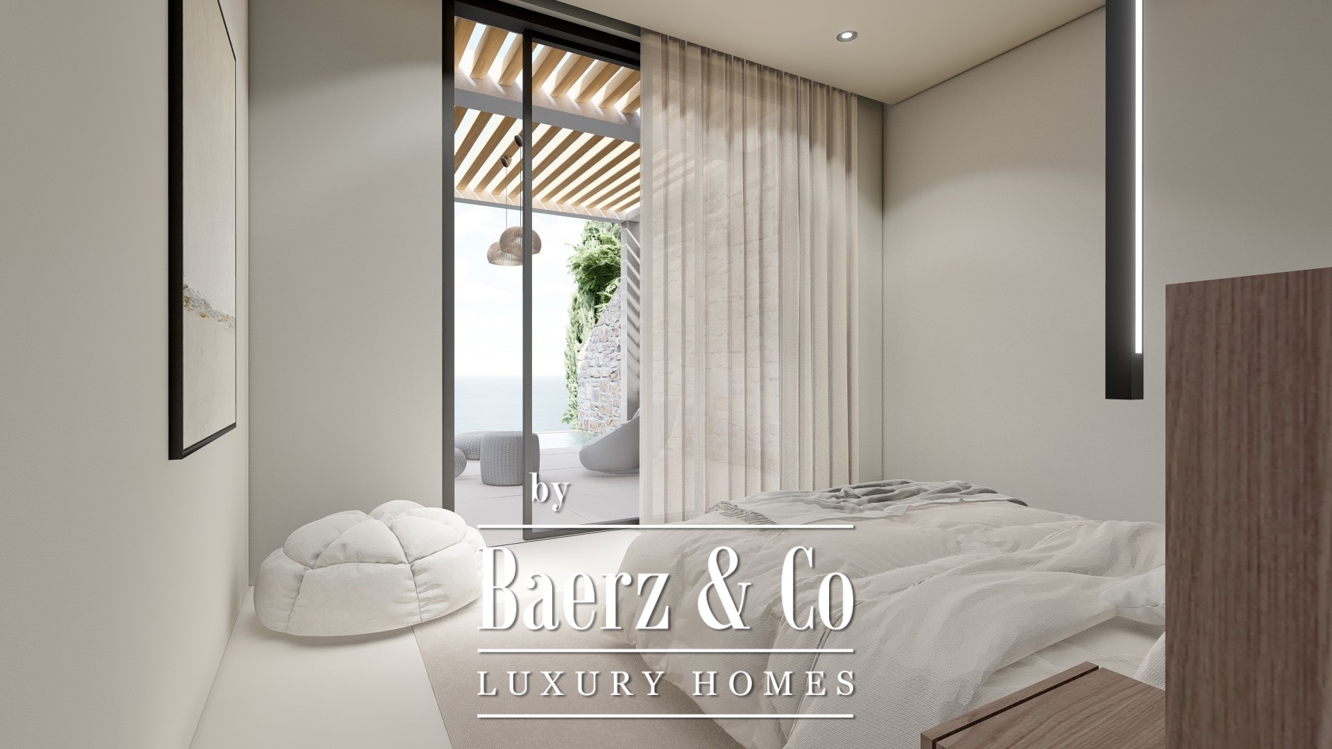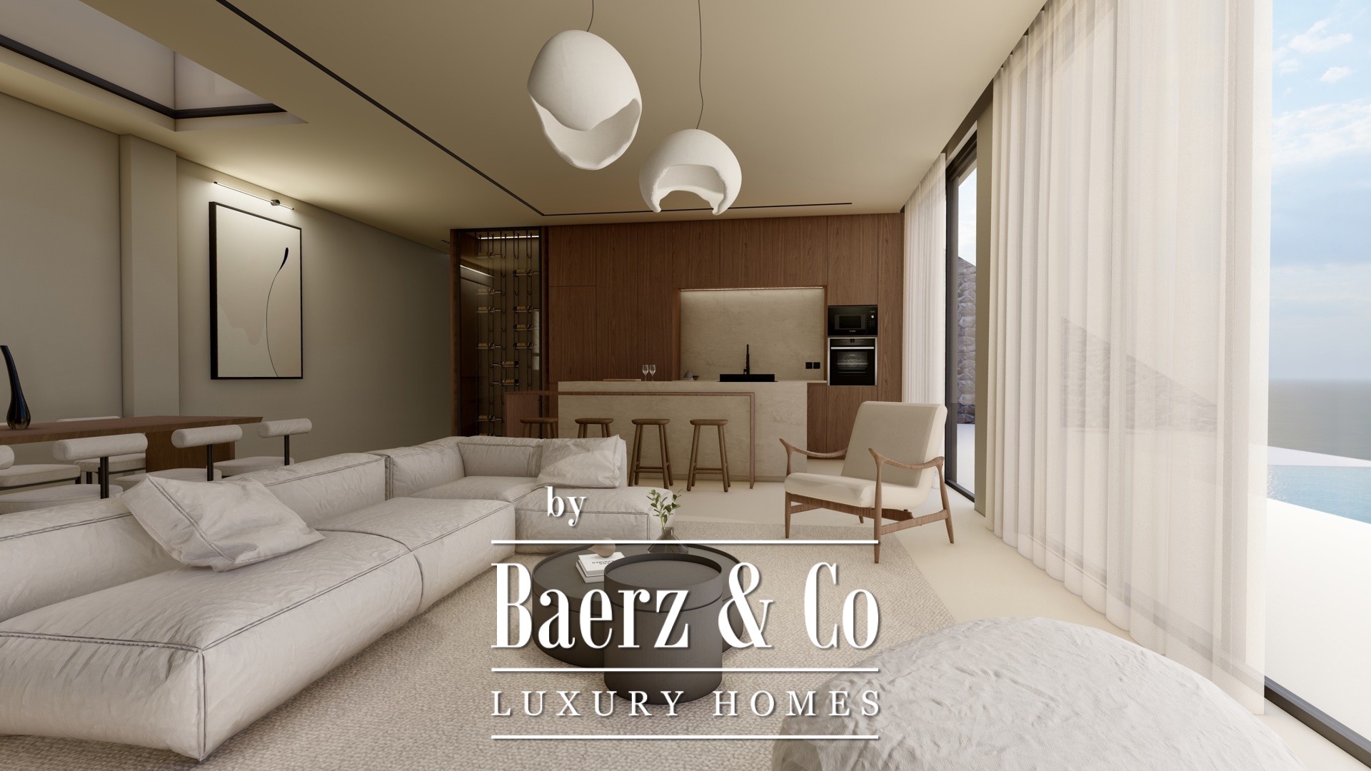 Gelegen op een perceel van 1.000 m², biedt de villa een totale woonoppervlakte van 180 m². Elke van de drie slaapkamers beschikt over een eigen badkamer en een inloopkast, wat privacy en comfort in balans brengt. Riante glaspartijen halen het zeezicht naar binnen in de open leefruimte, aangevuld met een slimme, volledig uitgeruste keuken en een aparte wijnkelder. Buiten wonen krijgt vorm naast een infinity zoutwaterzwembad, jacuzzi en een stenen terras met buitenhaard, allemaal op het Ionische uitzicht georiënteerd. Mediterrane beplanting en sfeervolle verlichting creëren rustige avonden, terwijl een buitendouche het zomerse gemak versterkt.