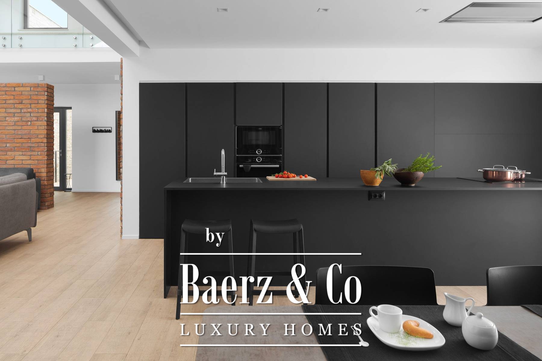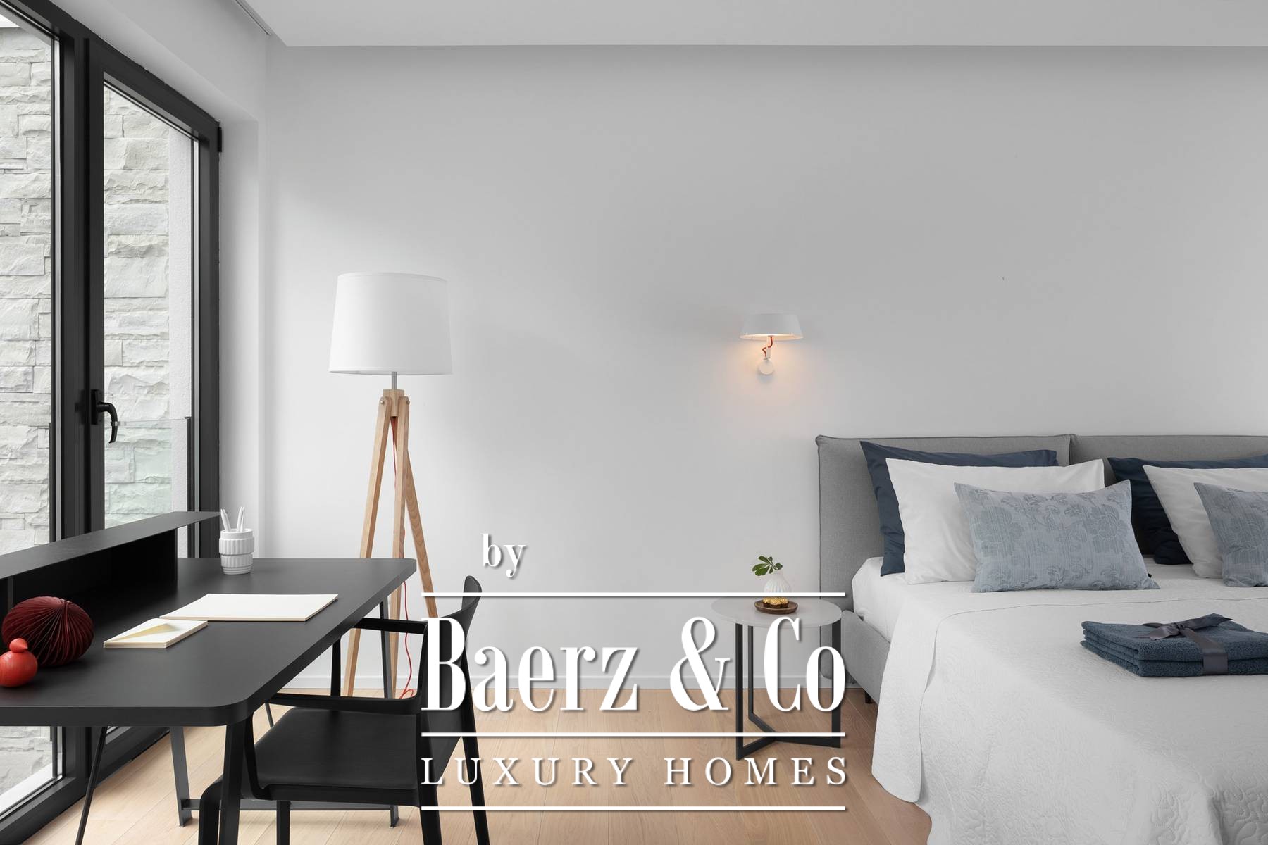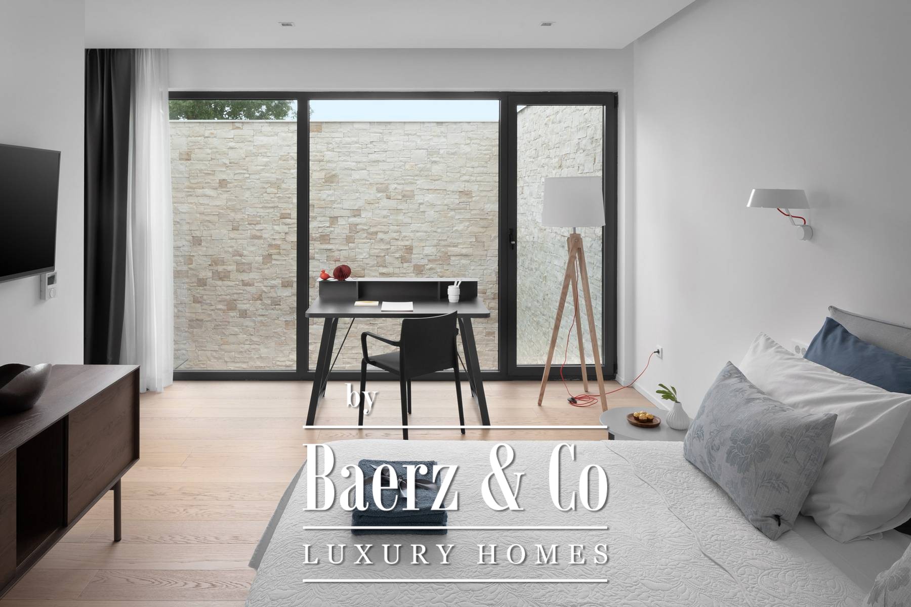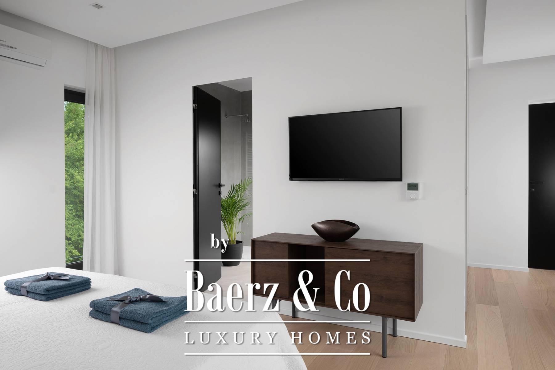 The upper floor has three en-suite bedrooms, all with an abundance of natural light through large panoramic glass doors that connect the interior space with the exterior.