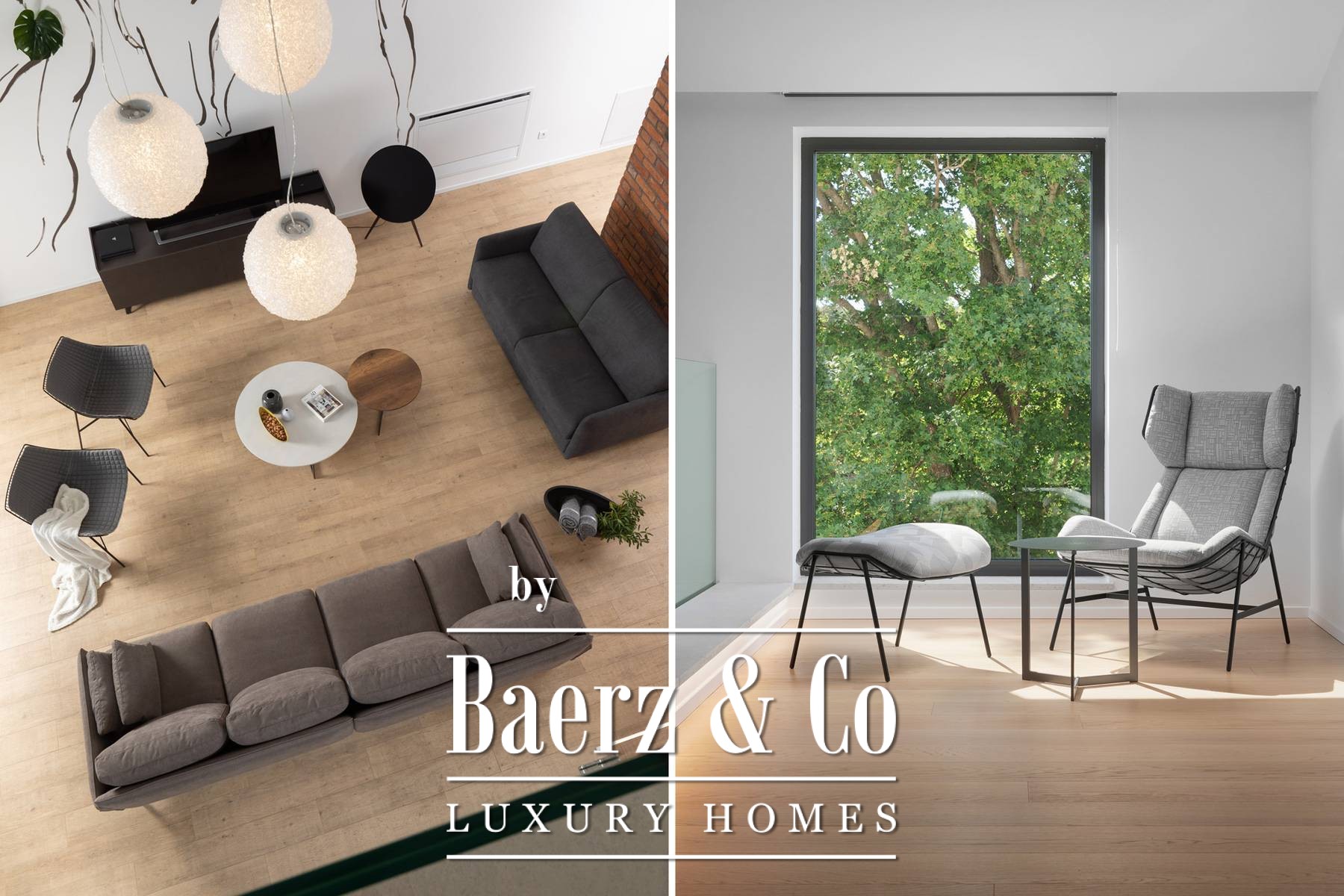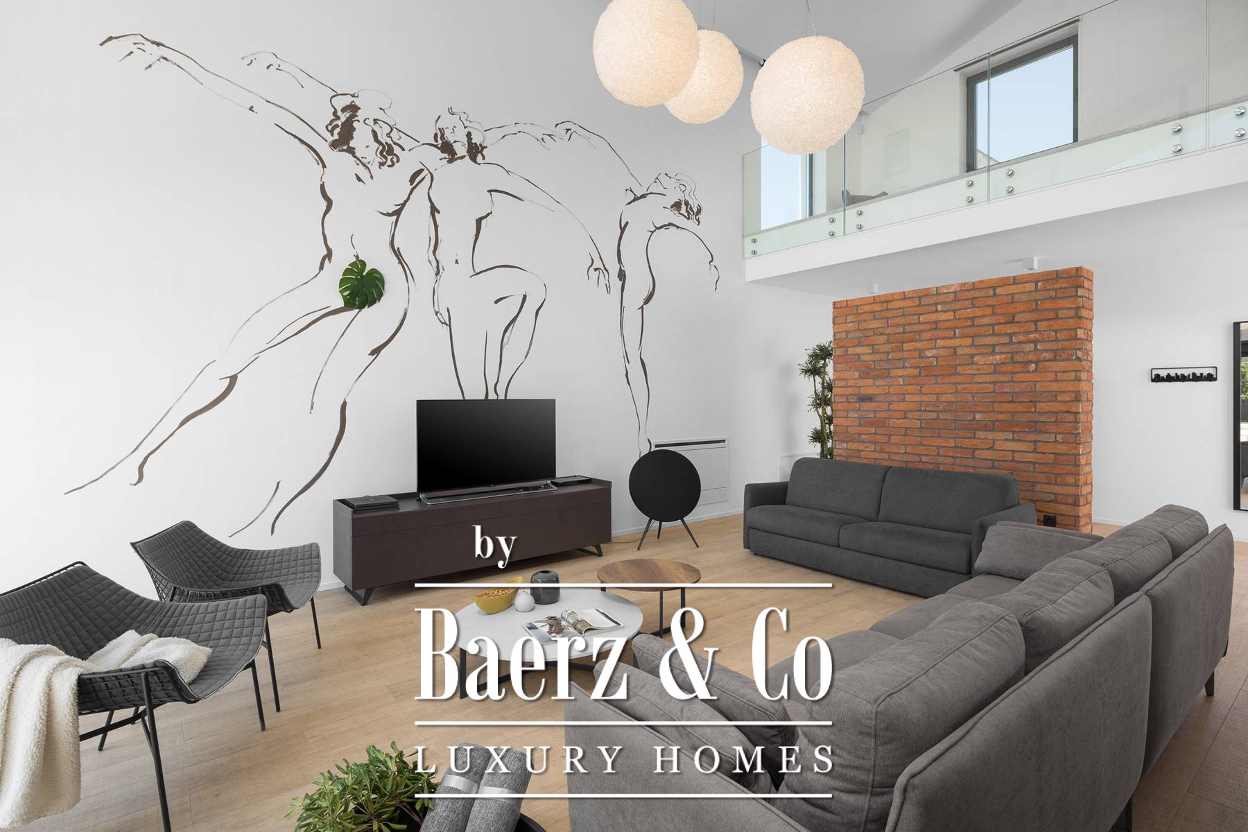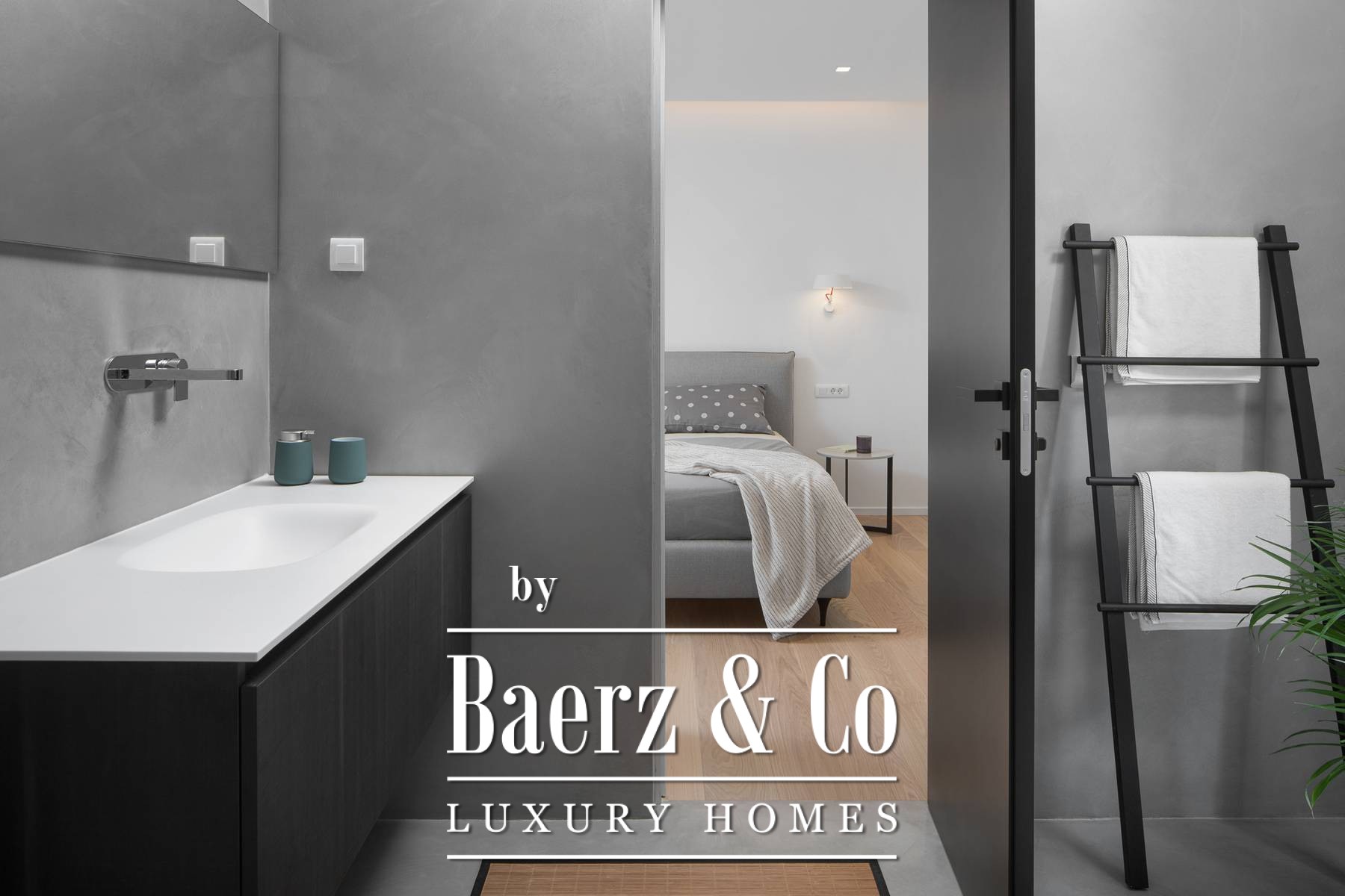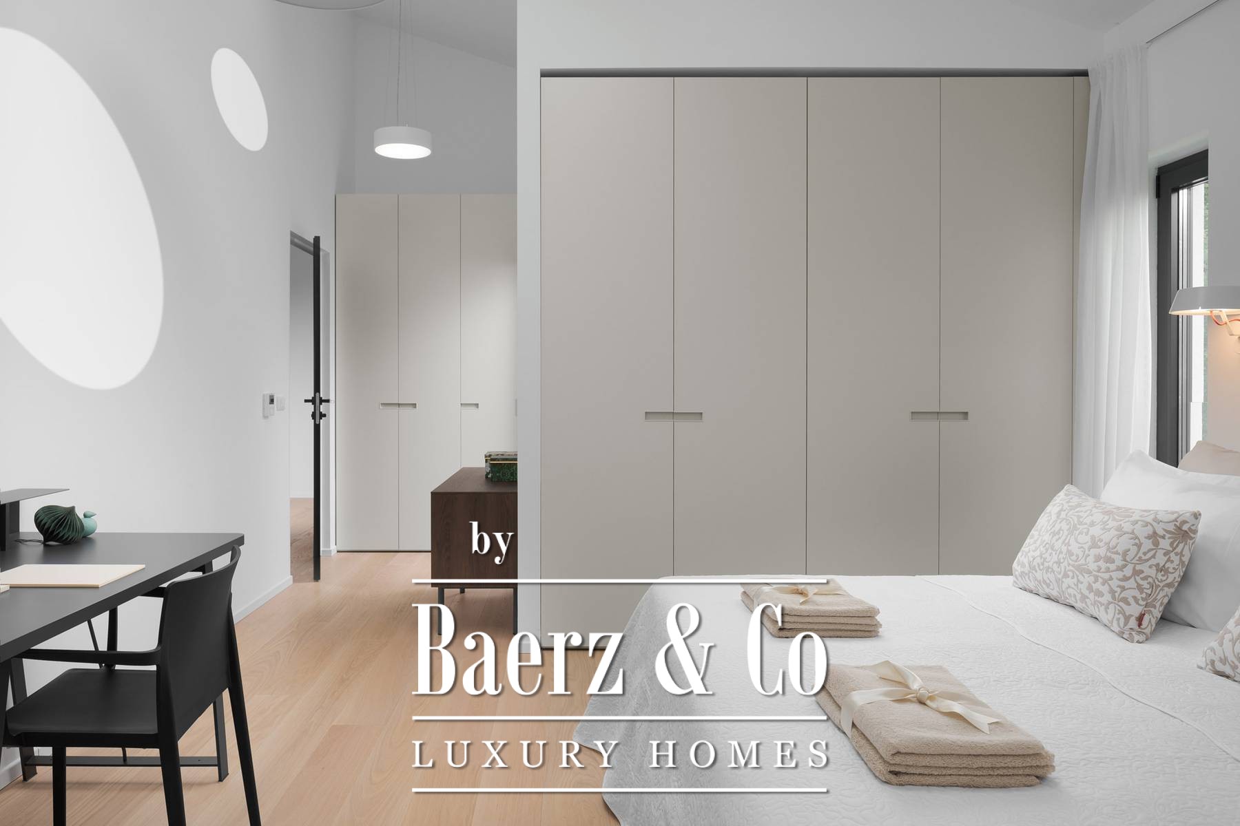 The upper floor has three en-suite bedrooms, all with an abundance of natural light through large panoramic glass doors that connect the interior space with the exterior.