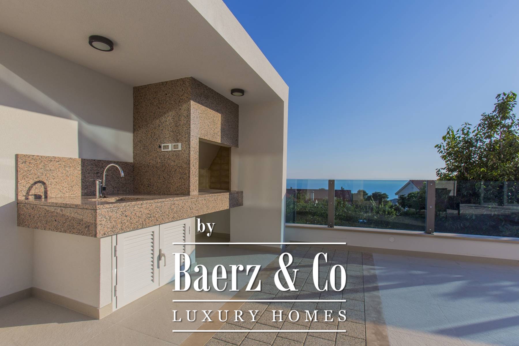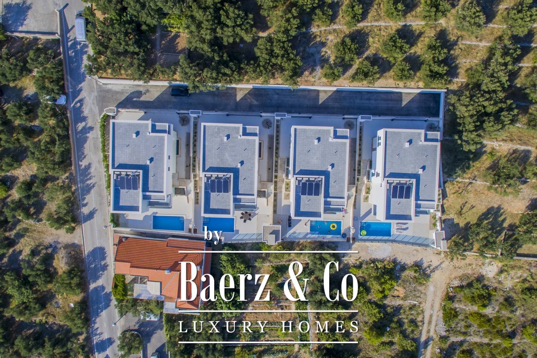 Villa 4 of about 350m2 (basement, ground floor and first floor), and the area of the plot is about 420m2.The villa has an open view of the sea and islands on one side and the mountain Biokovo on the other.The whole complex is carefully designed and fully equipped with all the facilities and equipment needed for housing and many additional benefits.So, the villa has an aesthetically pleasing landscaped garden with its own pool and outdoor fireplace.In the basement there is a large living room with kitchen equipped with all appliances and utensils, bathroom with washing machine, sauna with bathroom, gym, two smaller storage rooms and a boiler room for heating and cooling.A staircase lined with stone leads to the ground floor where the main entrance to the villa and an automated garage for two vehicles.The ground floor of the villa also consists of another, equally large, decorated living room and kitchen with terrace and open views of the sea and islands and