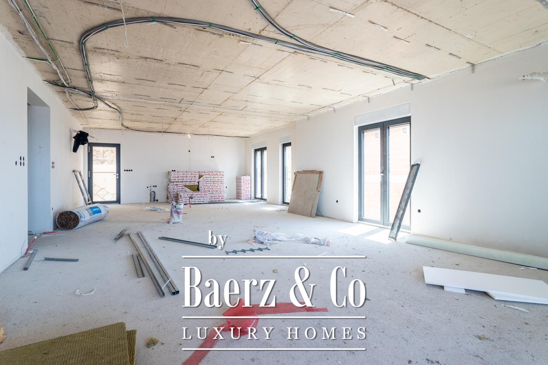 De indeling biedt een evenwicht tussen royale entertainmentruimtes en stille retreats, en integreert een gang, berging, wasruimte en een open keuken met eetgedeelte. Het interieur wordt gekenmerkt door eersteklas parket en keramiek, Schuco aluminium kozijnen en een hoog comfortniveau dankzij slimme domotica, vloerverwarming met warmtepomp en geavanceerde klimaatbeheersing. Er zijn twee beveiligde garageparkeerplaatsen beschikbaar voor aankoop.