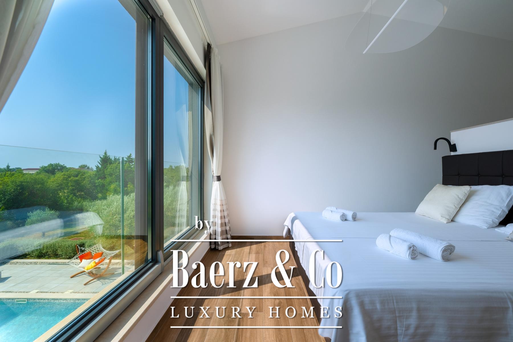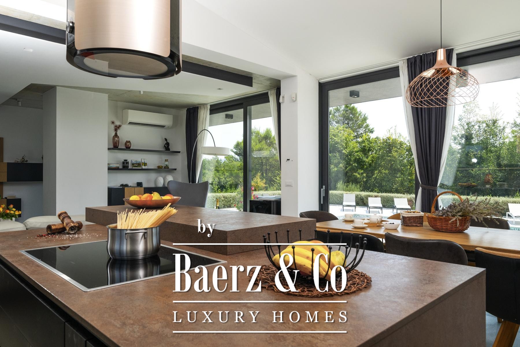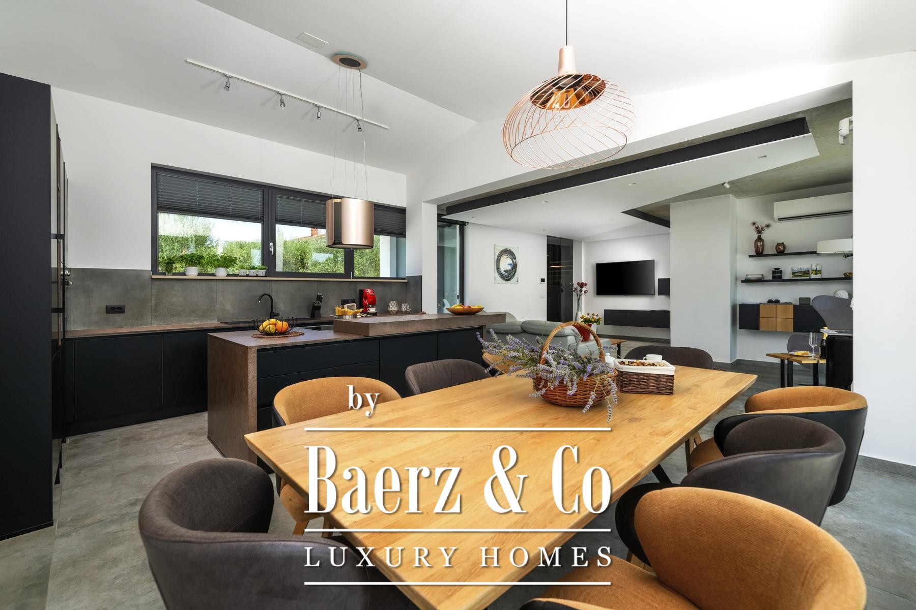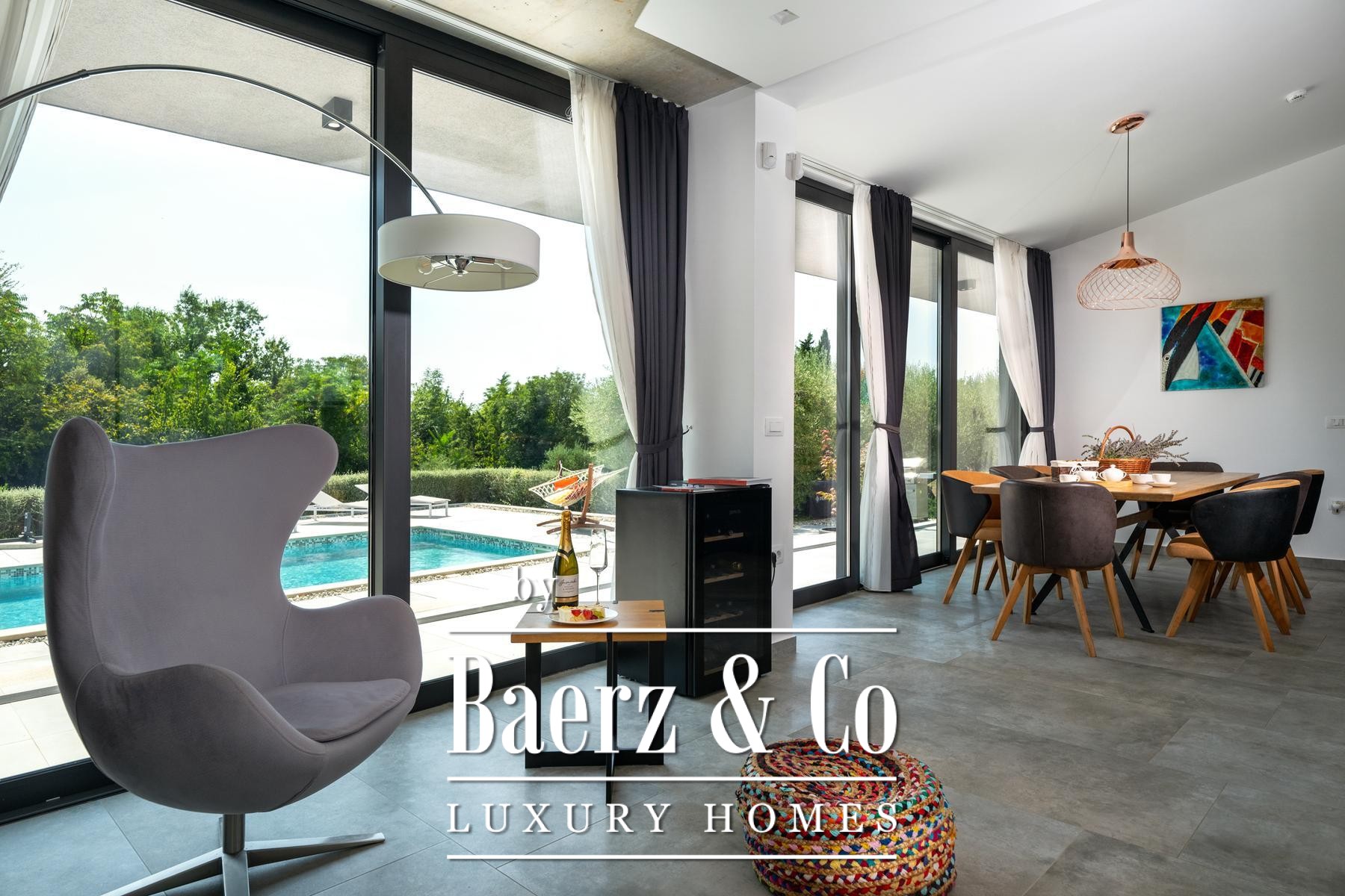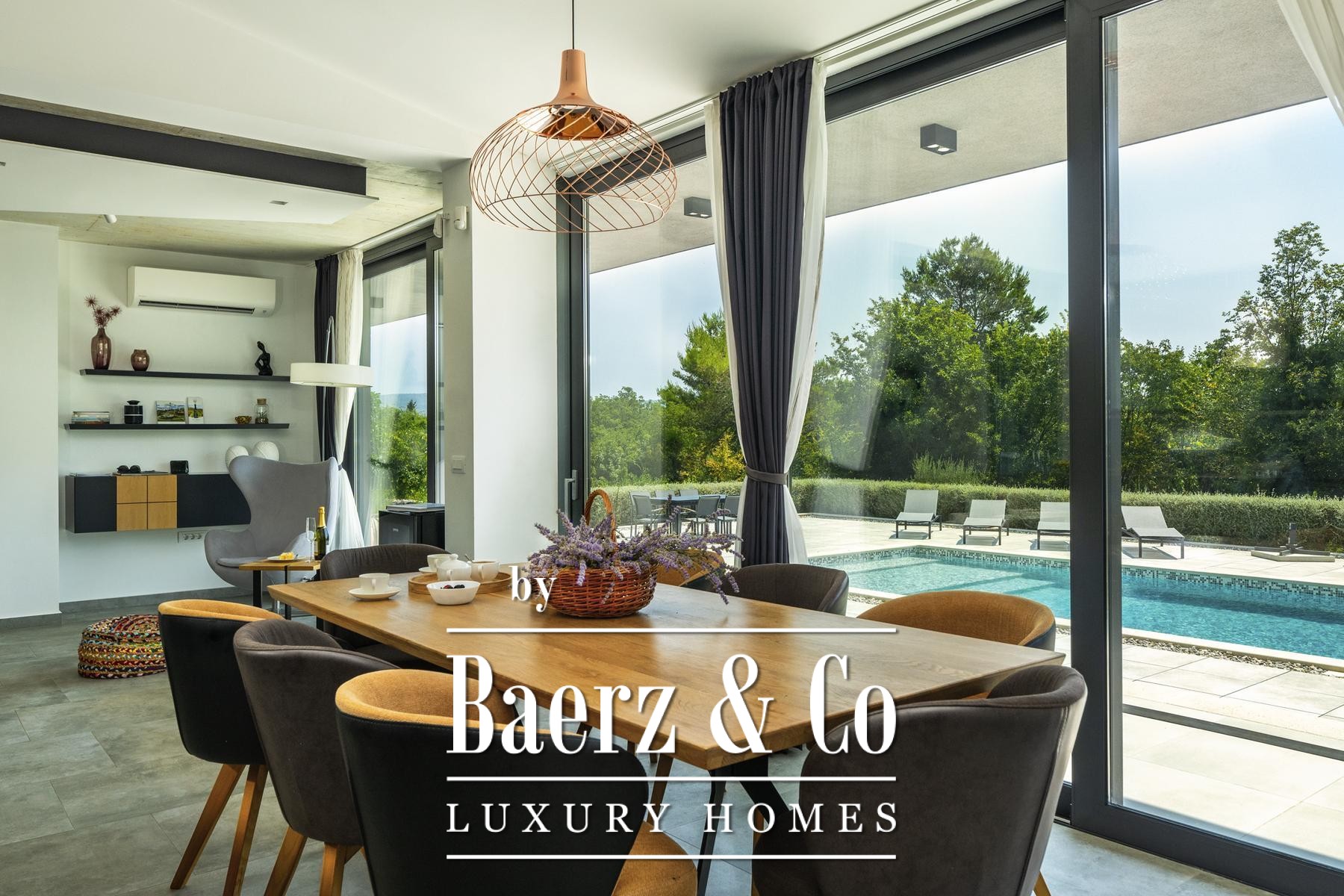 We are proud to present an ultra-modern villa located on the east coast of Istria between the popular cities of Labin and Pula. This stunning modern villa with a total area of 350 m2 is located in a quiet village, on a plot of land of up to 4000 m2. It is very exclusive and stylistically balanced.The heart of the villa lies in its open-concept living space, where the fully equipped Celine kitchen, dining room, and living room blend seamlessly. The ground floor, decorated with a large glass wall, offers a unique dining experience with a picturesque view of the pool and greenery - a perfect blend of sophistication and nature. On the ground floor, there are also 2 bedrooms, each with its bathroom and access to the swimming pool and sunbathing area, a laundry room and toilet, and a playroom that has all the necessary installations for a Wellness oasis. Ascending an elegant solid wood staircase to the first floor, we are greeted by a gallery, perfect for those looking for a quiet workspace. On this level, there are two more bedrooms, each with its bathroom, with a beautiful view of the greenery and Učka. The rooms on the first