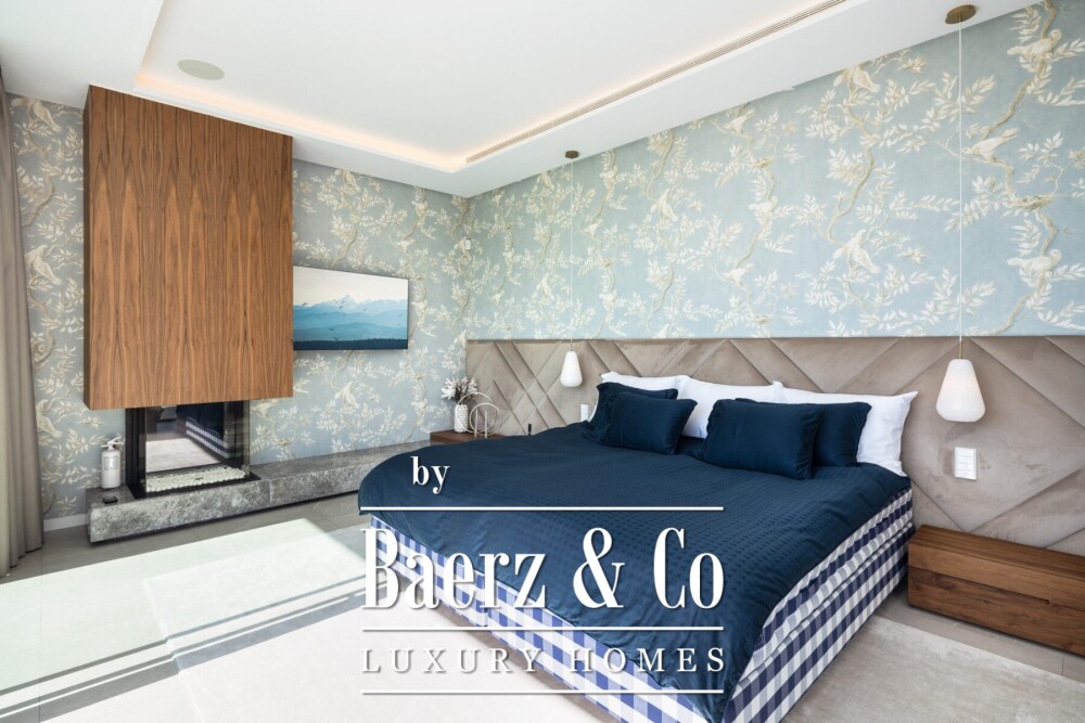 Het hart van het huis wordt gevormd door een verfijnde Gaggenau-keuken die elegant aansluit op de woon- en eetruimtes, gekenmerkt door hoge plafonds en een eigentijdse haard. Grote glazen wanden halen het mediterrane buitenleven naar binnen en laten het zachte licht en de ononderbroken vergezichten in elke ruimte binnenstromen. De woonomgeving is afgestemd op comfort, of u nu ontspannen bij de haard zit of gasten ontvangt in het open plan.