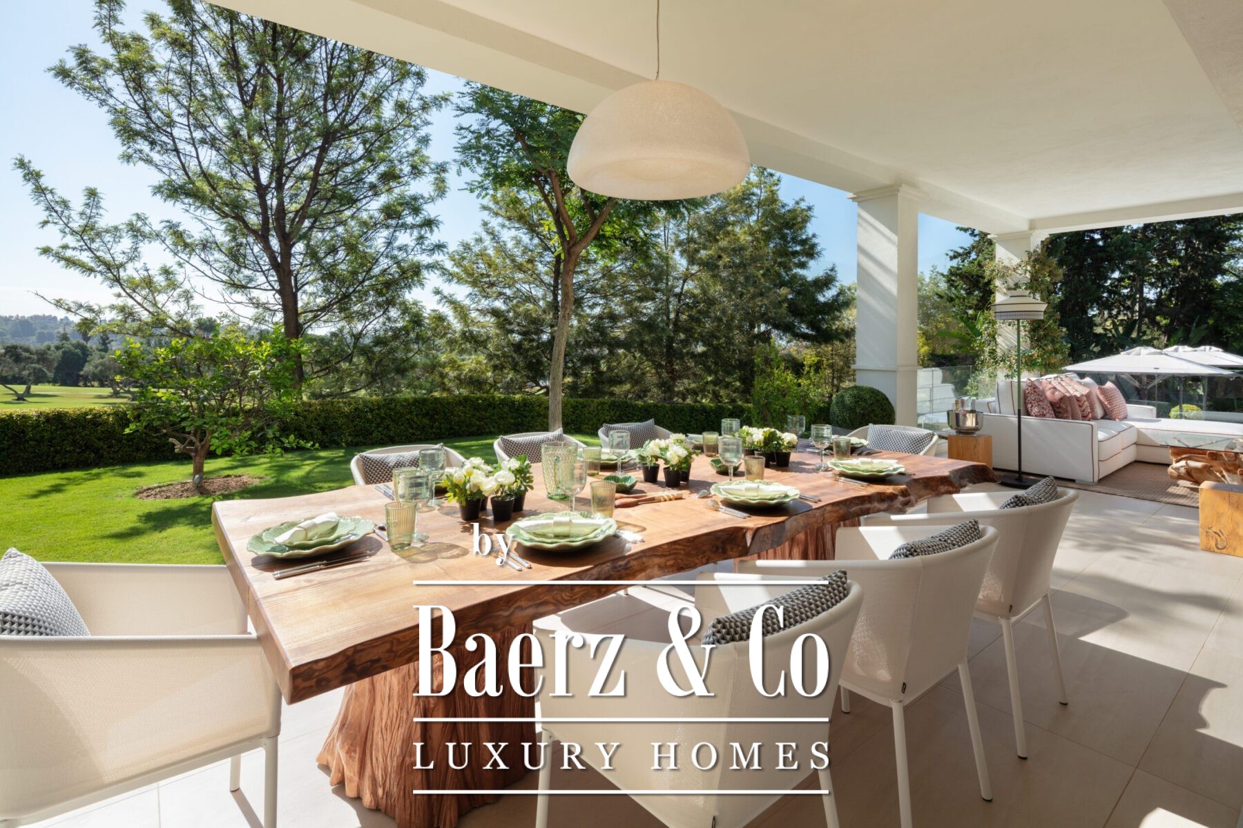 A private oasis nestled in the luxurious area of Marbella's Golf Valley. This magnificent mansion sits in a prestigious gated community and boasts an enviable front-line position overlooking Aloha Golf Course. Its timeless exterior and top-of-the-line interior finishes strike the perfect balance between classic elegance and modern sophistication. The property strikes a perfect balance between classic elegance and modern sophistication, featuring a timeless exterior and top-of-the-line interior finishes. The colour pallet used to decorate the interior is soft and inviting, exuding a calming atmosphere that one expects when coming back home.