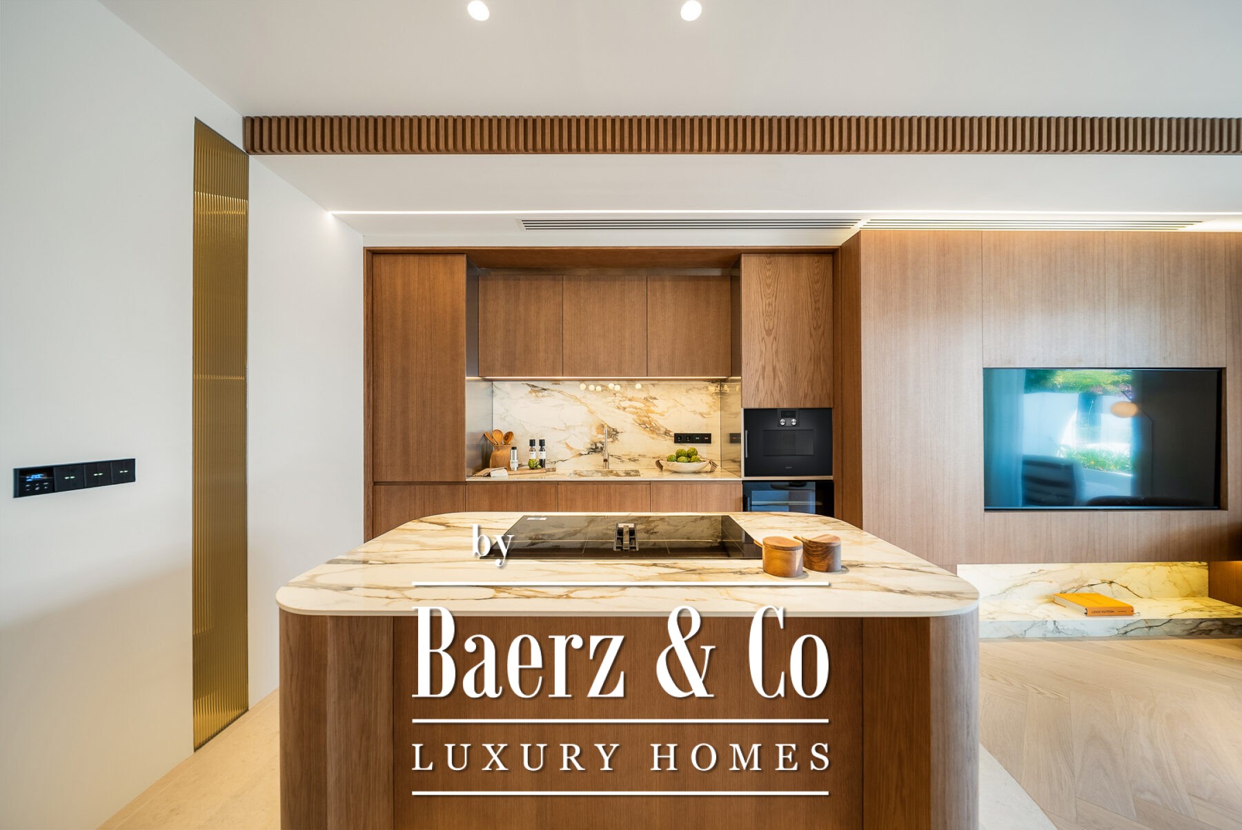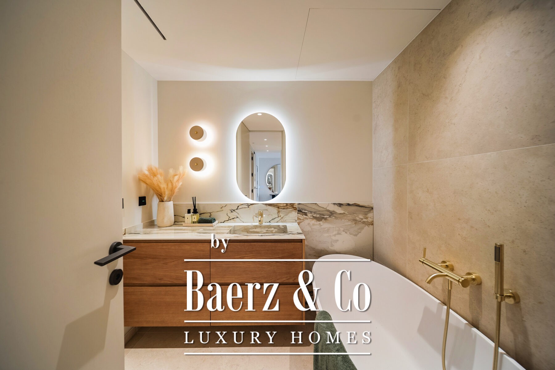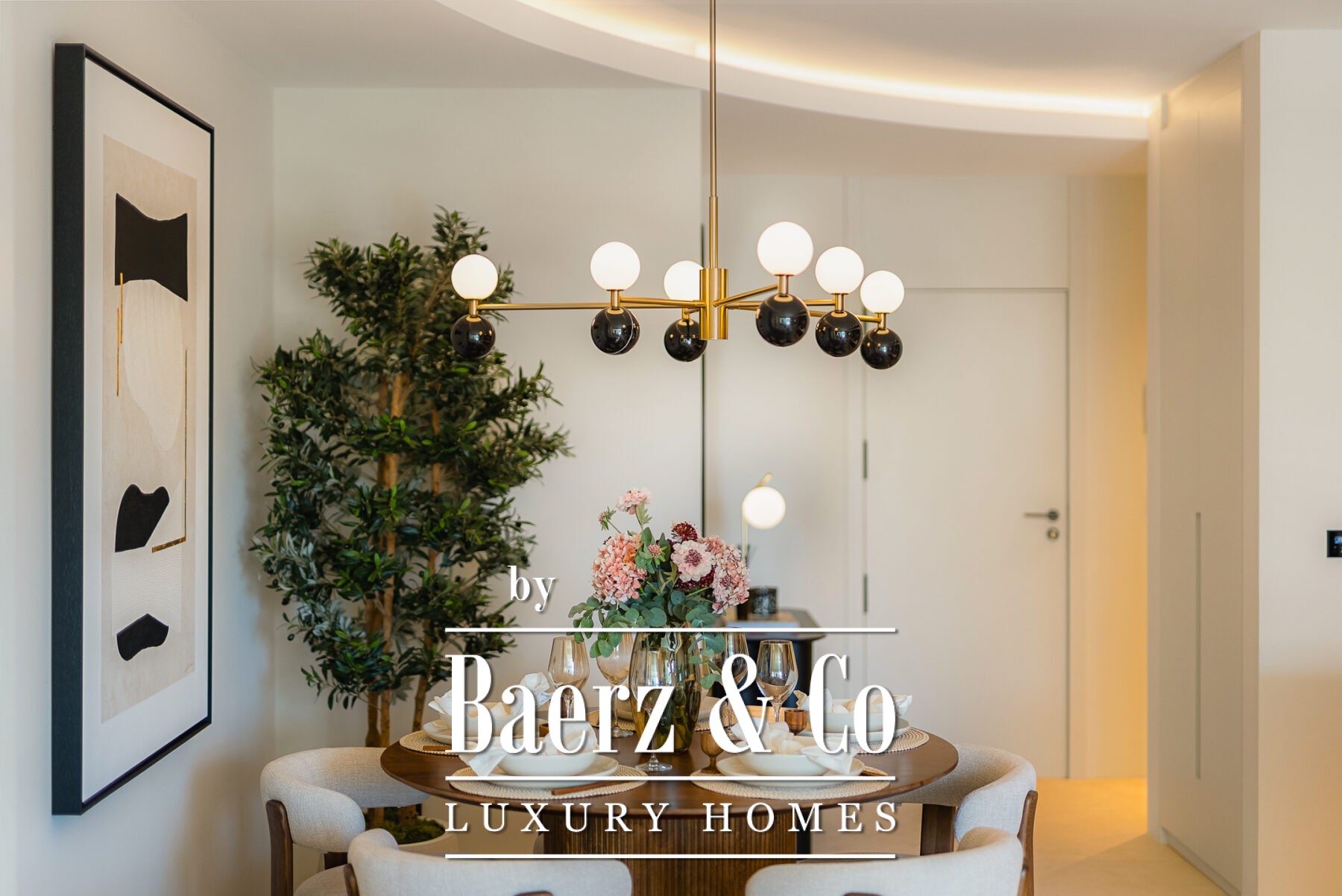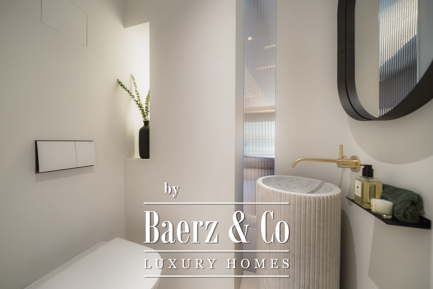 The home features top-tier finishes: Gaggenau and Siemens appliances, Dornbracht bathrooms, BOEN herringbone wood floors, underfloor heating, and smart home automation. Custom design details echo the building’s iconic round architecture, blending Mediterranean charm with contemporary elegance.