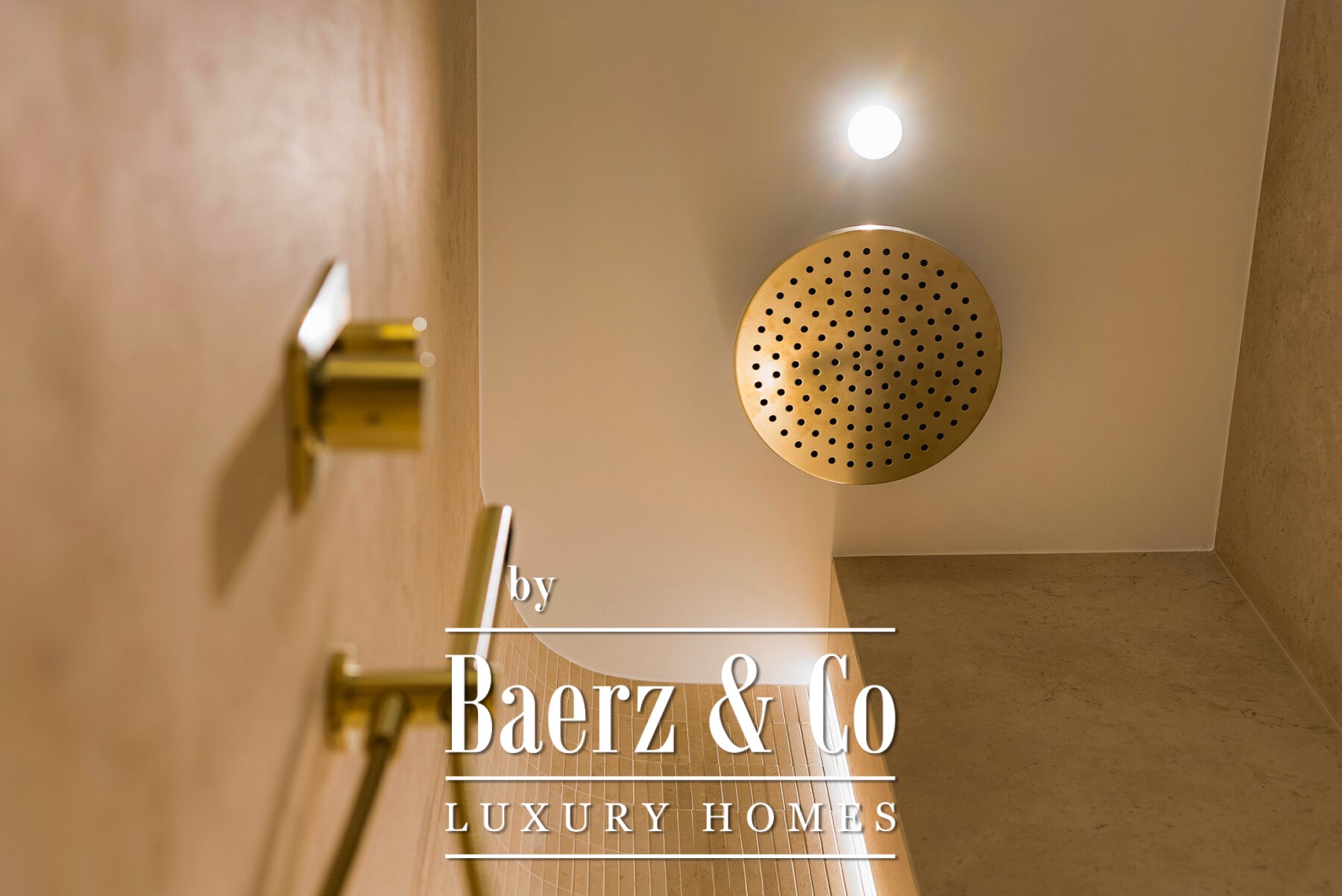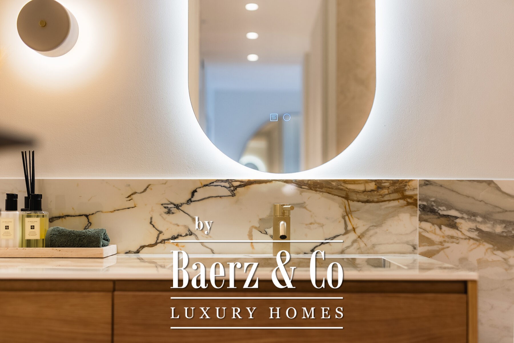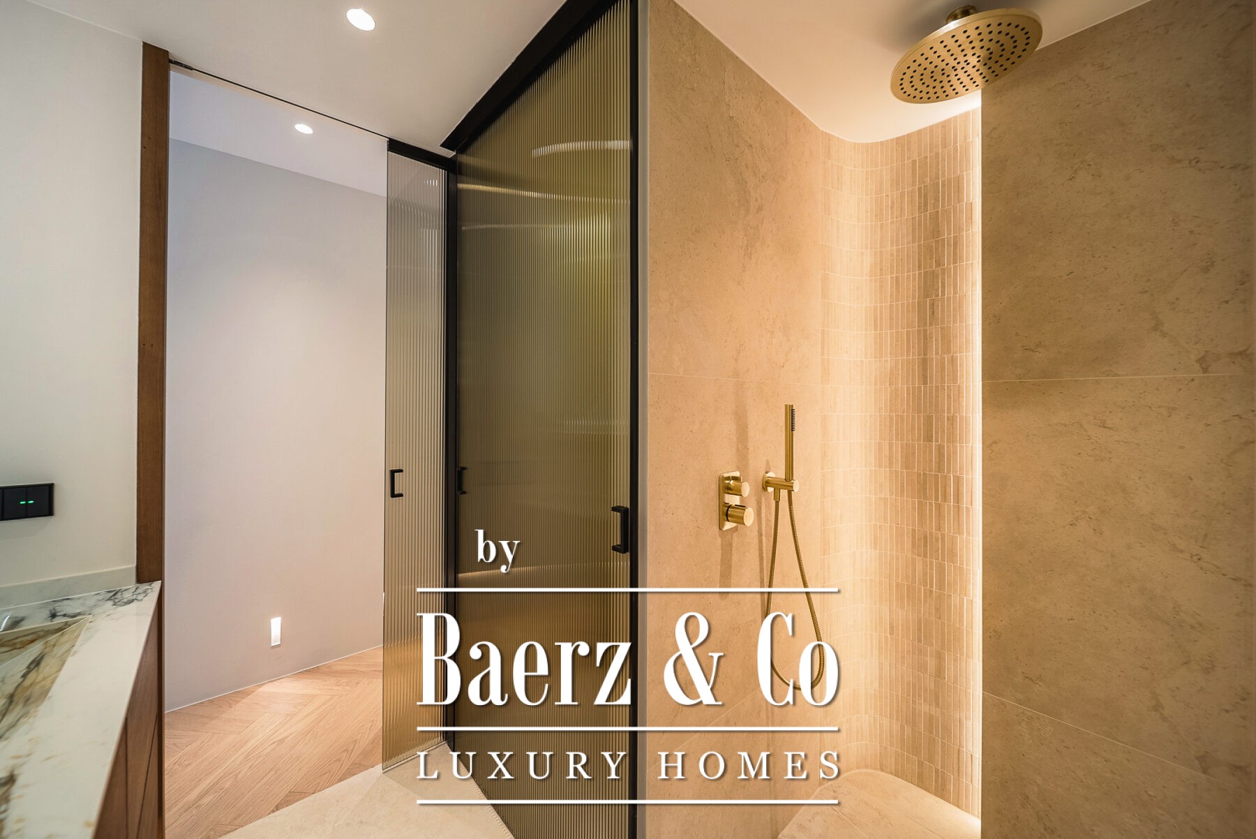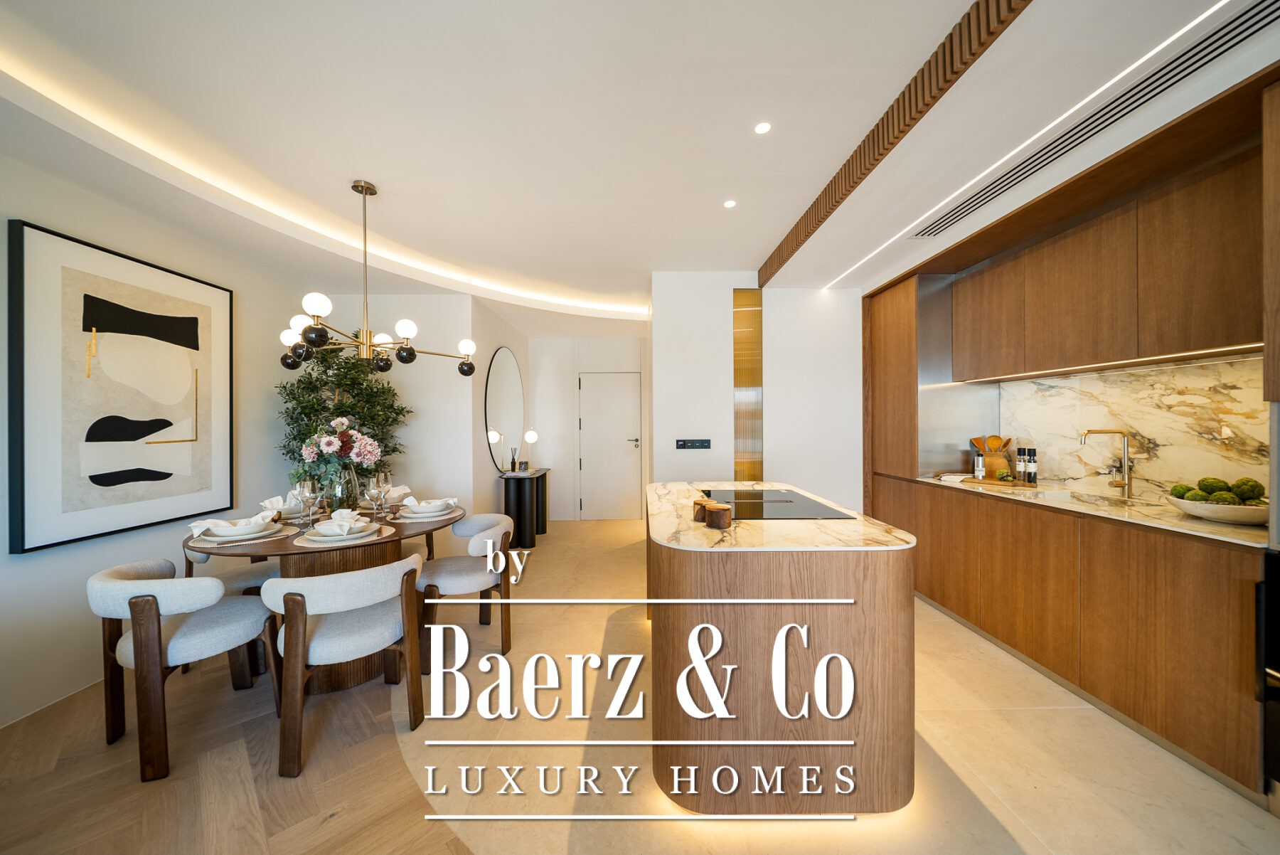 The home features top-tier finishes: Gaggenau and Siemens appliances, Dornbracht bathrooms, BOEN herringbone wood floors, underfloor heating, and smart home automation. Custom design details echo the building’s iconic round architecture, blending Mediterranean charm with contemporary elegance.