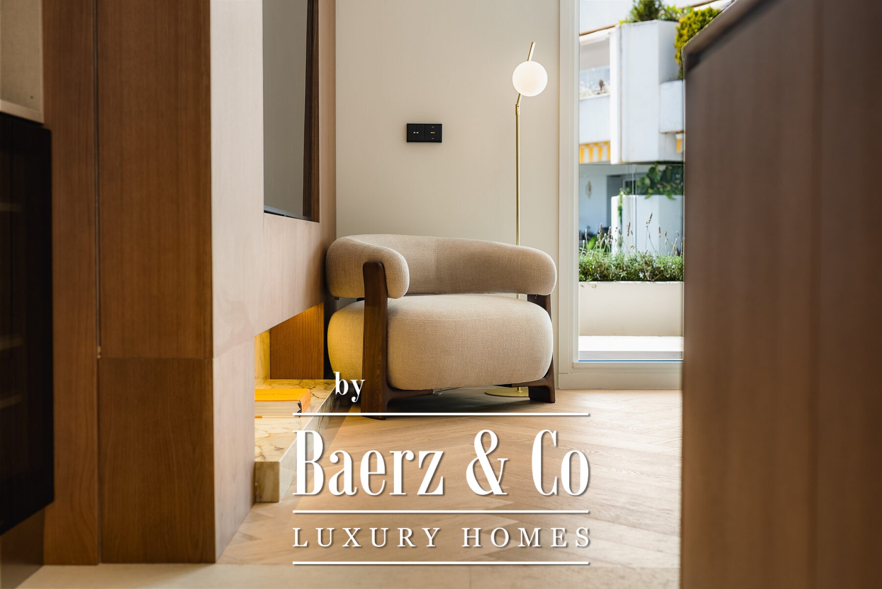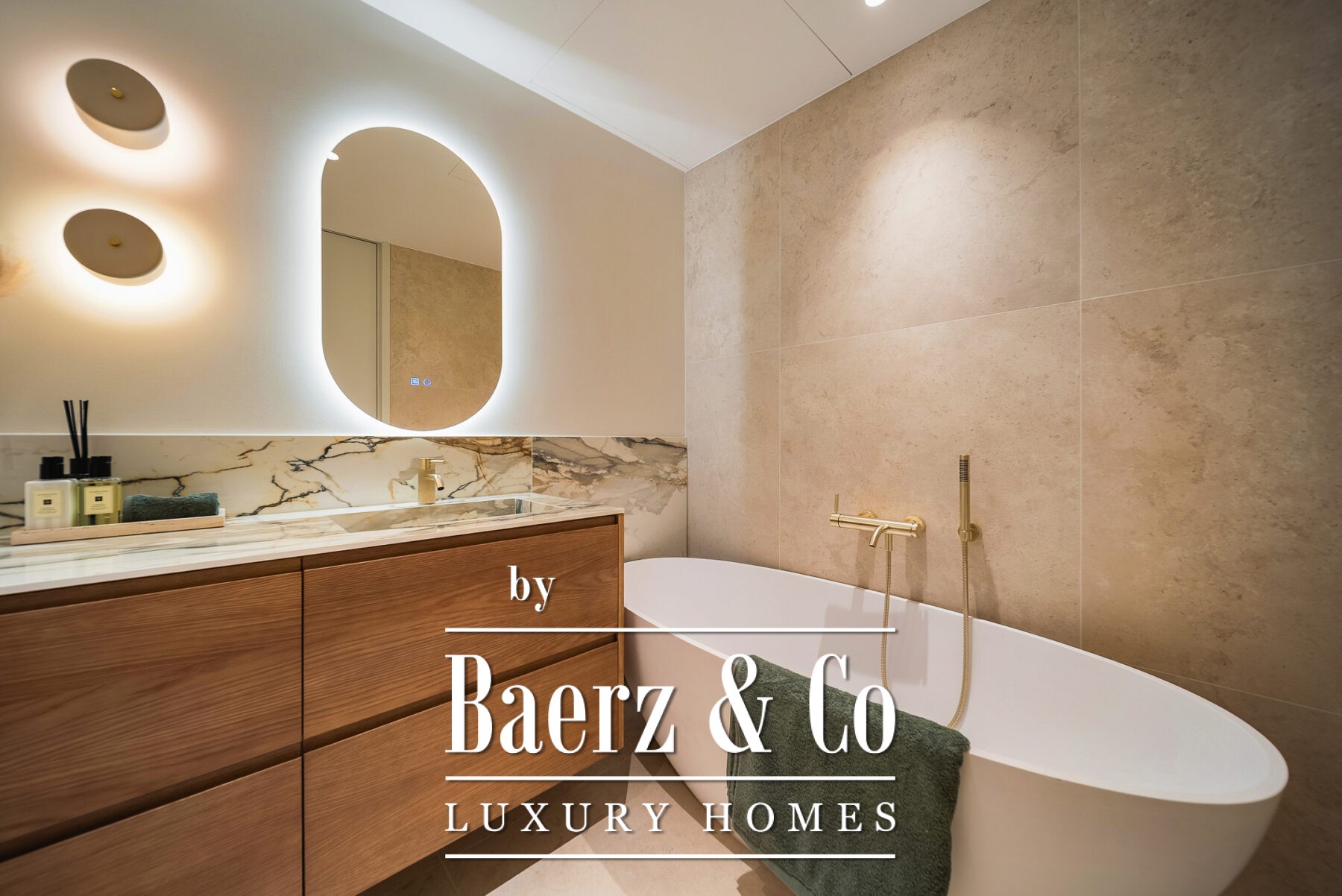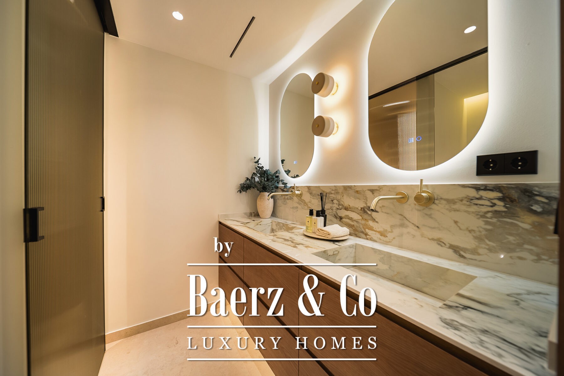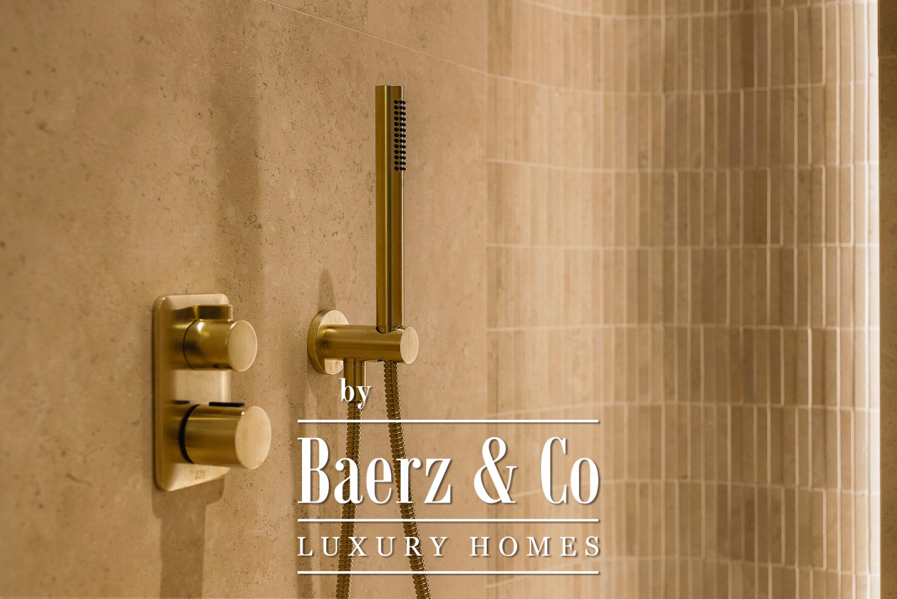 The home features top-tier finishes: Gaggenau and Siemens appliances, Dornbracht bathrooms, BOEN herringbone wood floors, underfloor heating, and smart home automation. Custom design details echo the building’s iconic round architecture, blending Mediterranean charm with contemporary elegance.
