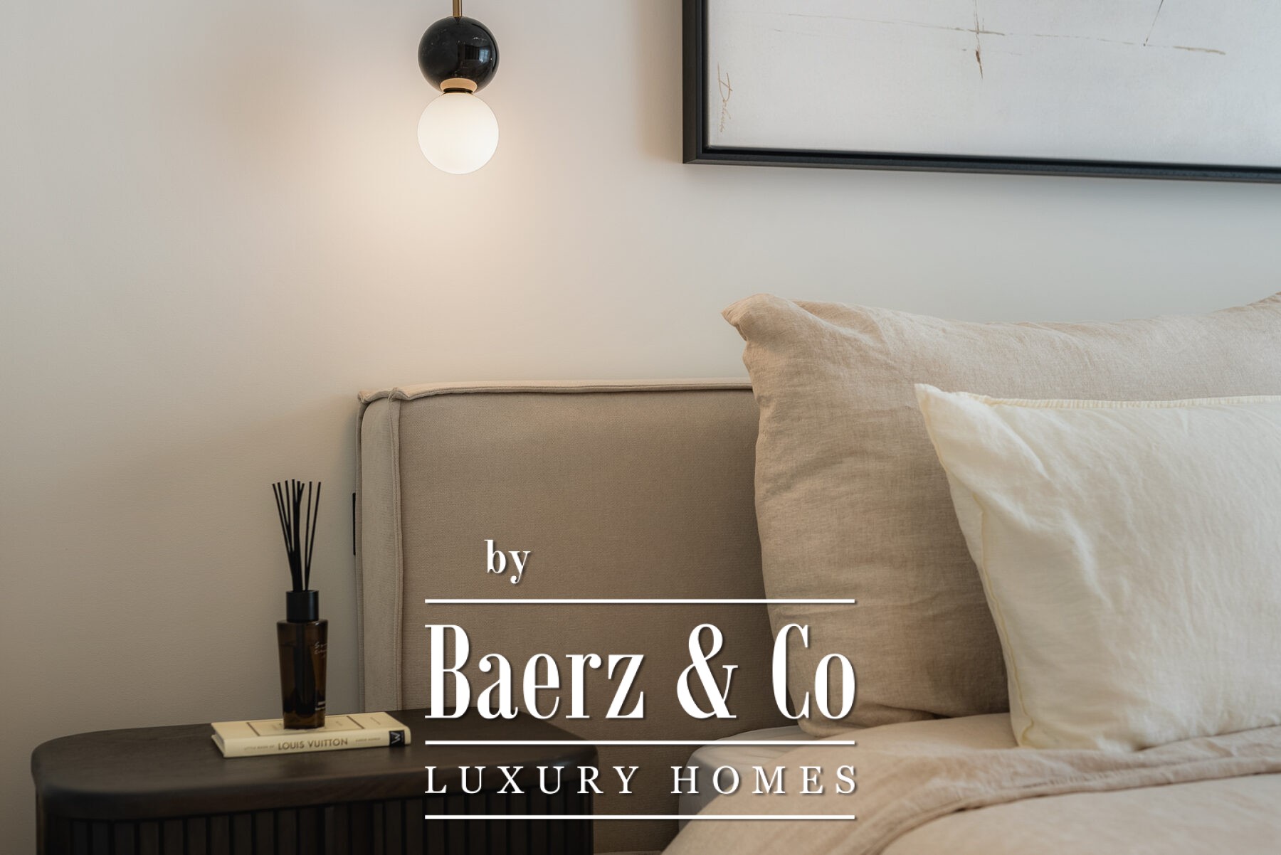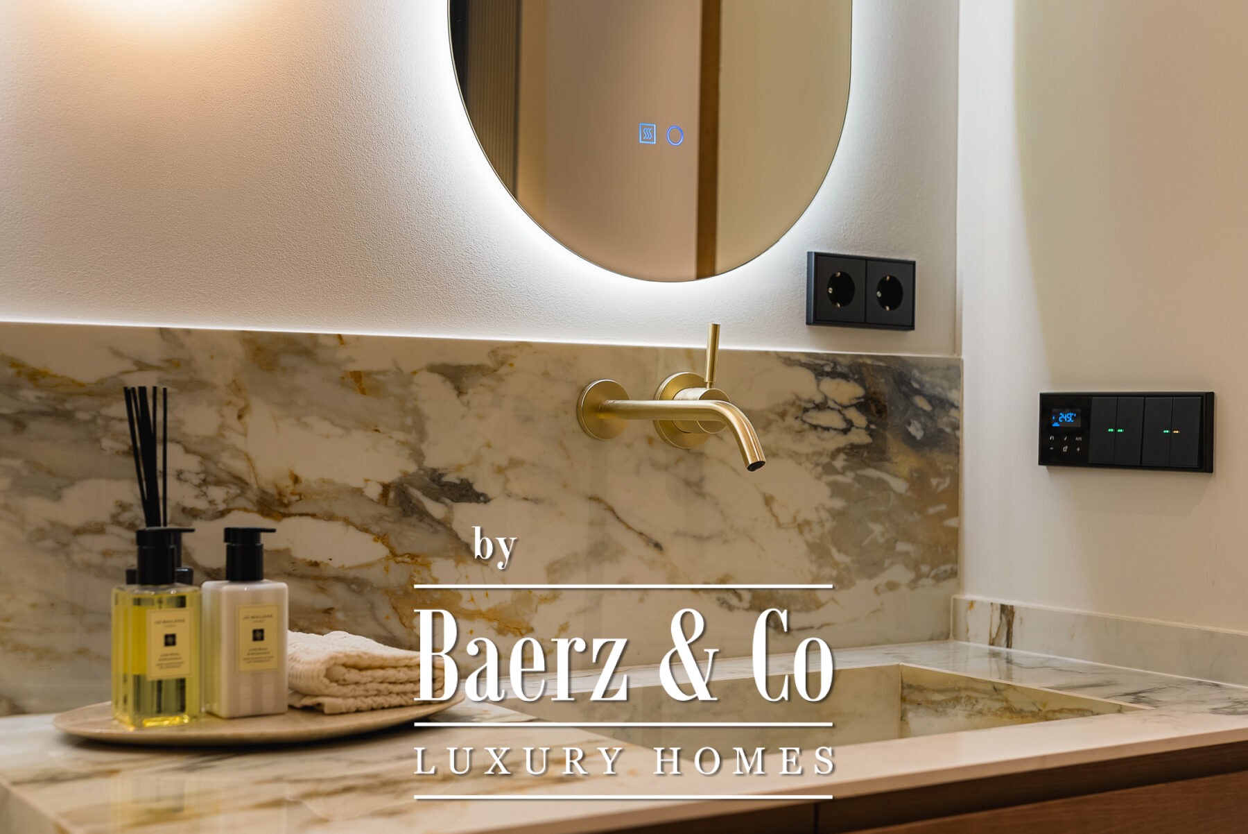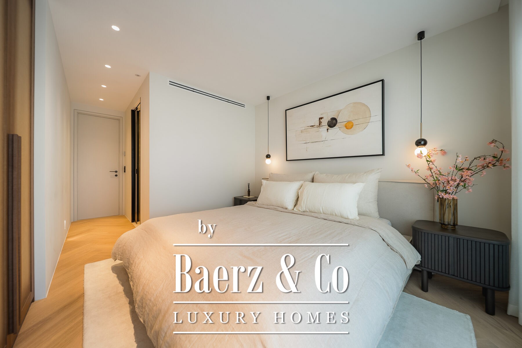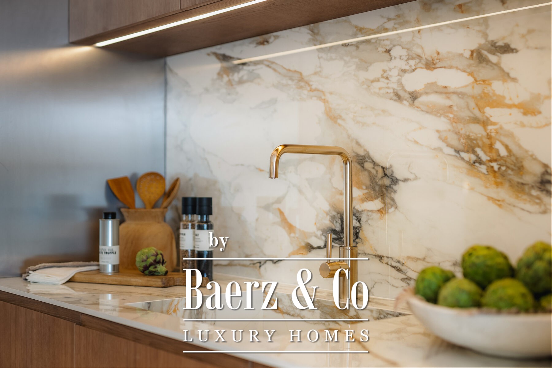 The home features top-tier finishes: Gaggenau and Siemens appliances, Dornbracht bathrooms, BOEN herringbone wood floors, underfloor heating, and smart home automation. Custom design details echo the building’s iconic round architecture, blending Mediterranean charm with contemporary elegance.