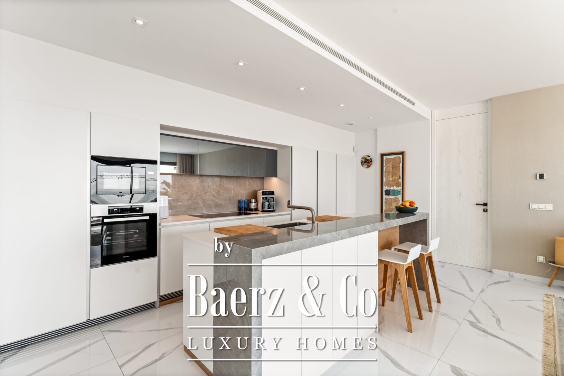 Binnen harmoniseren de open leefruimtes, eetkamer en keuken een moderne Scandinavische stijl met functionele verfijning. Kenmerken als plafondhoge deuren, Miele-apparatuur, stenen werkbladen, elektrische zonwering, vloerverwarming en een gastentoilet dragen bij aan een samenhangende en comfortabele sfeer. Twee ondergrondse parkeerplaatsen en een berging bieden praktische luxe.