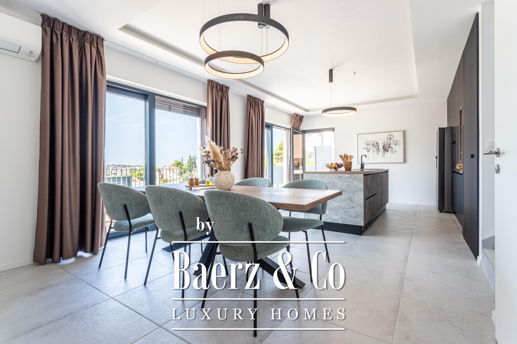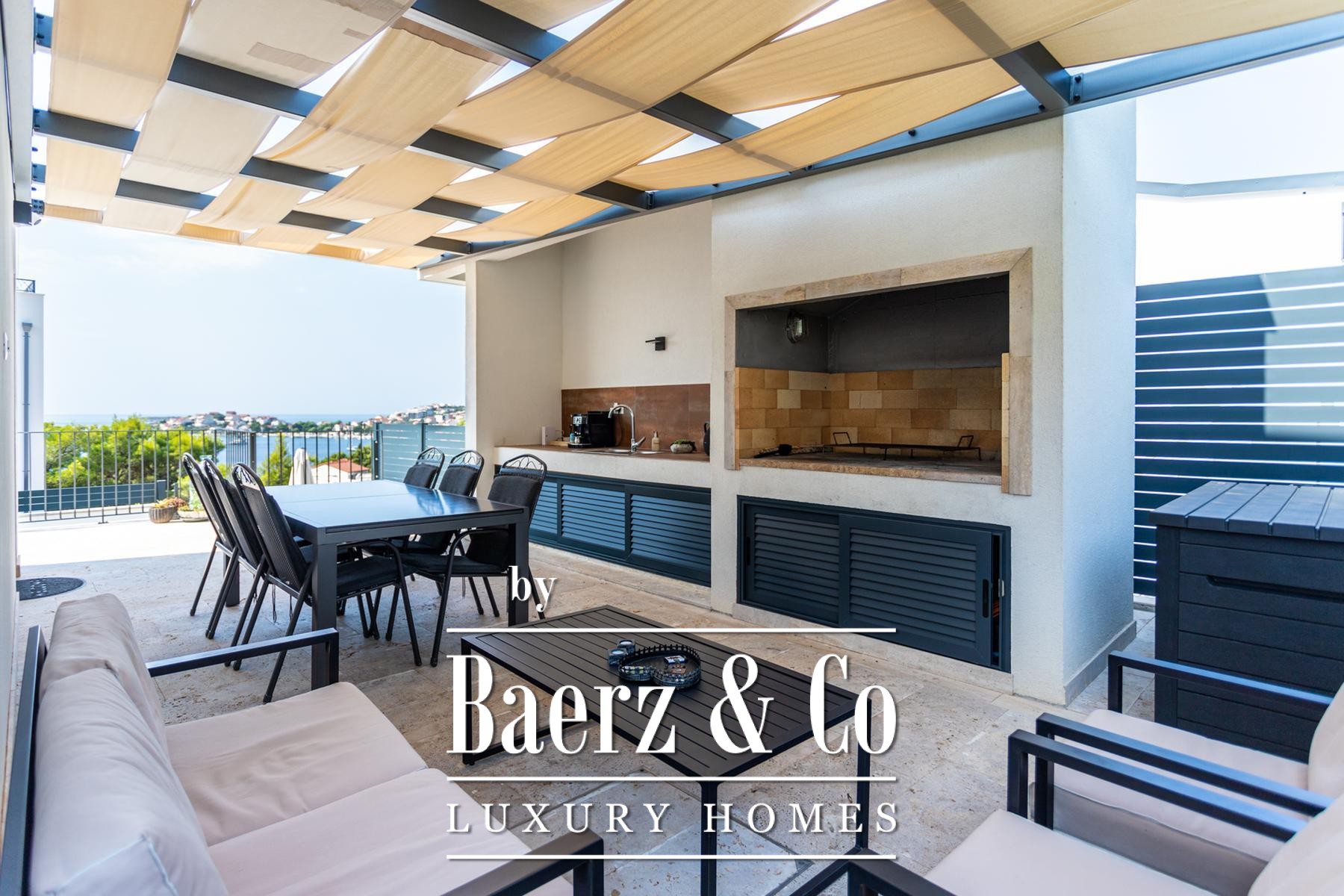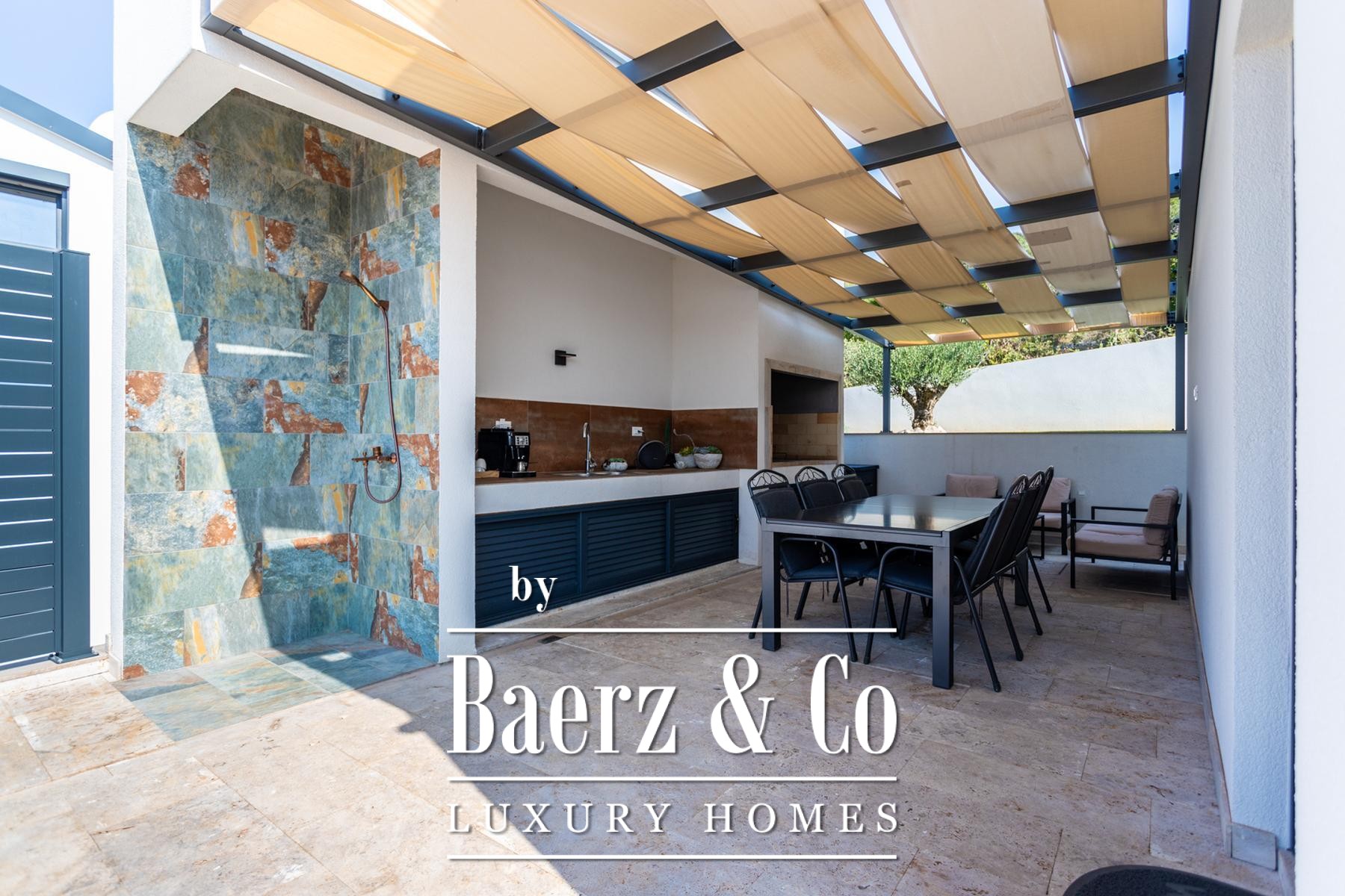Sevid by the sea, NEW BUILD, modern villa with a partial sea view, gross floor area 151 m², located on a 472 m² plot. Situated in Gamba Bay, 110 meters from the nearest beach and 1000 meters from the center of this popular tourist destination with markets, restaurants, and cafes. The villa is finished, furnished, and fully equipped, ready for occupancy or tourist rental. It has an occupancy permit. The property is built as a single residential unit consisting of a ground floor and an upper floor, with a landscaped yard—garden, terraces, a summer kitchen with a barbecue, and a pool of 21.60 m². **GROUND FLOOR:** Built-in wardrobe, entrance hall, toilet, fireplace, living room, dining area, part of the staircase, space under the