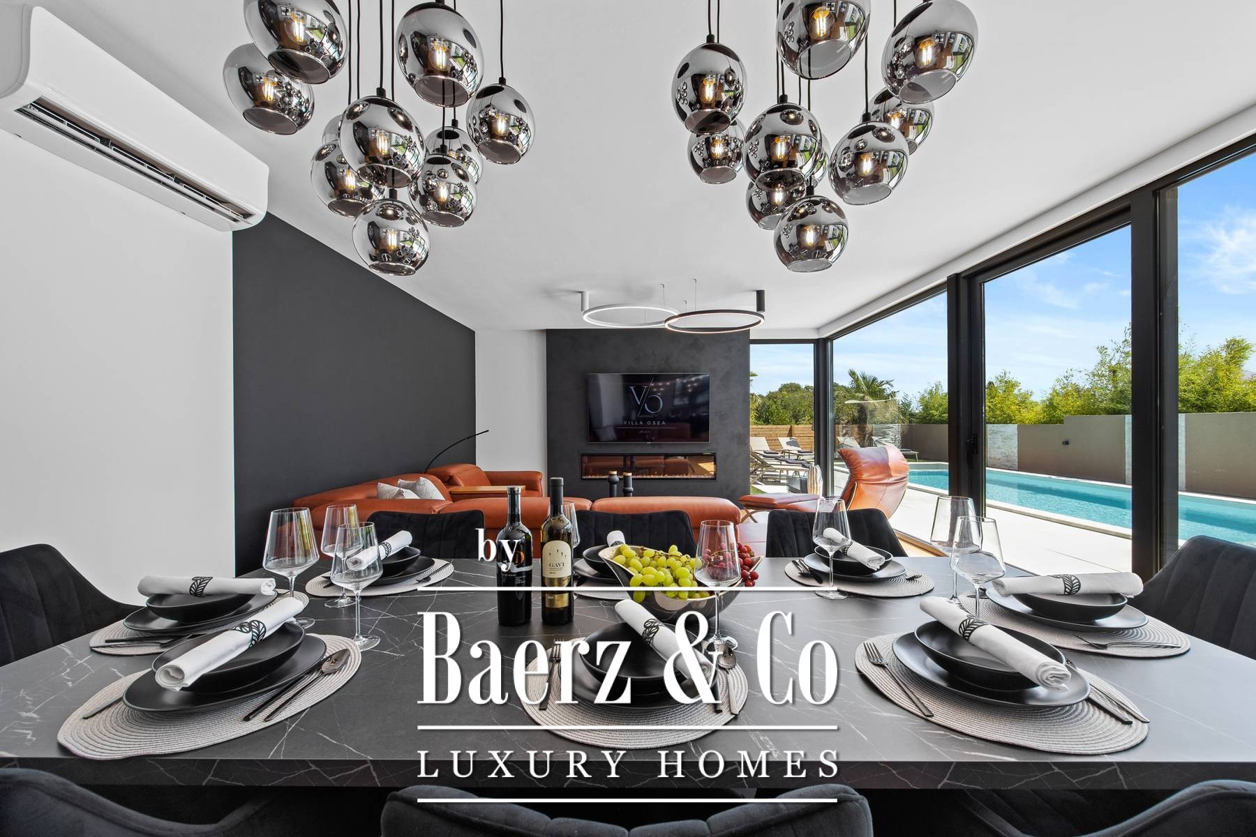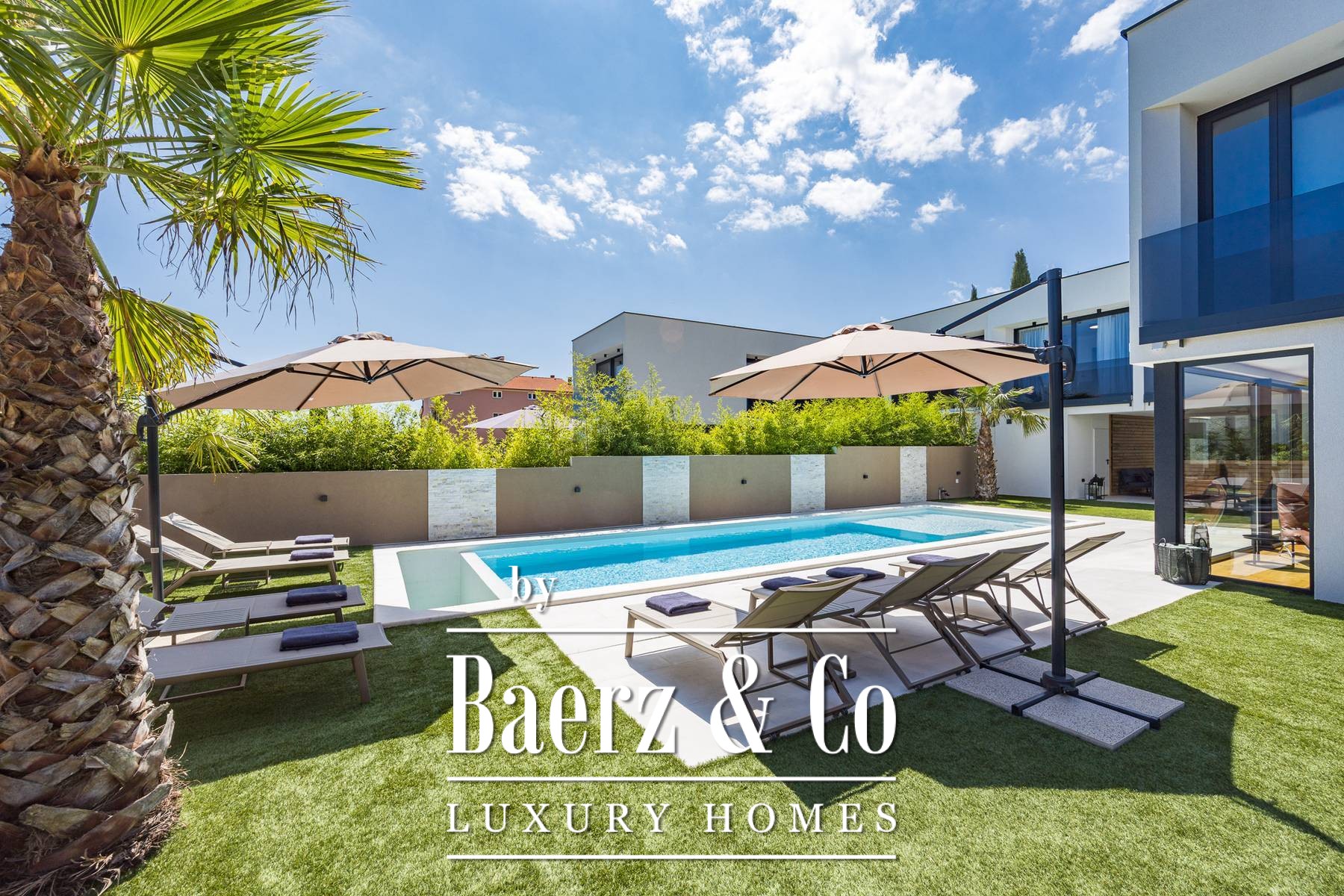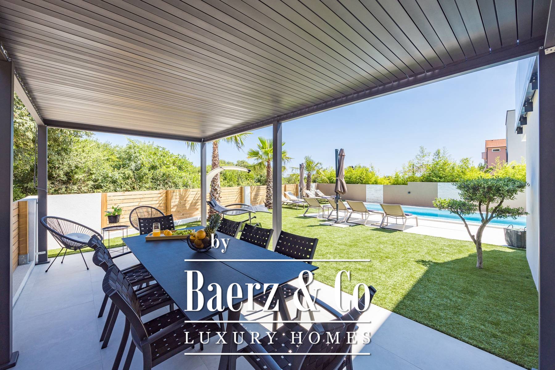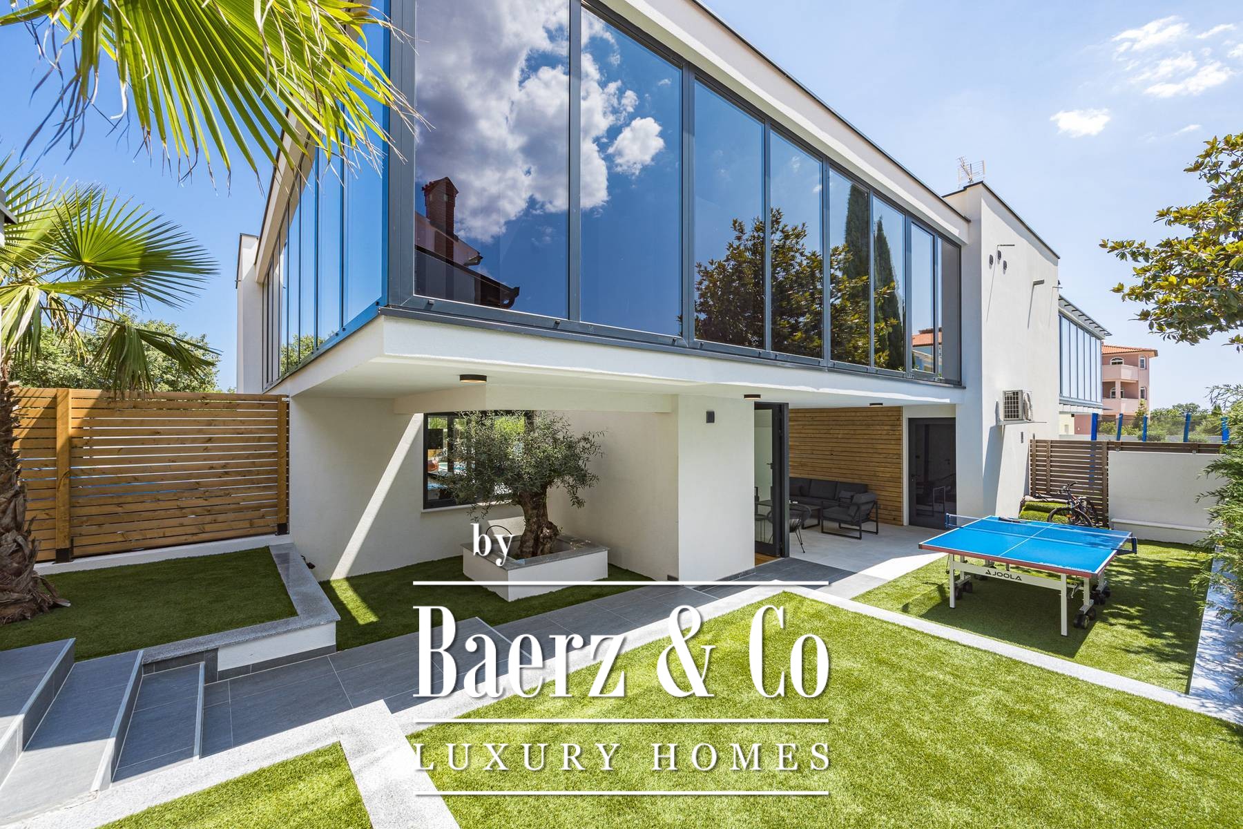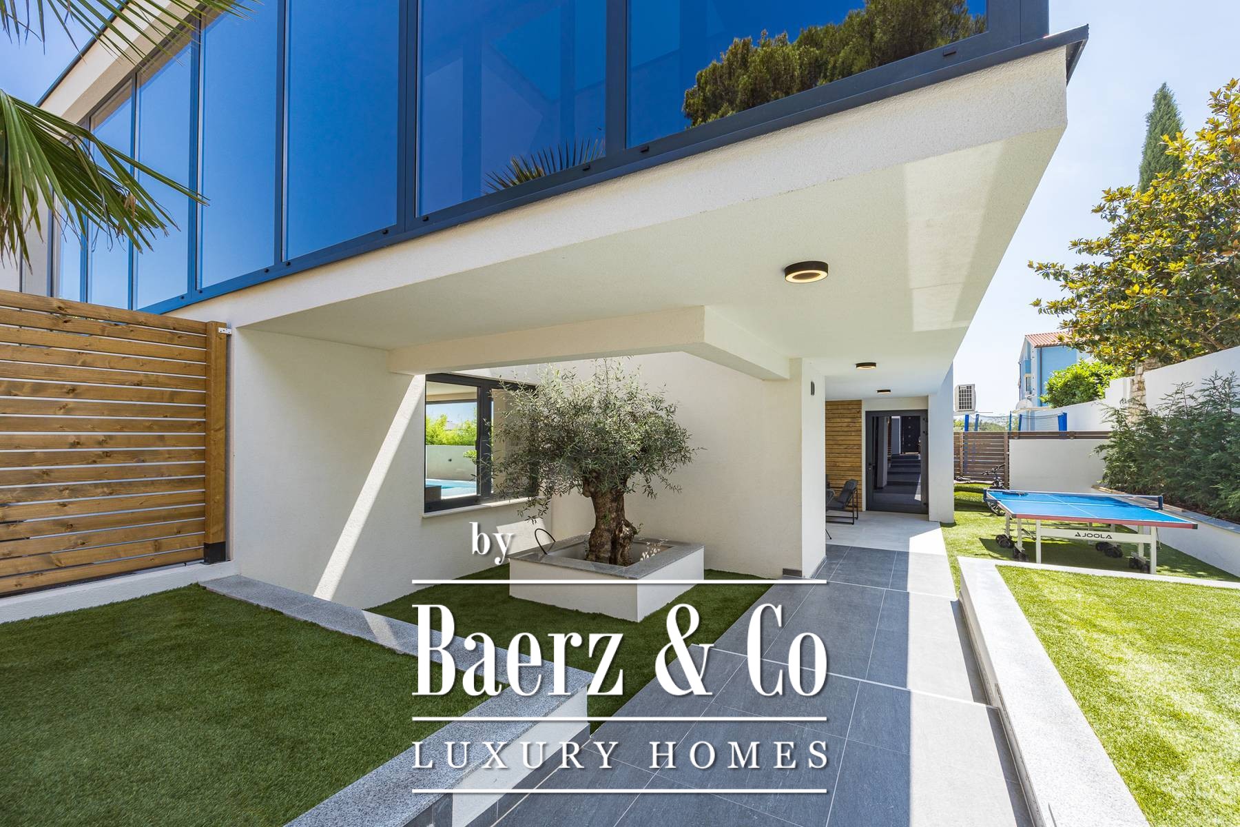In Medulin, one of the most attractive tourist destinations, there is this modern meticulously decorated semi-detached villa NKP 220 m2.The villa is located in a quiet part of Medulin. It extends over 500 m2 of garden and is spread over two floors.The ground floor is dominated by a large and bright living room, a beautiful electric fireplace, an aluminum sliding wall with access to the 40 m2 pool that can be used even during the winter.Modern Dan Kuhen kitchen fully equipped. An internal staircase leads to the first