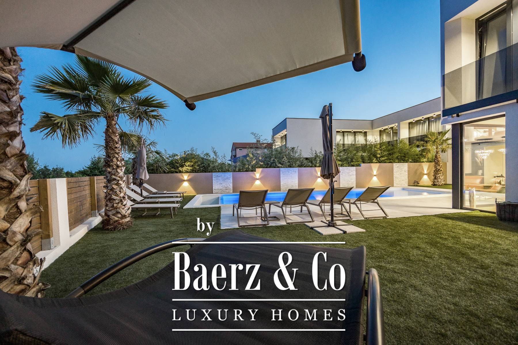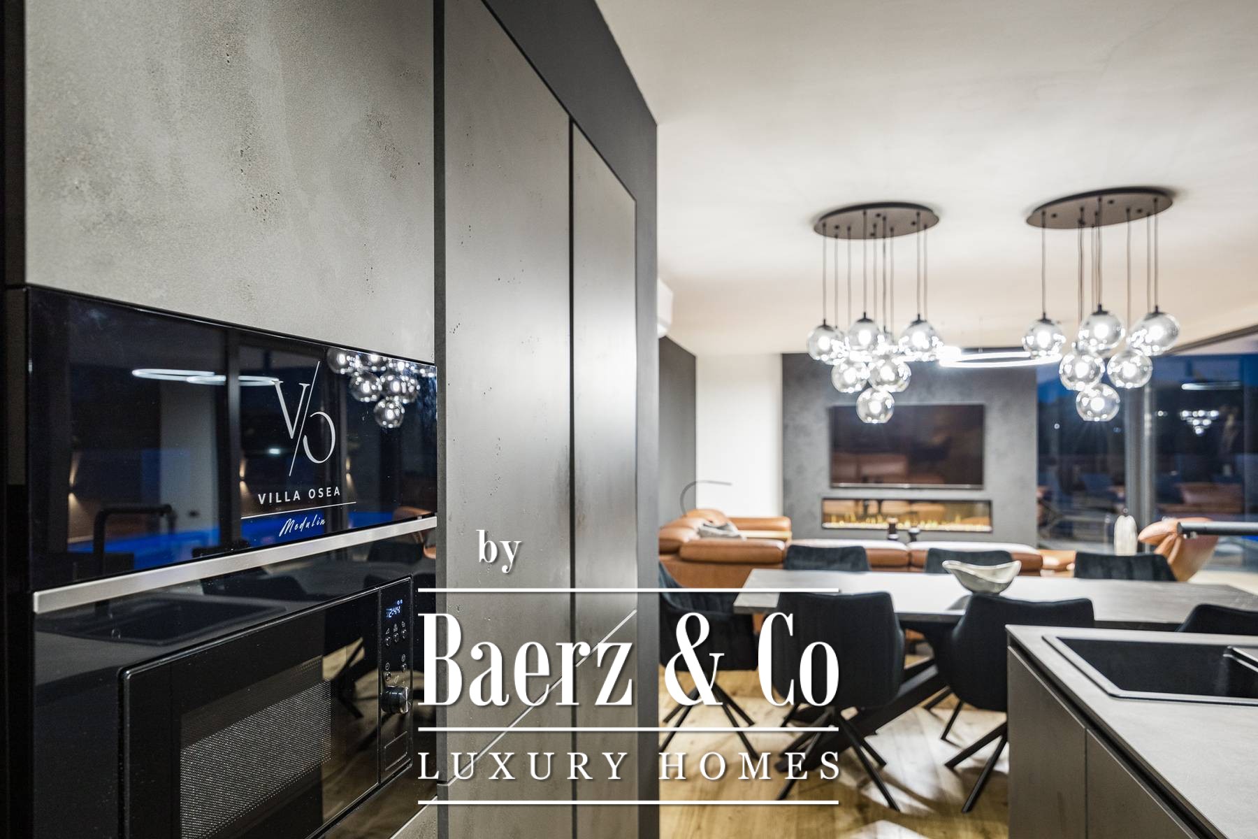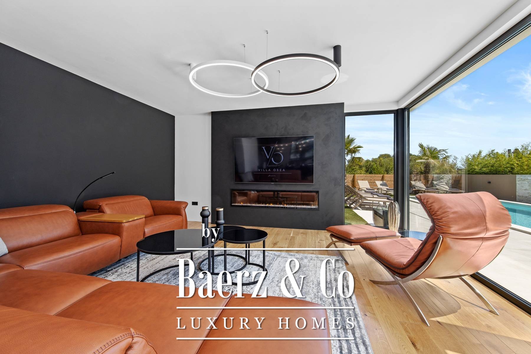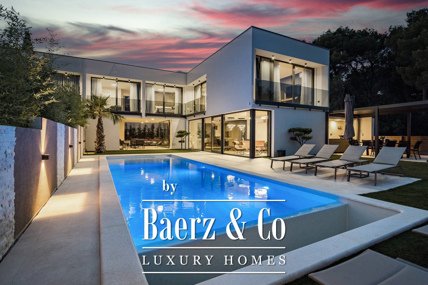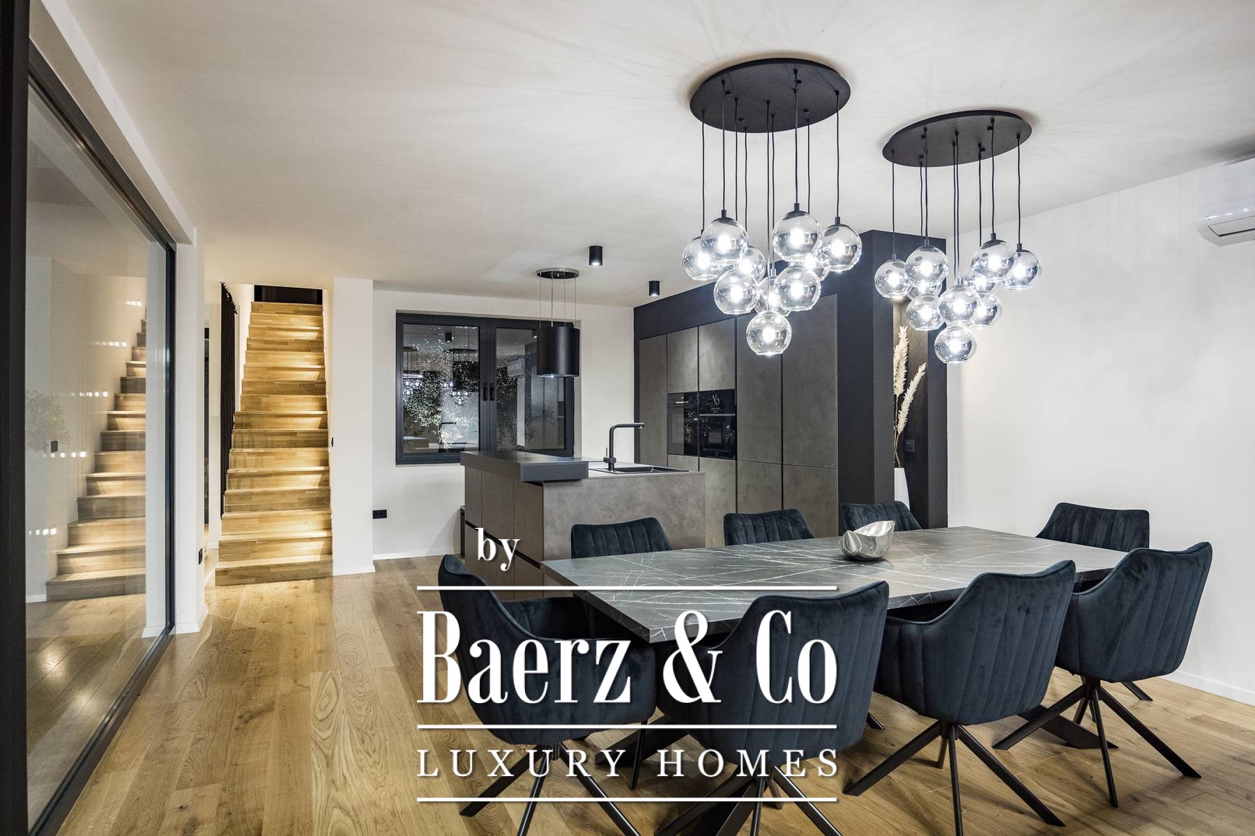 In Medulin, one of the most attractive tourist destinations, there is this modern meticulously decorated semi-detached villa NKP 220 m2.The villa is located in a quiet part of Medulin. It extends over 500 m2 of garden and is spread over two floors.The ground floor is dominated by a large and bright living room, a beautiful electric fireplace, an aluminum sliding wall with access to the 40 m2 pool that can be used even during the winter.Modern Dan Kuhen kitchen fully equipped. An internal staircase leads to the first