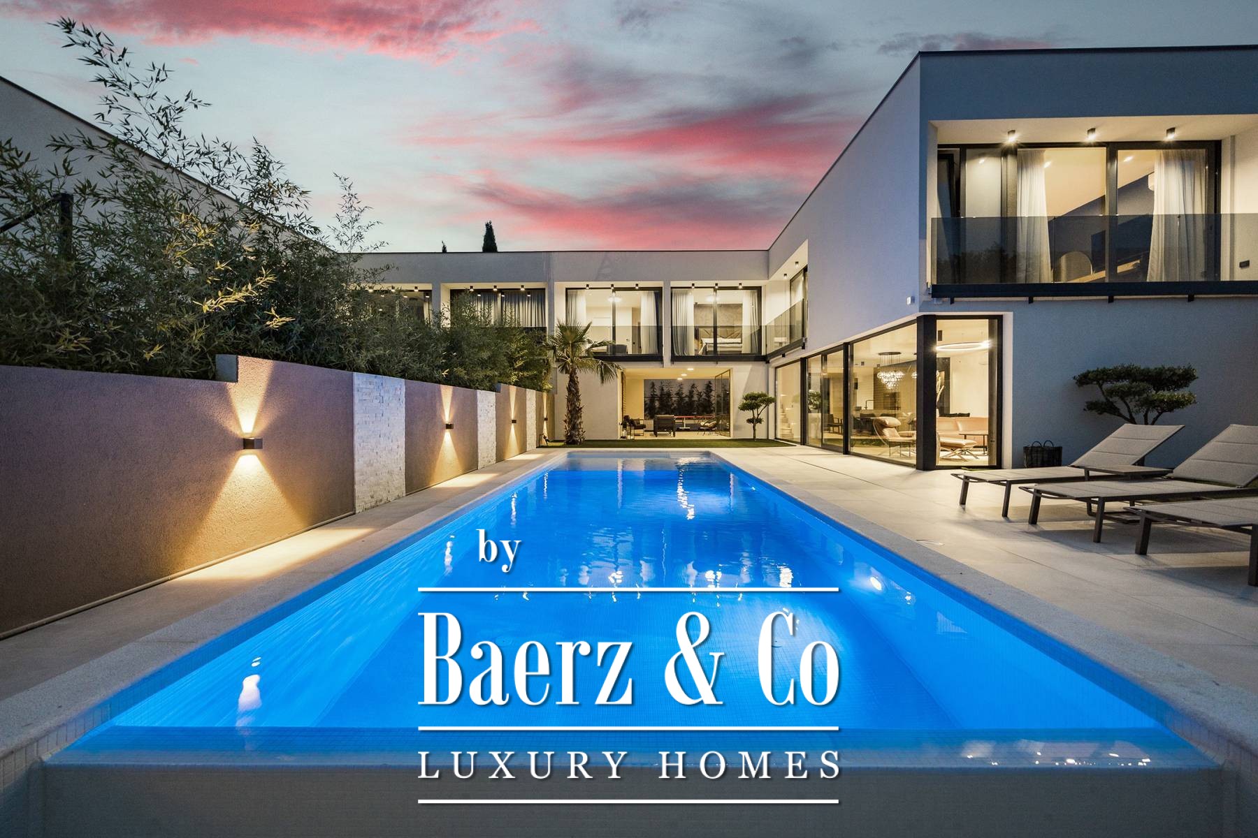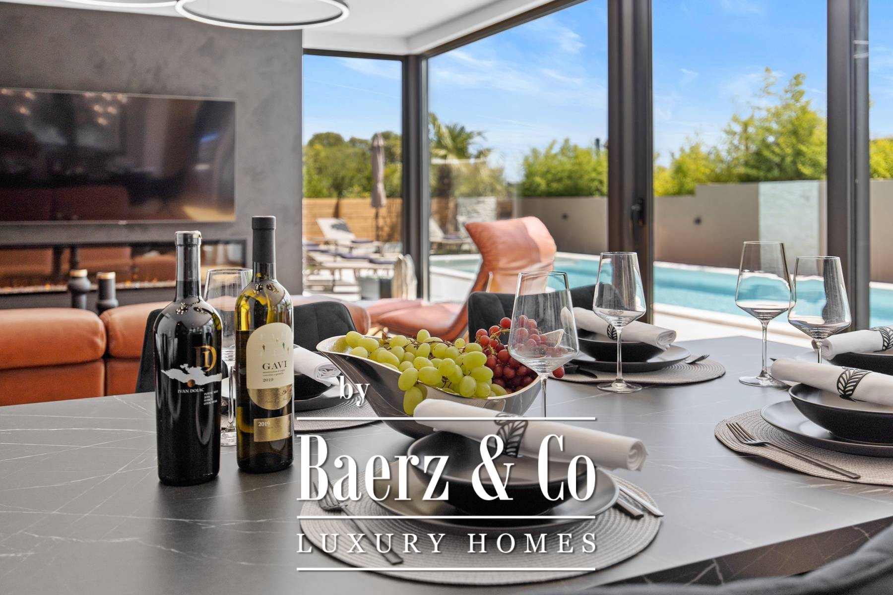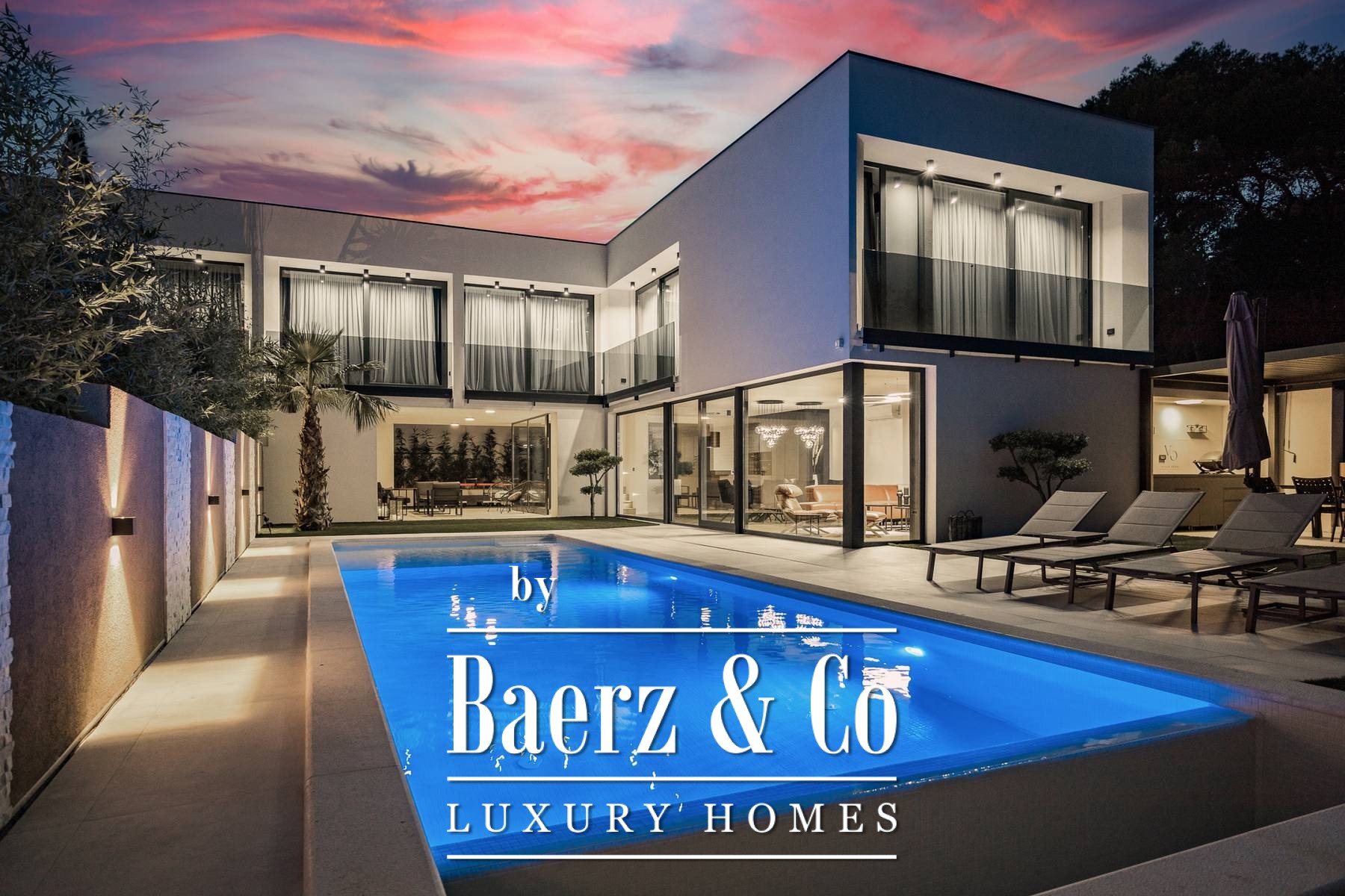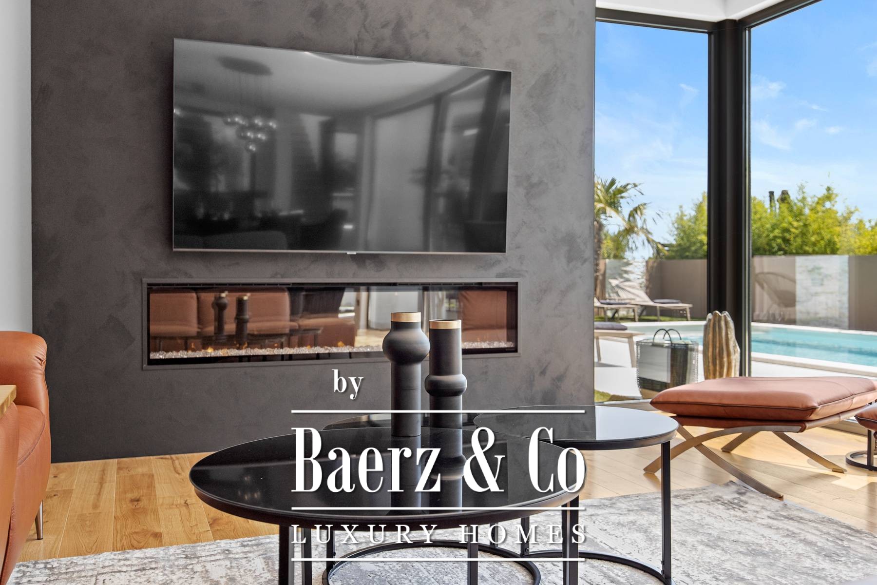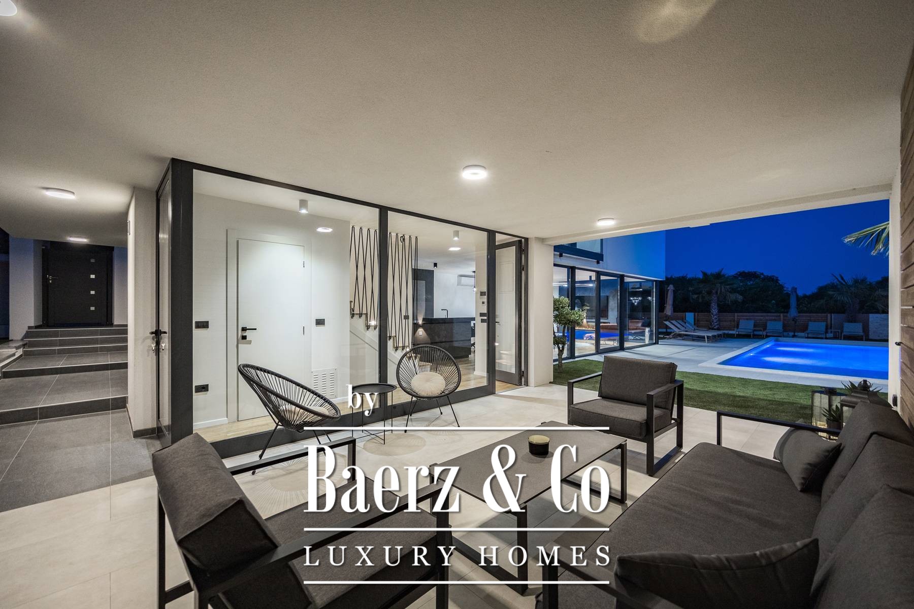 In Medulin, one of the most attractive tourist destinations, there is this modern meticulously decorated semi-detached villa NKP 220 m2.The villa is located in a quiet part of Medulin. It extends over 500 m2 of garden and is spread over two floors.The ground floor is dominated by a large and bright living room, a beautiful electric fireplace, an aluminum sliding wall with access to the 40 m2 pool that can be used even during the winter.Modern Dan Kuhen kitchen fully equipped. An internal staircase leads to the first
