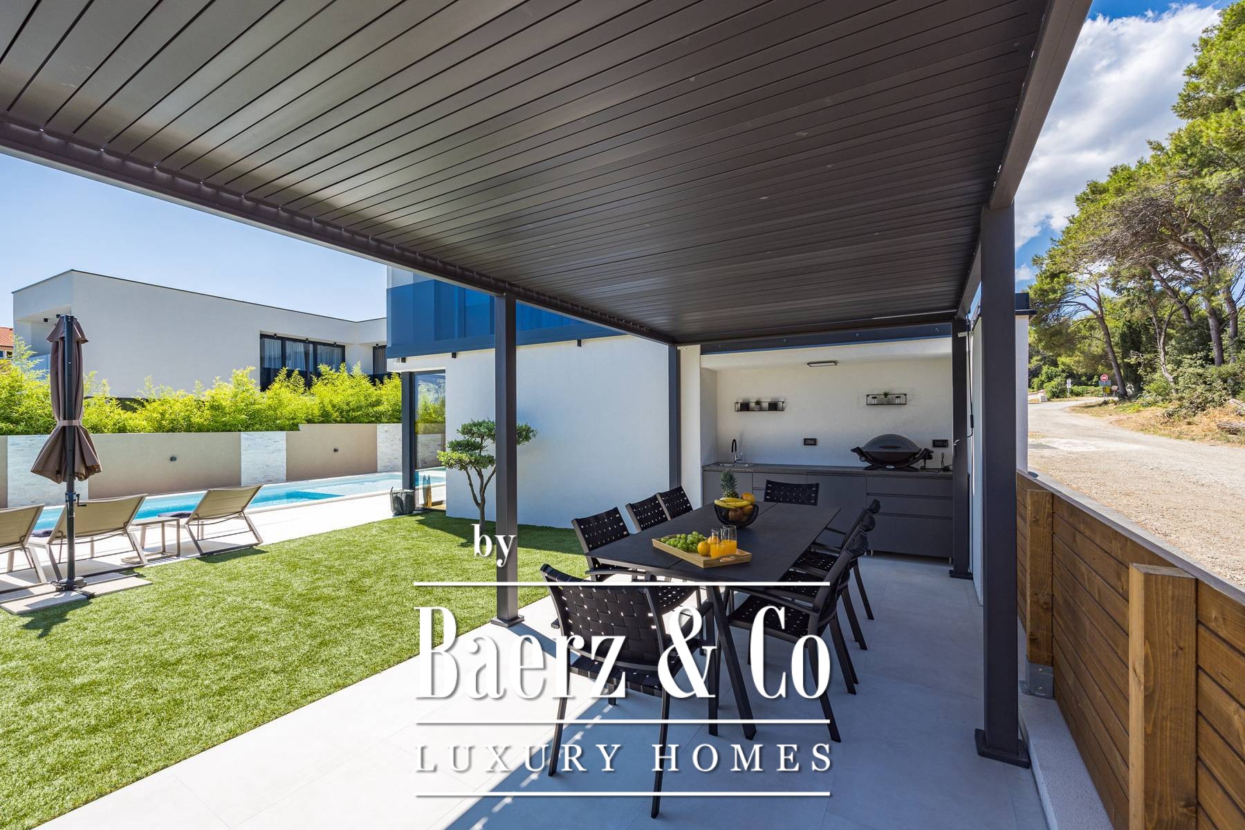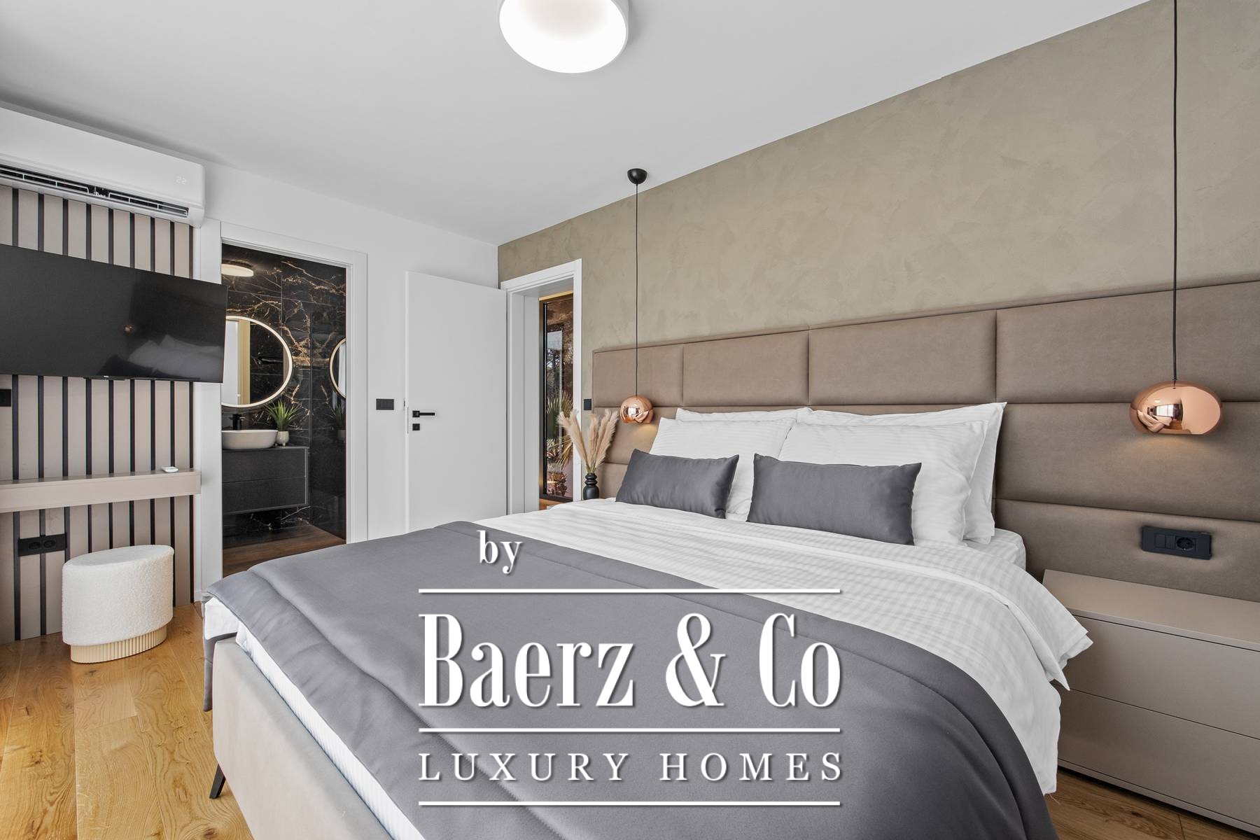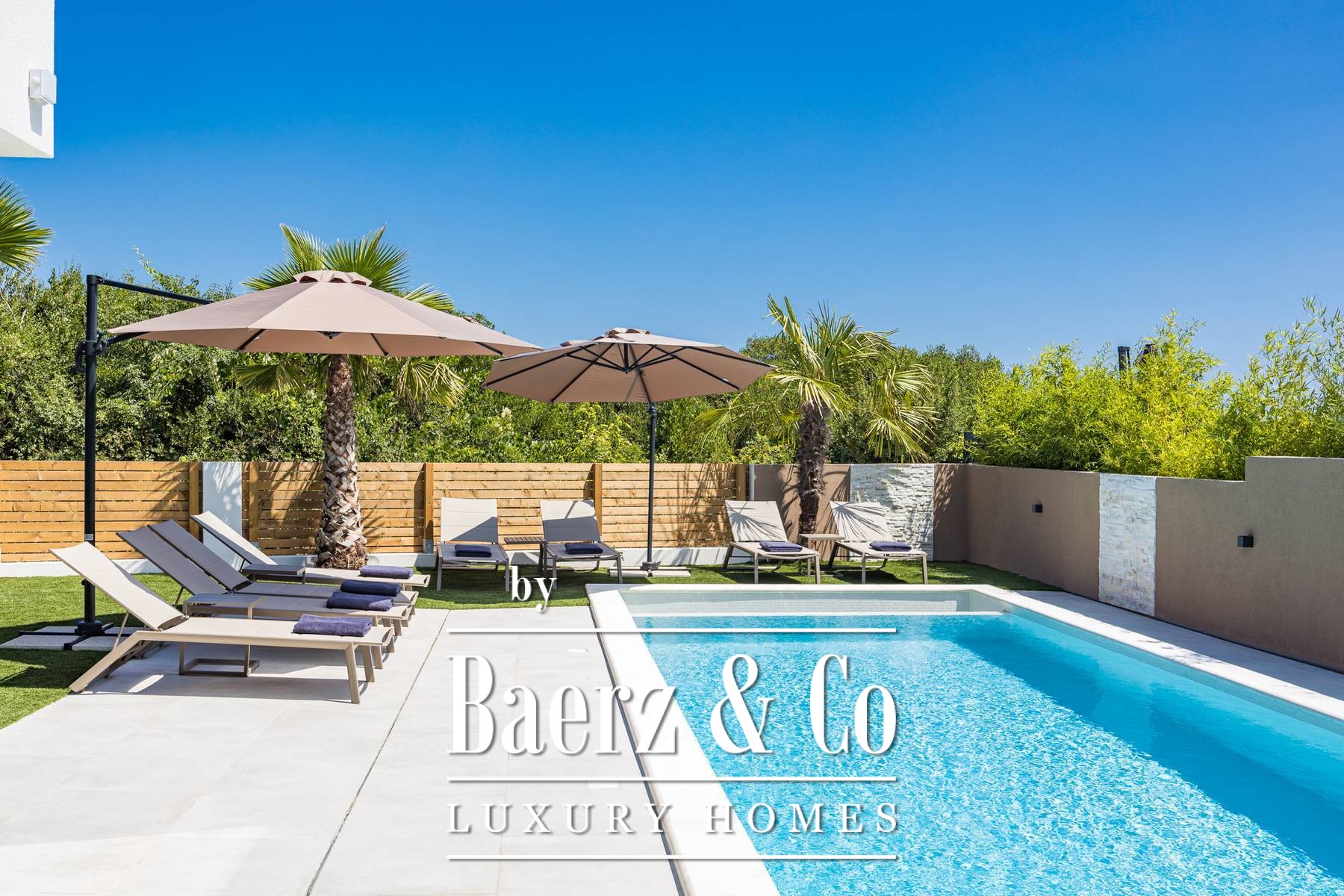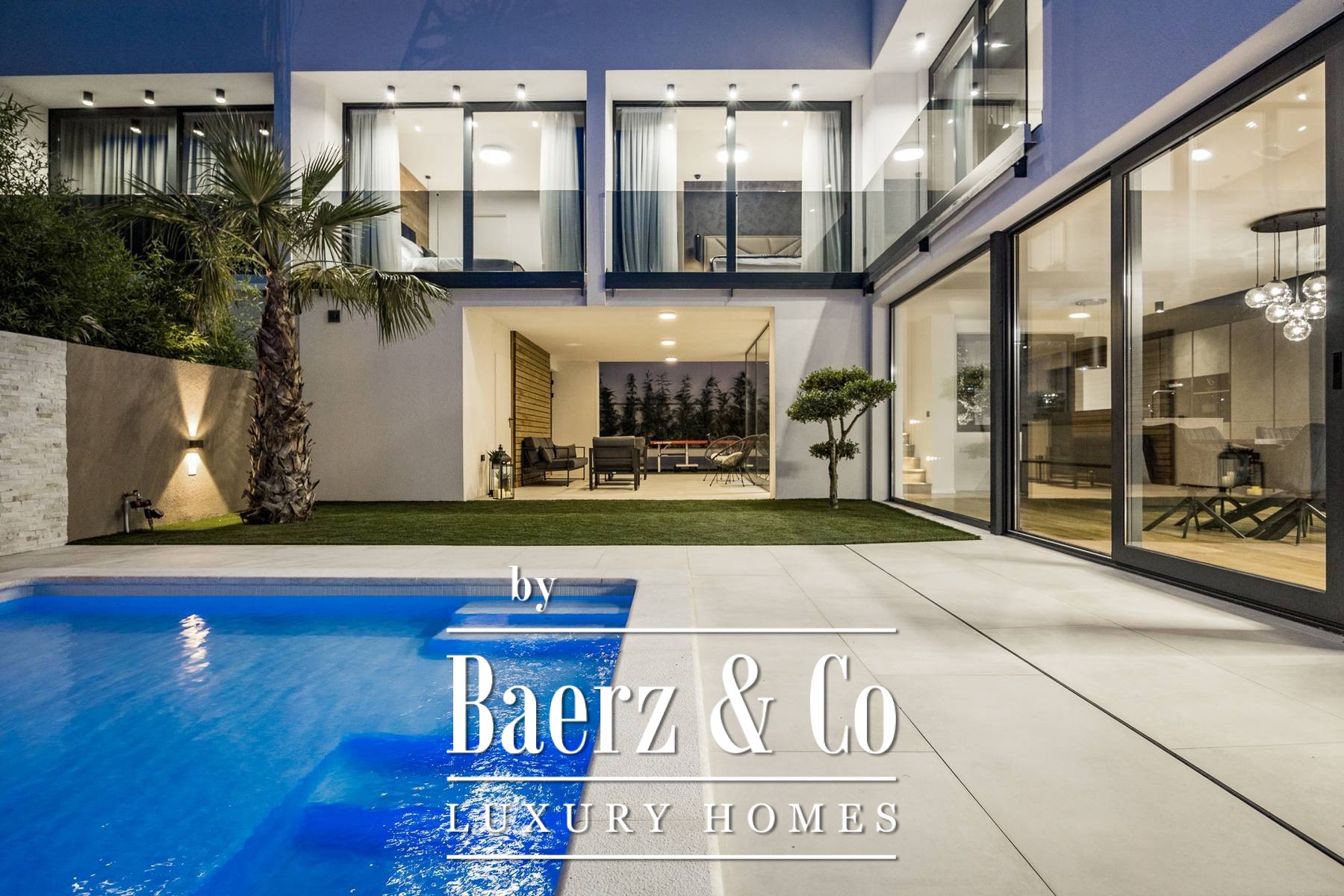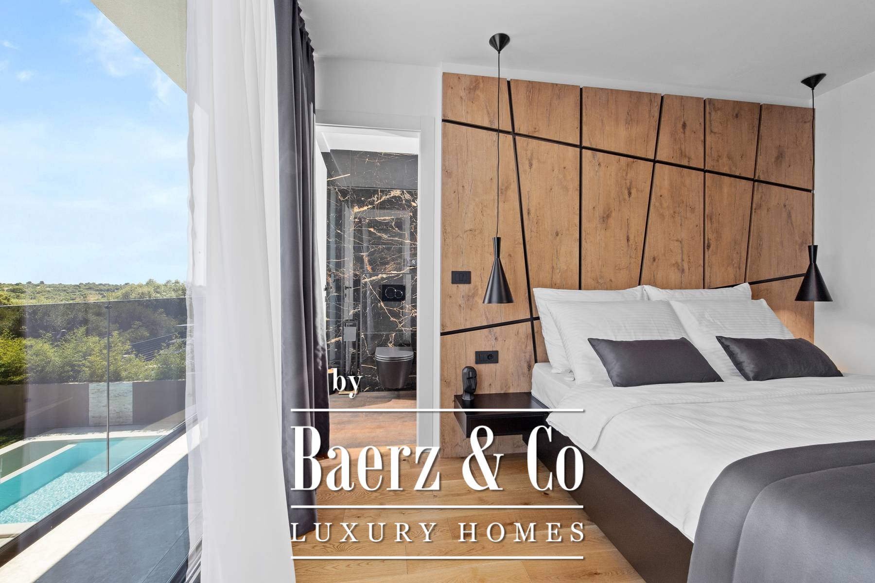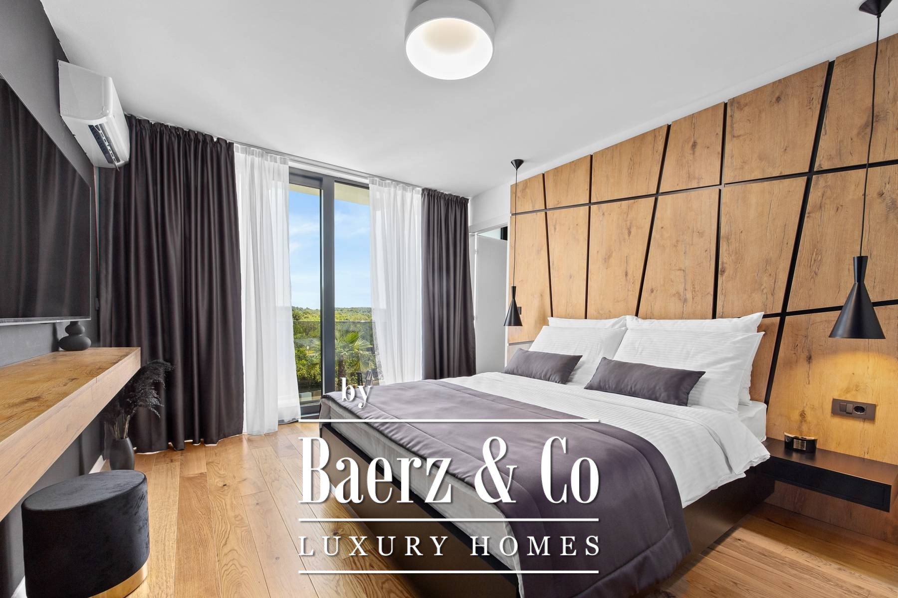 In Medulin, one of the most attractive tourist destinations, there is this modern meticulously decorated semi-detached villa NKP 220 m2.The villa is located in a quiet part of Medulin. It extends over 500 m2 of garden and is spread over two floors.The ground floor is dominated by a large and bright living room, a beautiful electric fireplace, an aluminum sliding wall with access to the 40 m2 pool that can be used even during the winter.Modern Dan Kuhen kitchen fully equipped. An internal staircase leads to the first